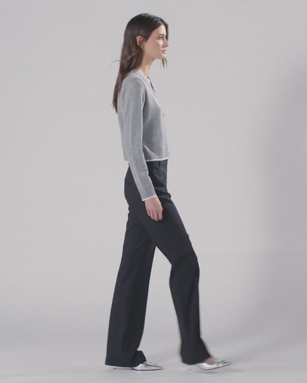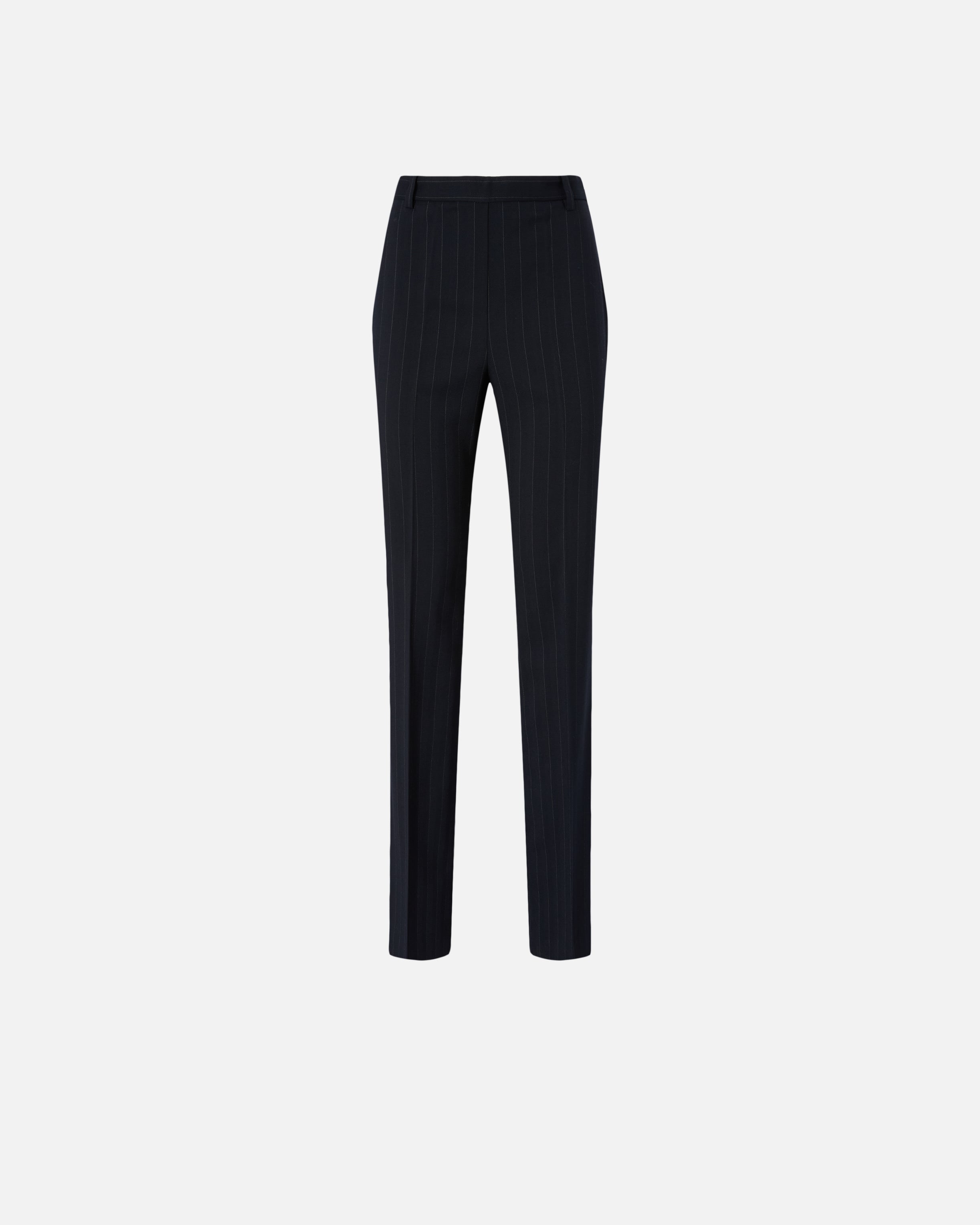 Pantalones de pernera recta con cierre frontal oculto. El modelo está confeccionado en un tejido clásico de lana y poliéster con rayas diplomáticas caracterizado por un cambio en la técnica de tejido y en la luz que destaca el diseño del material. El diseño sastre de la prenda se evidencia aún más por las pinzas, por la cintura con trabillas para el cinturón y por el bolsillito de ribete en la parte trasera. Combina los pantalones con el blazer del mismo tejido para conseguir un efecto de traje o ponte una camisa para un look no demasiado formal.