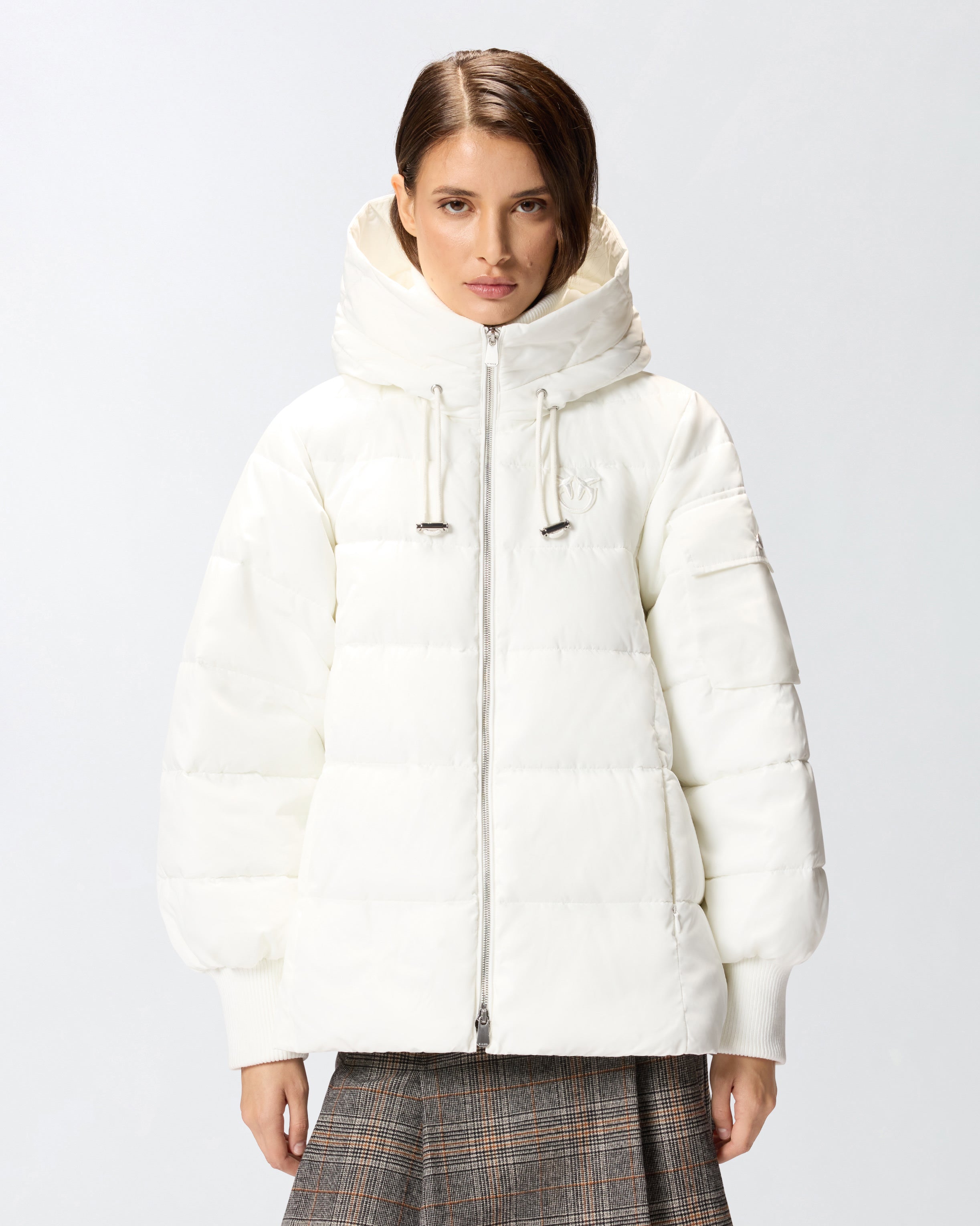 Plumífero corto acolchado en tela técnica con un diseño ligeramente acampanado. El modelo se distingue por el estilo deportivo que le otorga el acabado mate del tejido y por los elementos funcionales, como los bolsillos con cremallera invisible, el tejido de punto acanalado en el cuello alto y los puños, y la amplia capucha ajustable con cordón de inspiración trekking, que cuenta con visera para protegerte de la lluvia. El parche con logotipo Love Birds de efecto engomado en la parte delantera izquierda personaliza el abrigo al más puro estilo PINKO. Cierre con cremallera metálica de doble tirador en la parte delantera. Modelo forrado.