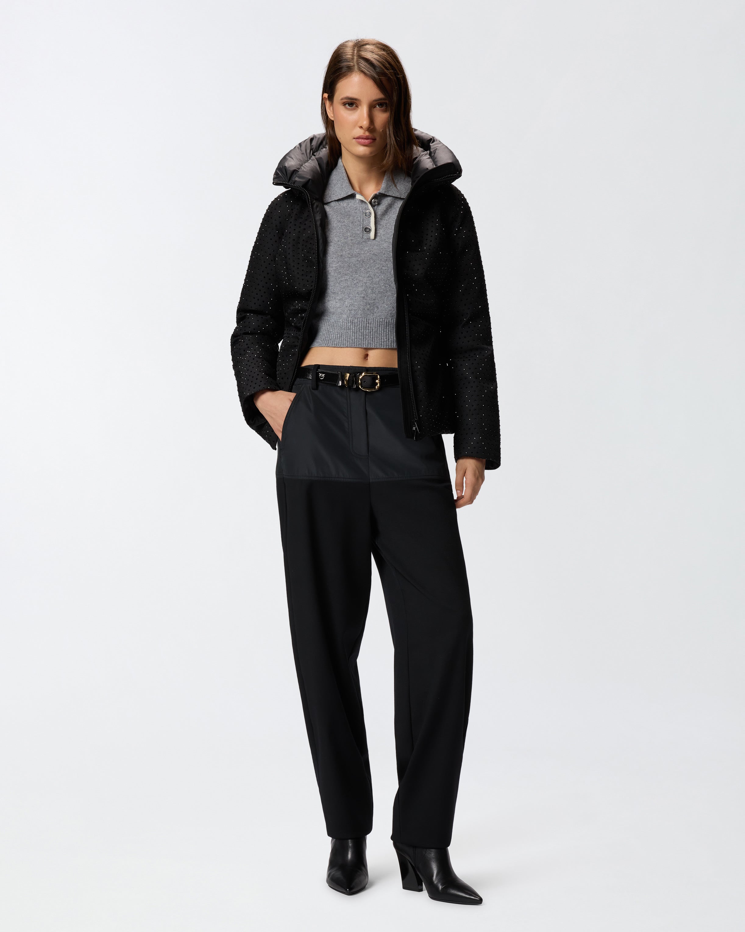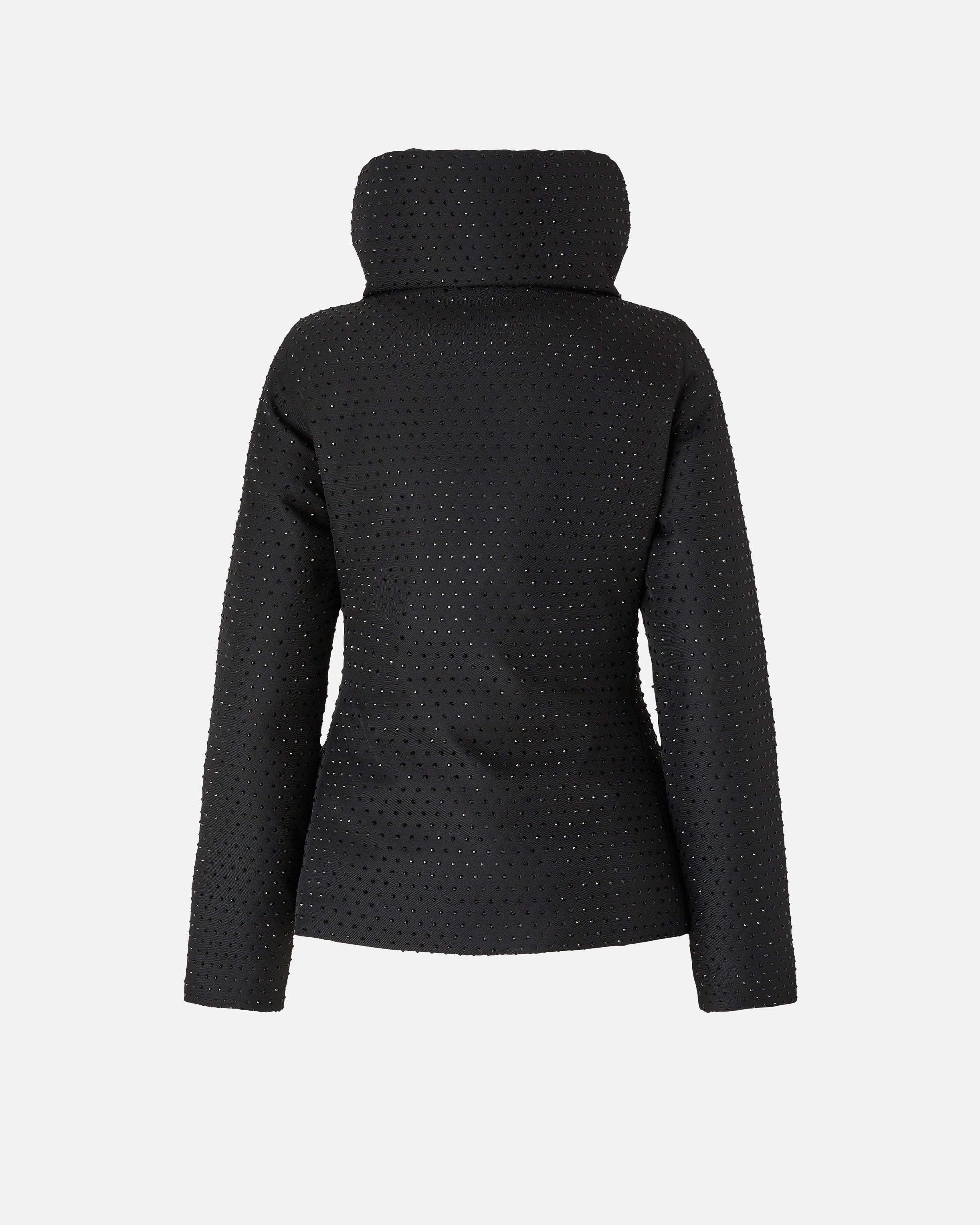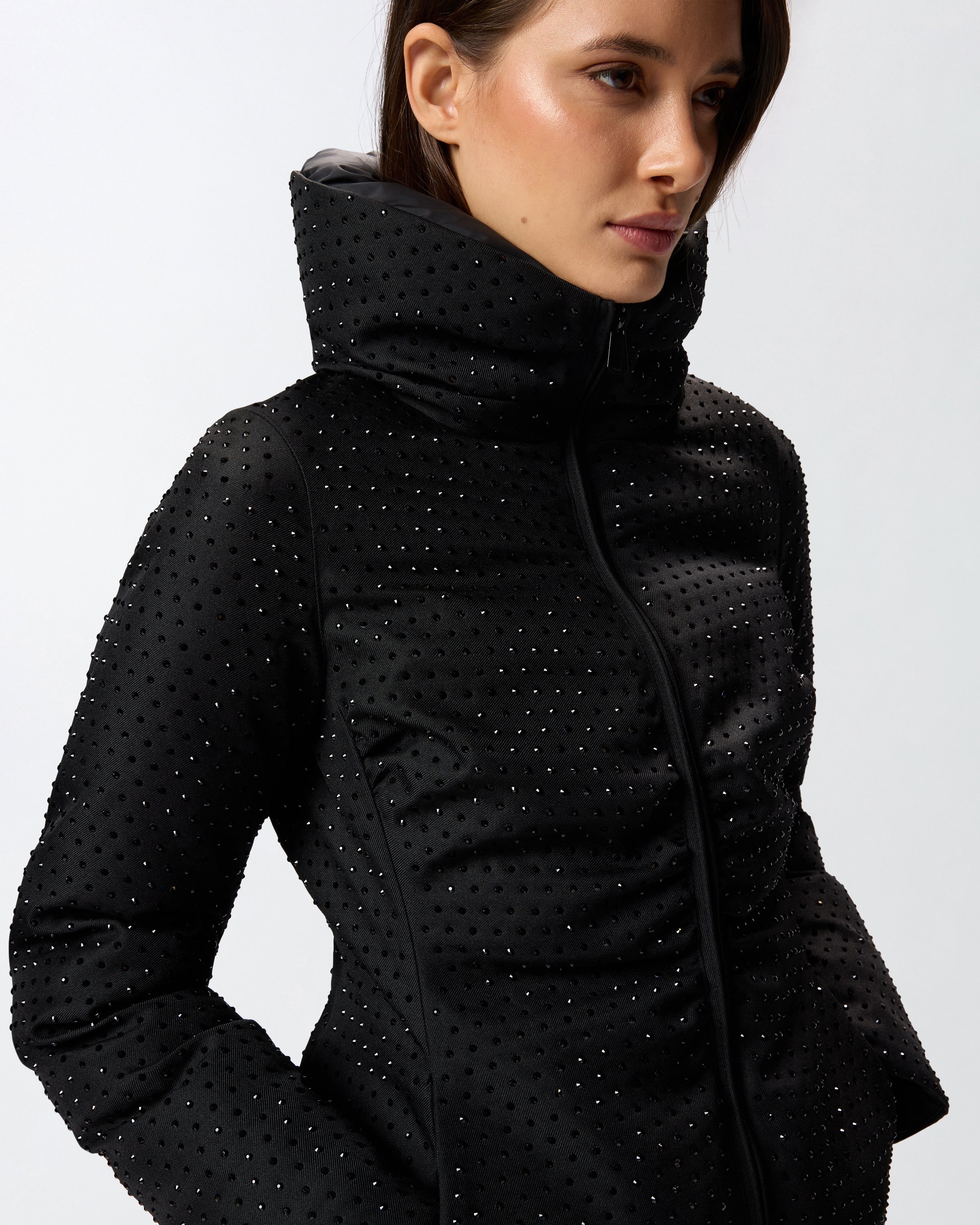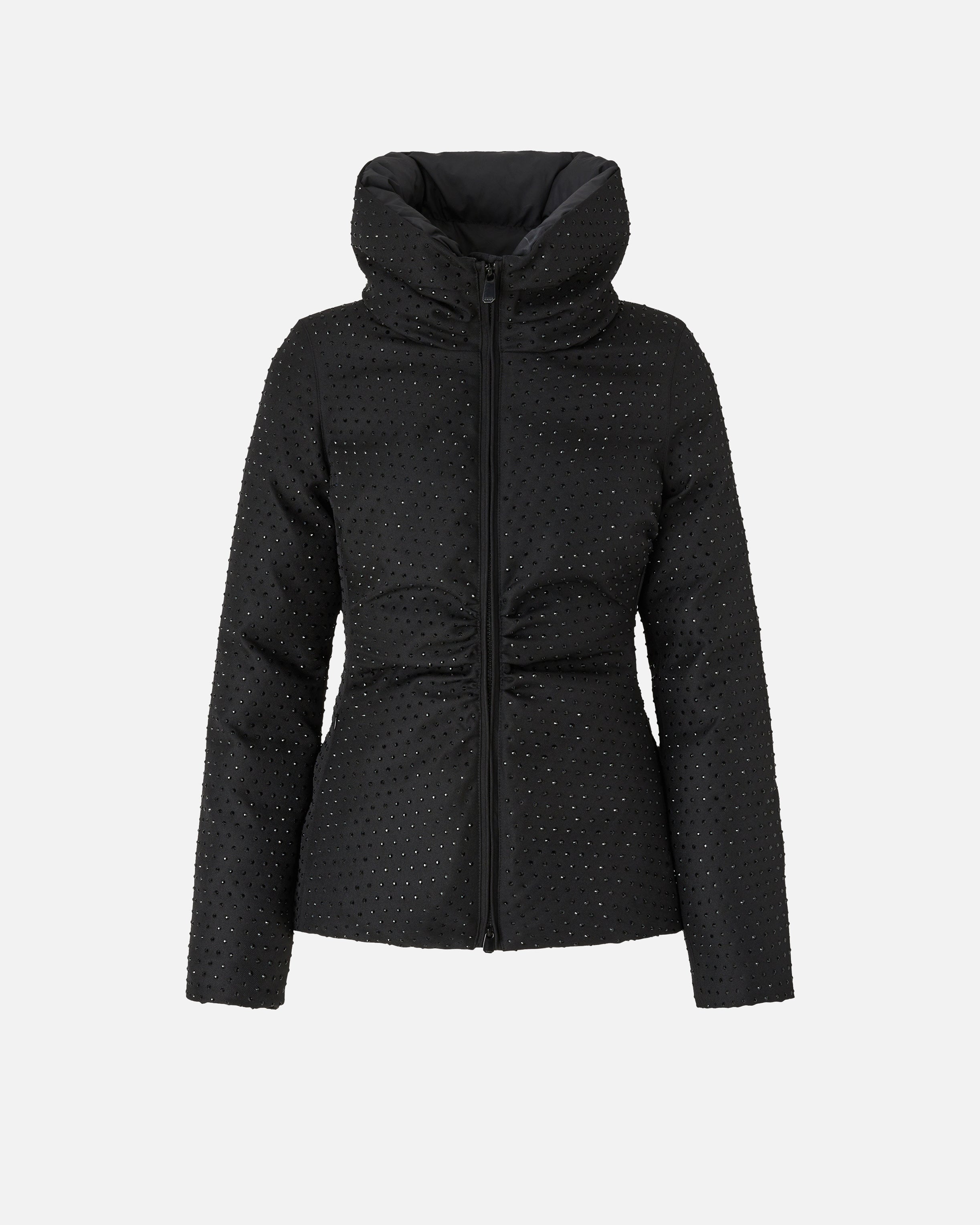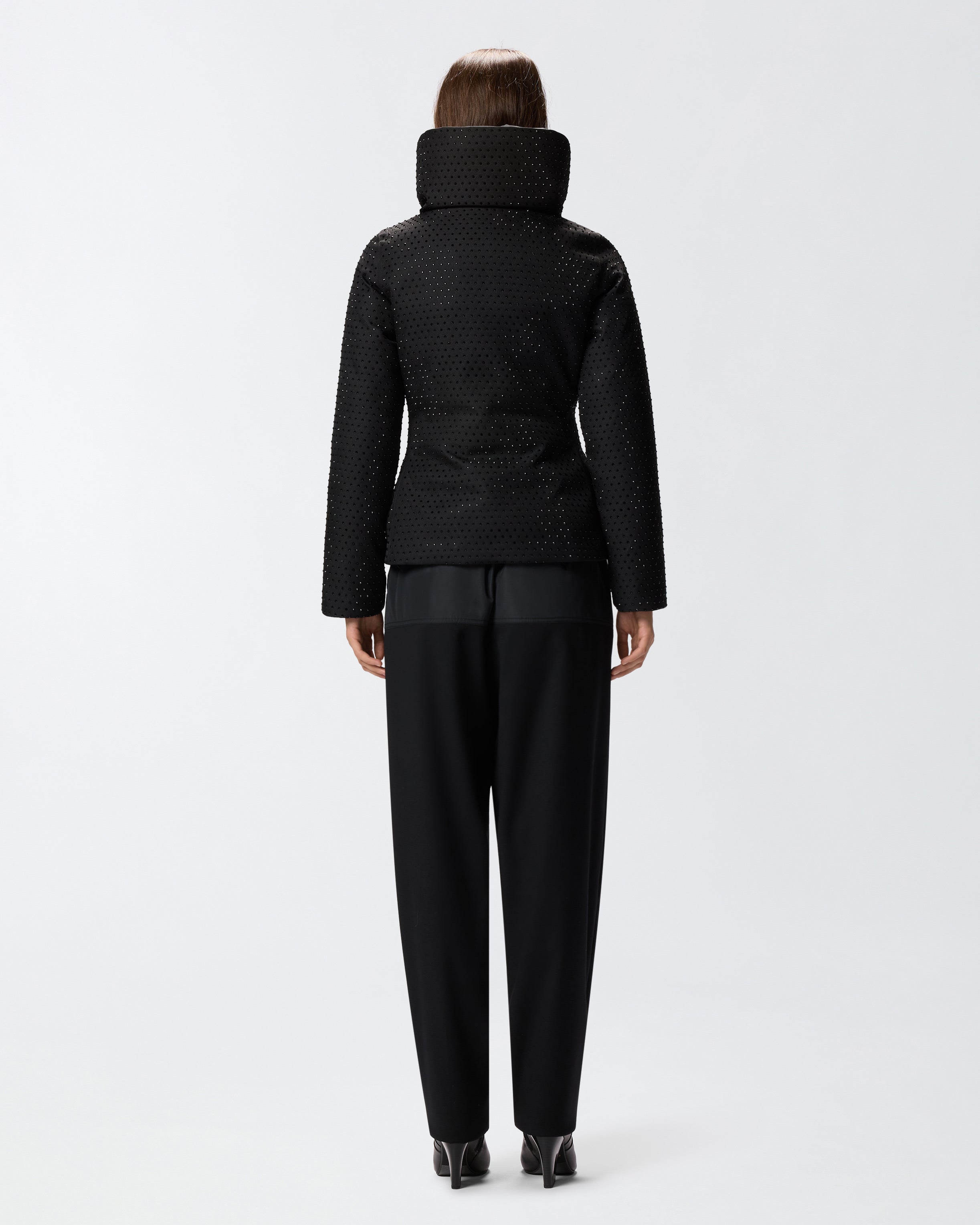Plumífero corto con envolvente cuello alto, bolsillos laterales y cremallera a todo lo largo con doble cursor. La practicidad del diseño se une a la estética femenina y preciosa de los fruncidos y del motivo con minipedrería en toda la superficie del modelo, elemento distintivo del ADN PINKO. Una prenda ideal para afrontar los primeros fríos con un toque de estilo que no renuncia a la comodidad.