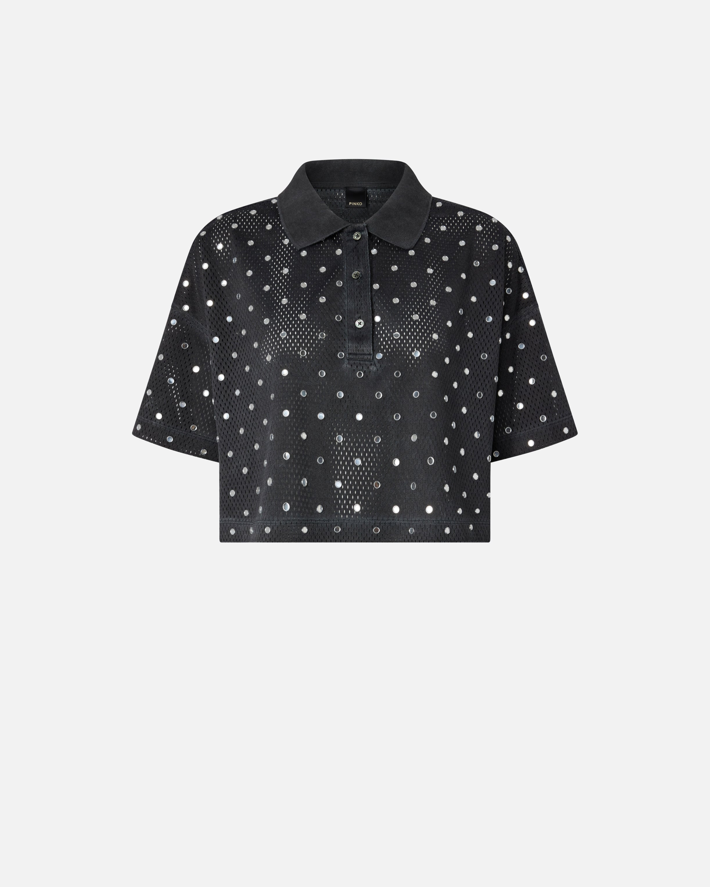 Polo de corte corto confeccionado en punto con un acabado con efecto ligeramente descolorido. El modelo se caracteriza por un tejido de malla inspirado en el baloncesto y está adornado con un motivo integral de detalles espejados circulares. Ponte esta prenda con tus vaqueros favoritos o con los pantalones a juego para crear un look coordinado y lucir un estilo contemporáneo que no compromete la feminidad.