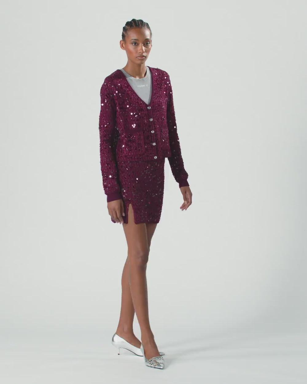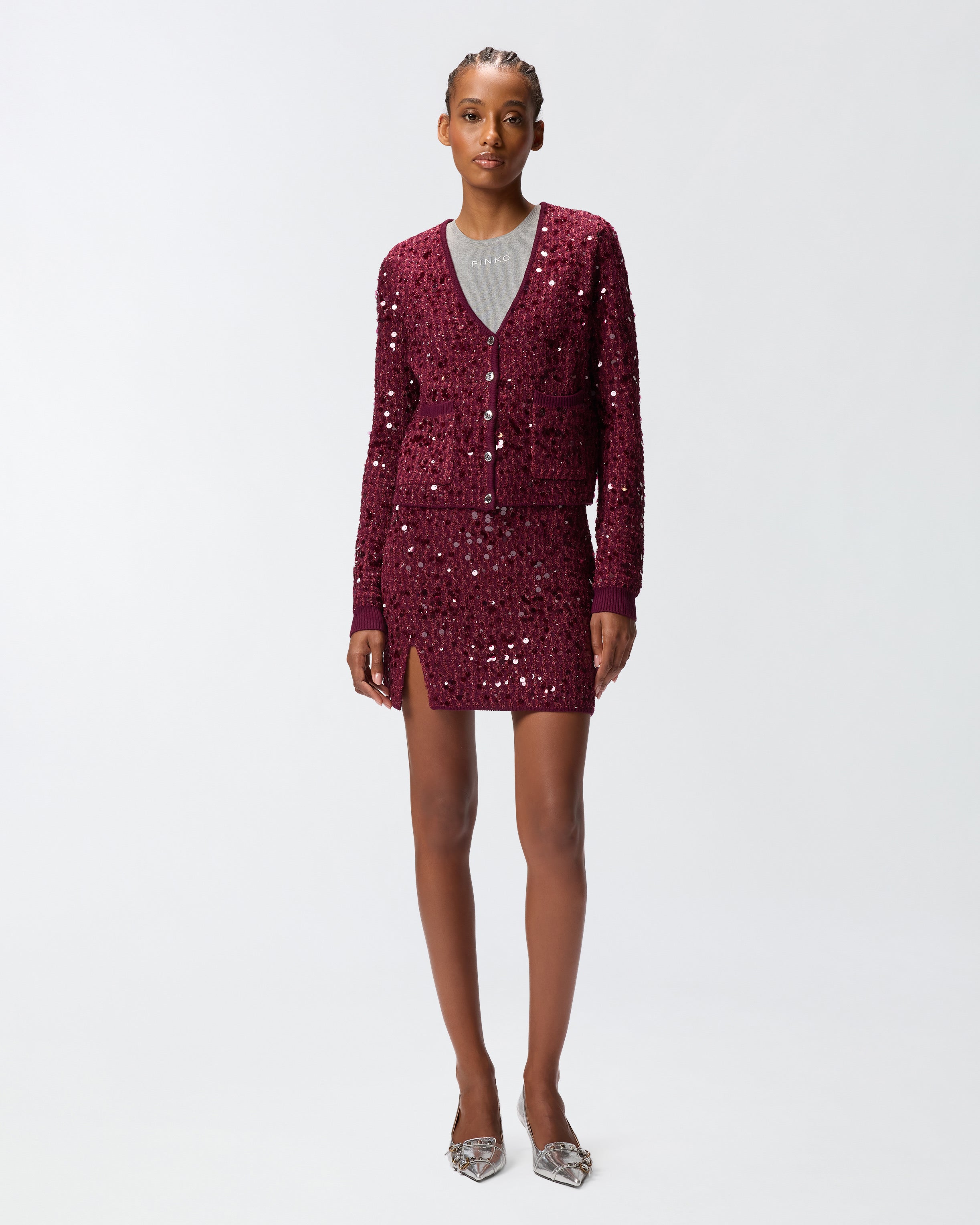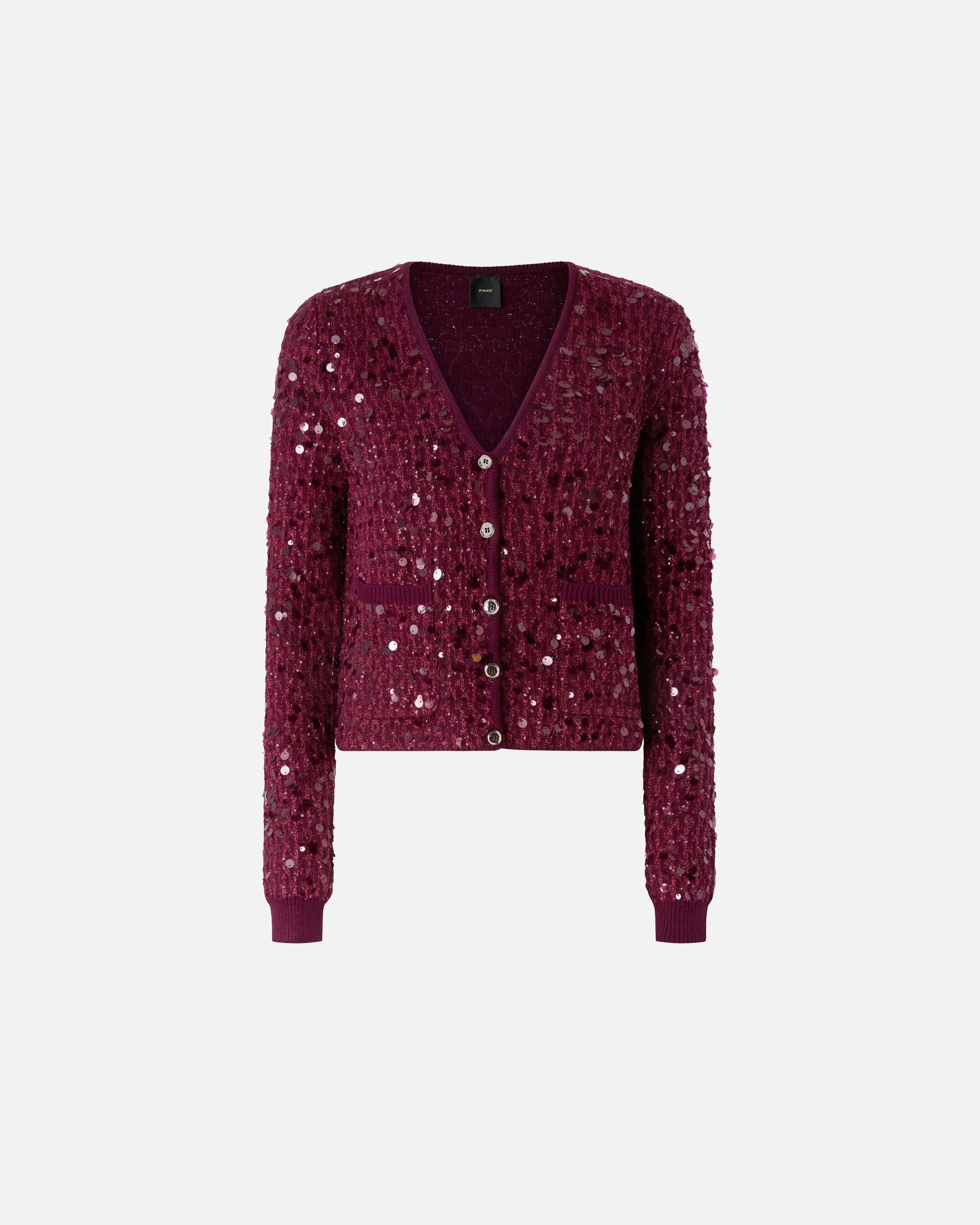 Cárdigan con escote de pico y botonadura frontal confeccionado en tejido de viscosa que aporta un efecto compacto y suave a la vez. Las innumerables lentejuelas, auténticas protagonistas del modelo, revisten todo el diseño: el resultado final es un look deslumbrante, femenino y funcional. La prenda se ha sometido a pruebas de acabado para minimizar la posible formación de bolitas, garantizando una mayor suavidad y durabilidad del tejido.