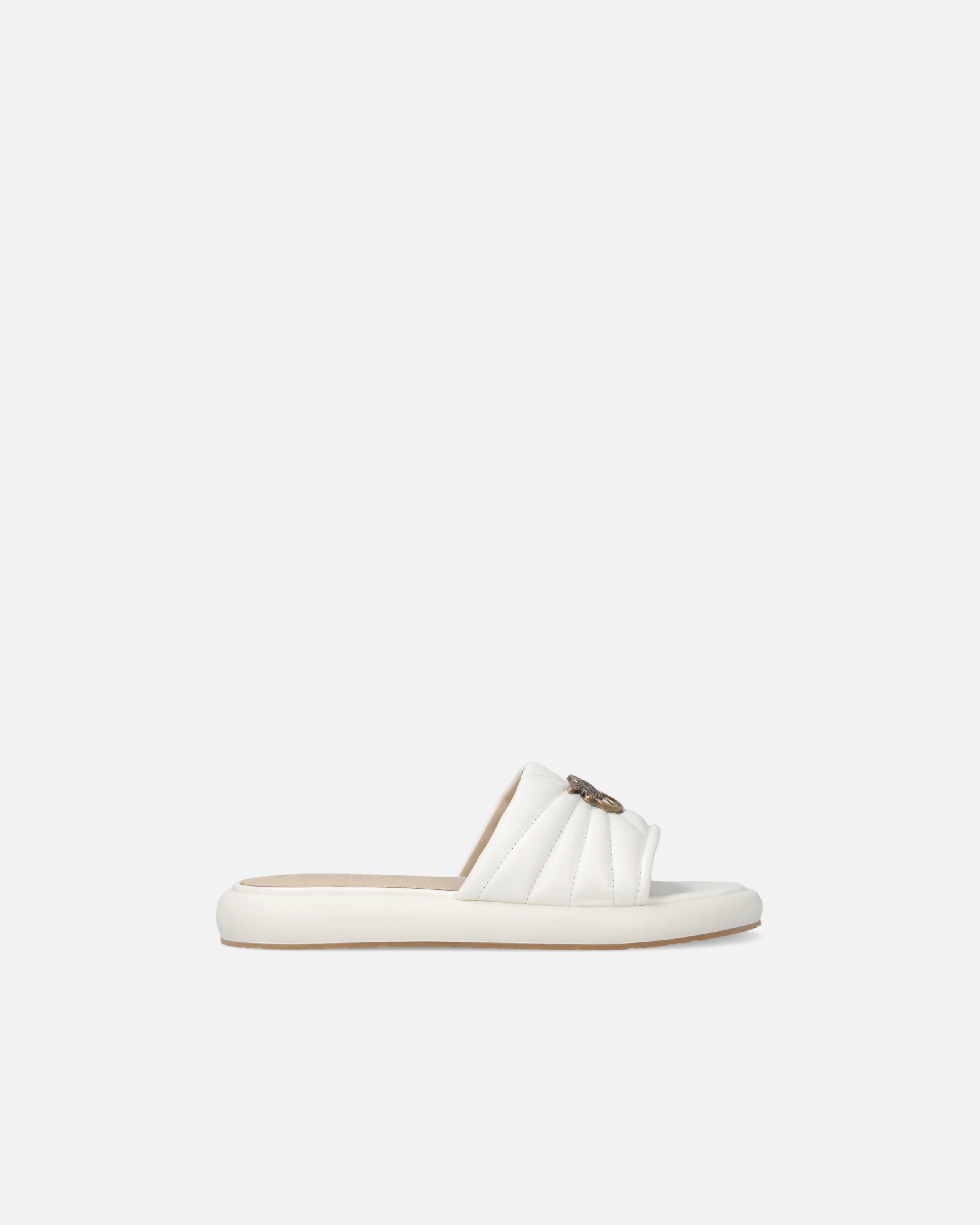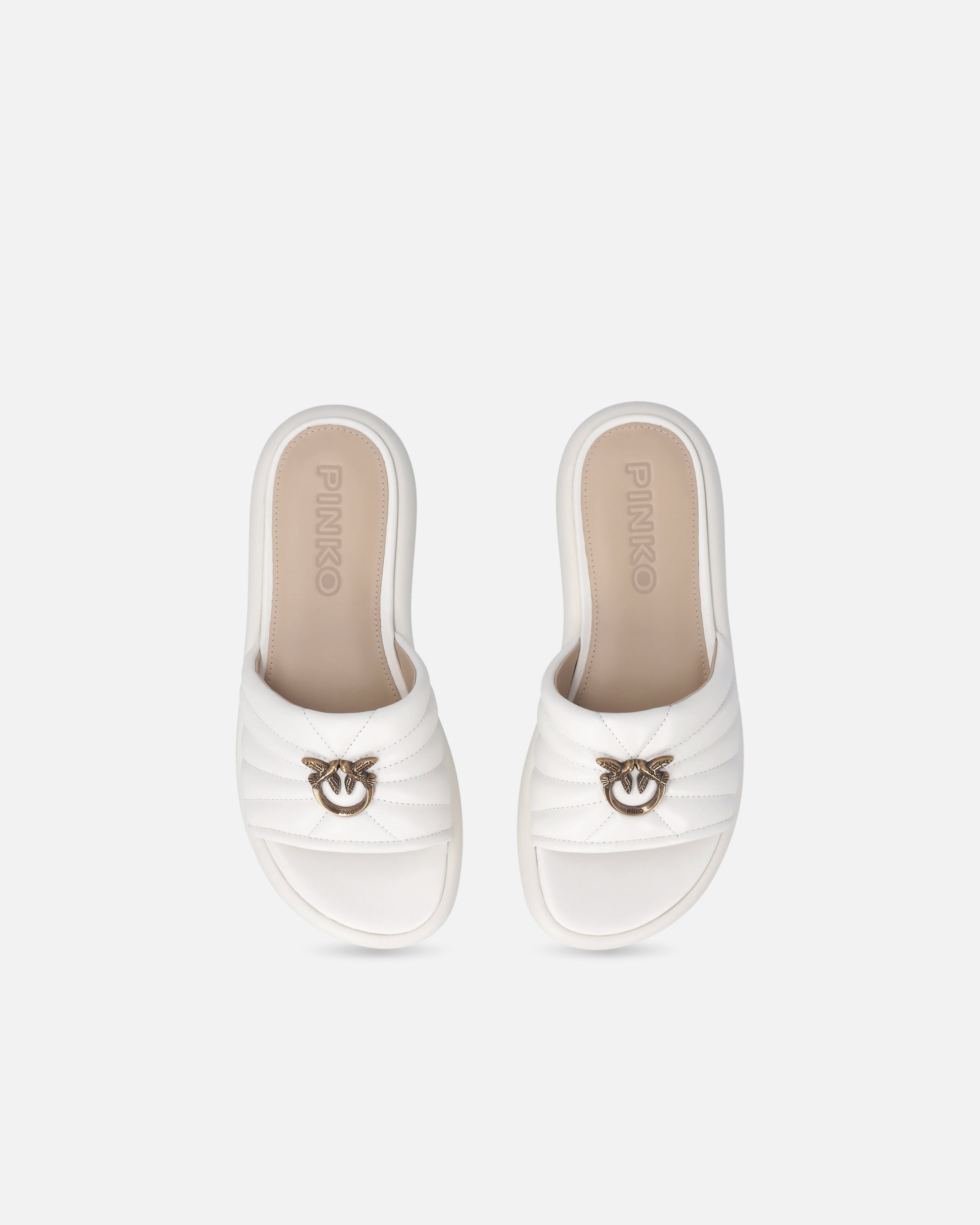Sandalias tipo chancla confeccionadas en suave napa y caracterizadas por una gruesa banda superior acolchada y pespunteada con una plaquita metálica en el centro que representa el icónico logotipo Love Birds Diamond Cut, emblema del ADN PINKO. El diseño presenta una suela de goma ergonómica con un perfil grueso pero armonioso y se completa con una plantilla de piel para que sea aún más cómoda de llevar. Reinterpretando el clásico slipper en una versión urbana y contemporánea, el modelo también es perfecto para completar tus looks de ciudad. - FIONA 03