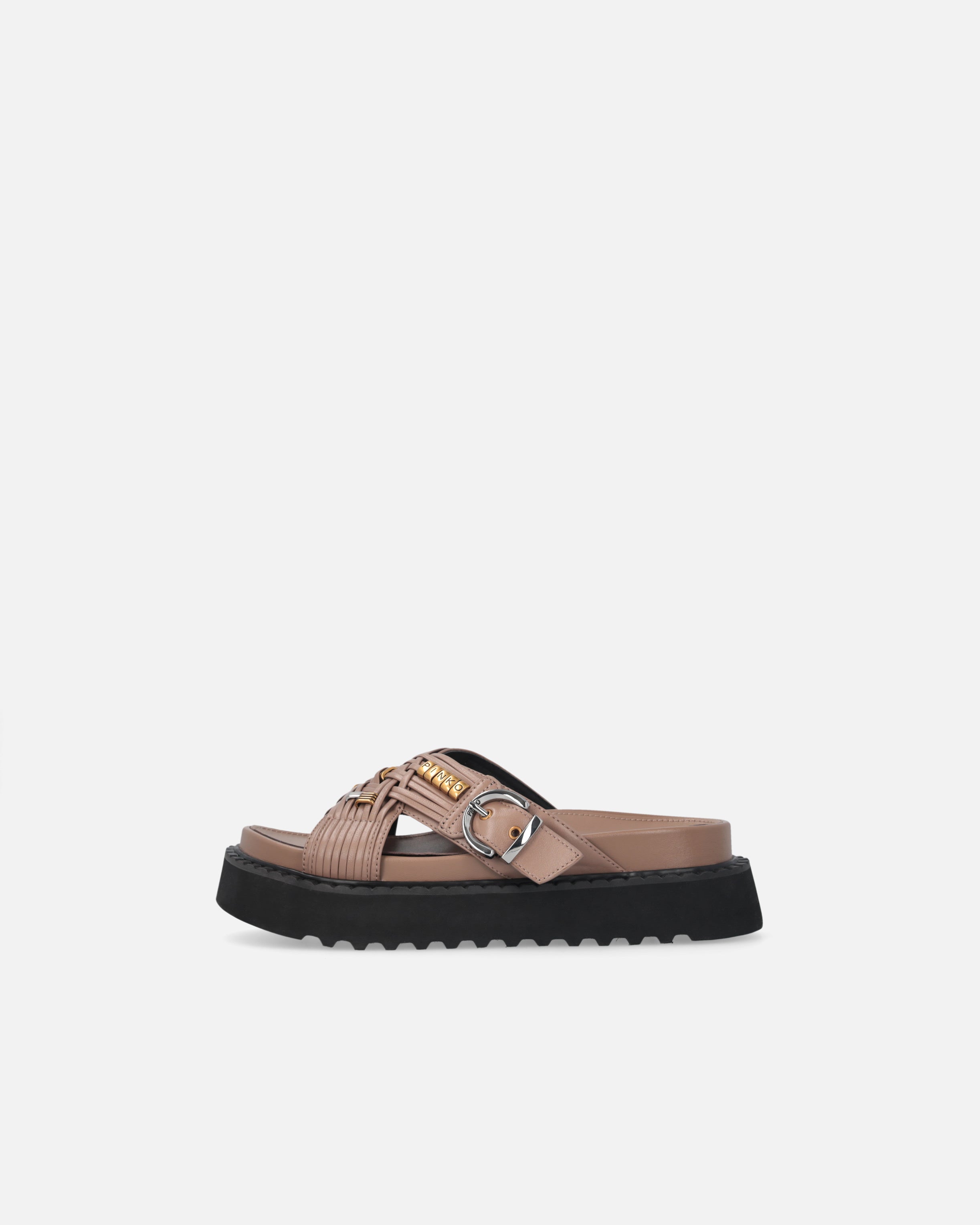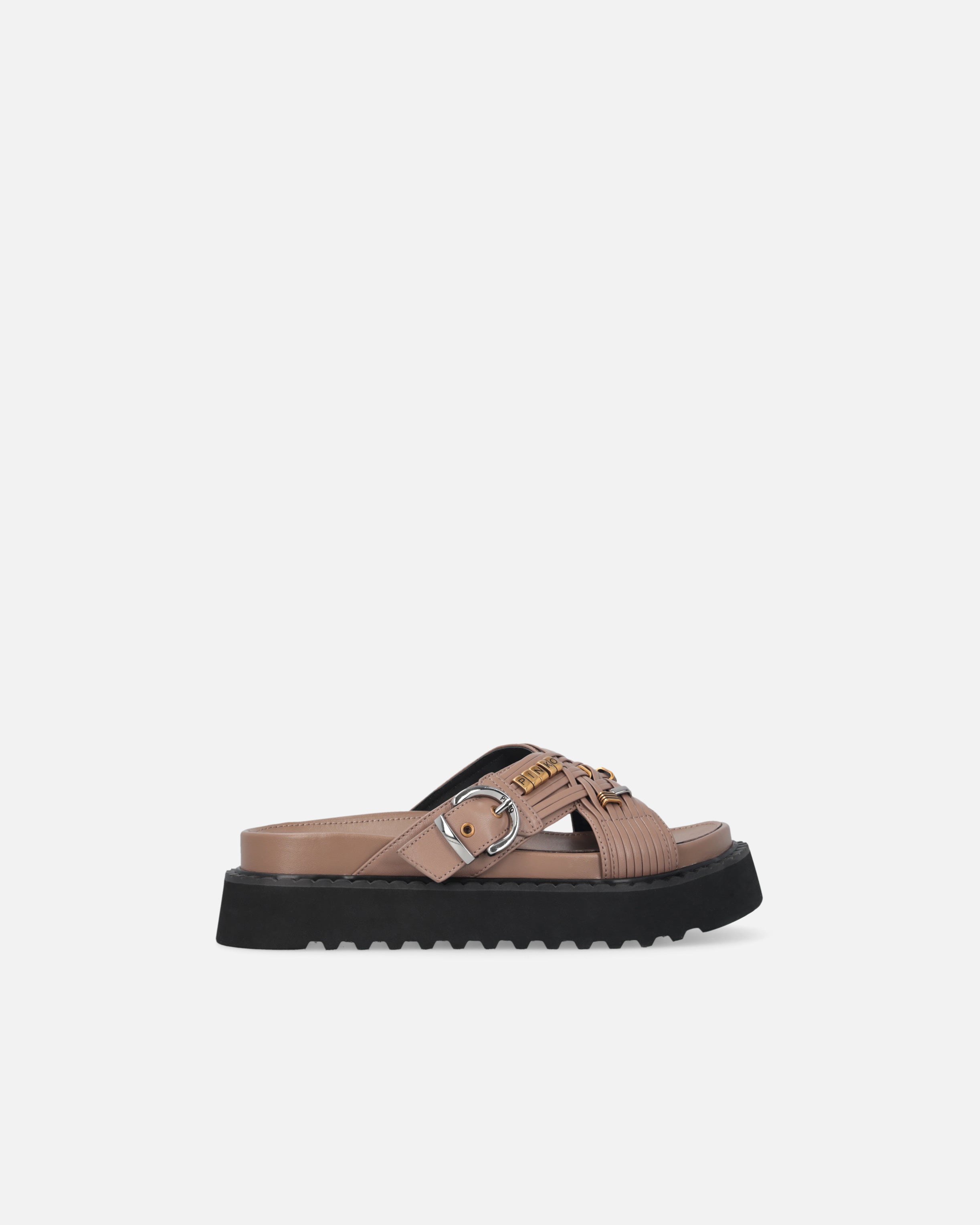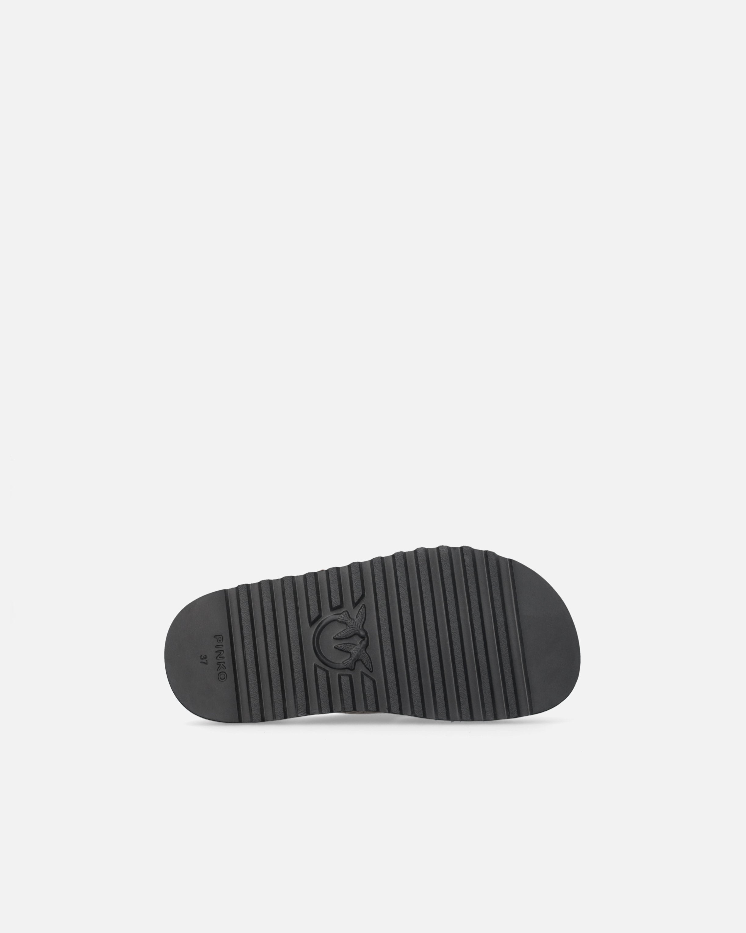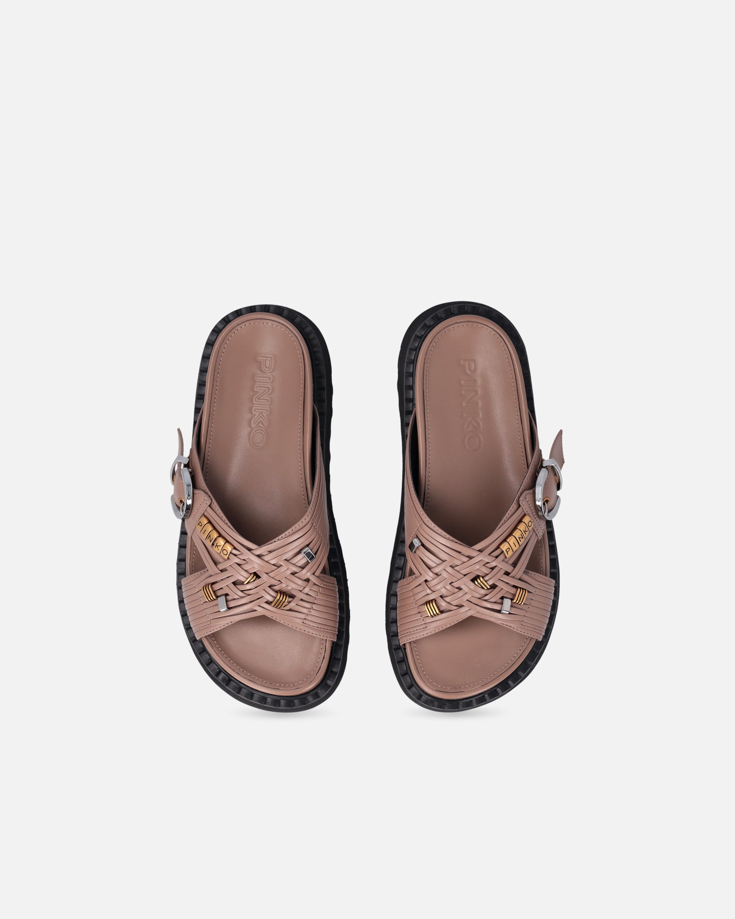 Sandalias de estilo chancla de suave napa caracterizadas por una estética atrevida y contemporánea con dos gruesas bandas cruzadas y entrelazadas en la parte superior, suela en relieve de goma, elementos metálicos con diferentes galvanizados y anillas dispuestas para formar la inscripción del logotipo PINKO. El modelo, que cuenta con una plantilla de piel que hace que sea aún más cómodo al caminar, cuenta con una práctica hebilla regulable en una de las bandas para facilitar el ajuste. Estas sandalias de estilo urbano se convertirán en tus mejores aliadas para dar un aire informal a cualquier look con una estética enérgica y rockera que no renuncia a la comodidad. - KATE 09
