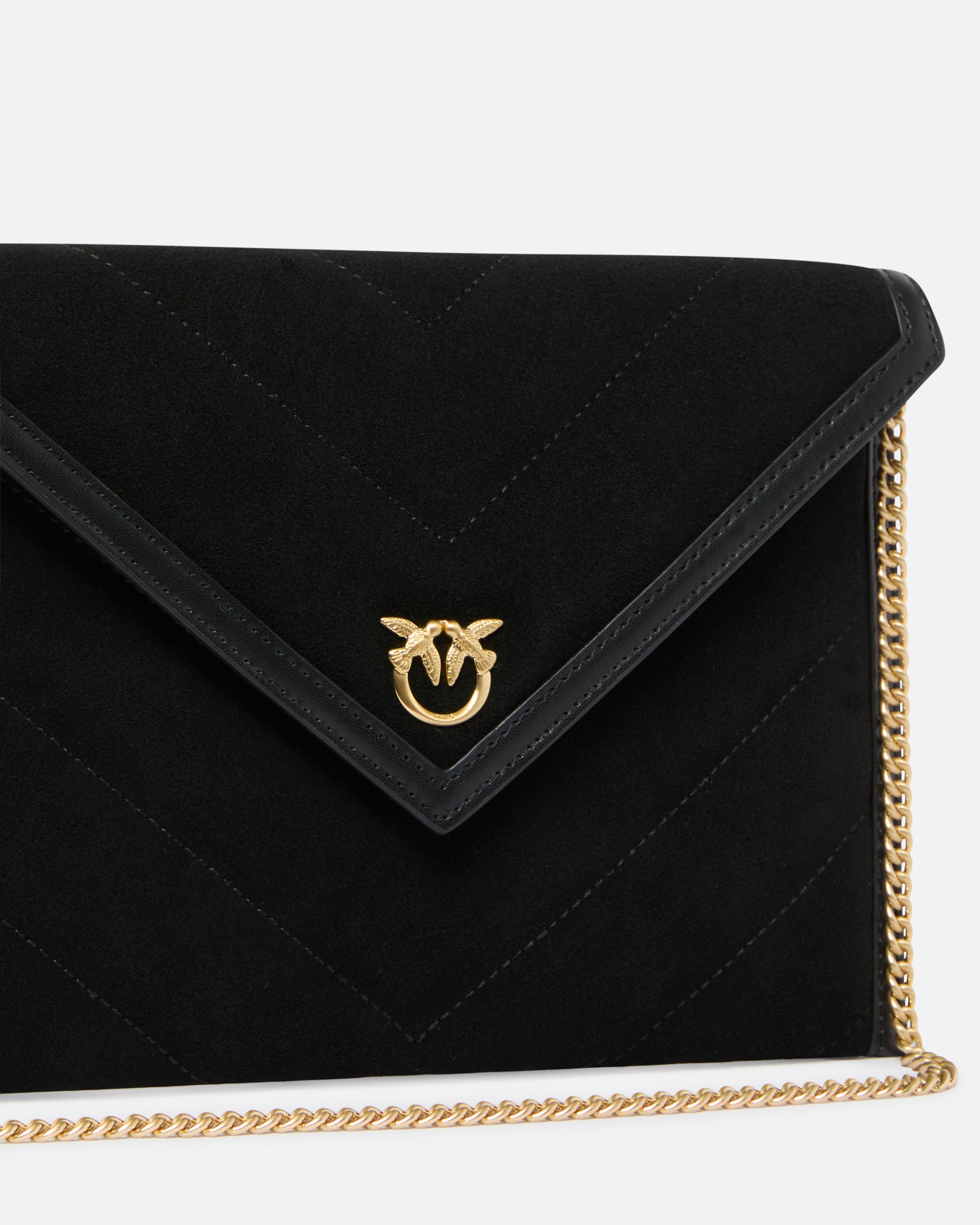Sobre realizado en ante con detalles de piel y motivo de chevrón, con forro de algodón. Con su bandolera de cadena extraíble de 54 cm de largo, el bolsito resulta extremadamente versátil y práctico. El diseño se completa con el icónico Love Birds, en galvanizado resistente, que se convierte en portavoz del inimitable estilo de la marca. Esencial y refinado, este accesorio es la pieza imprescindible para tus looks de día, entre otros.