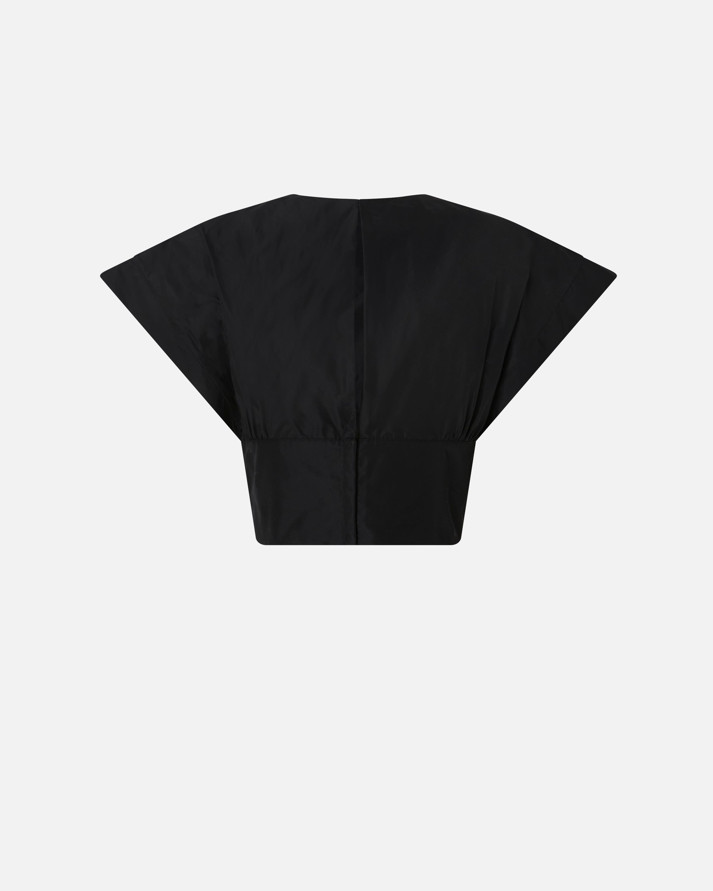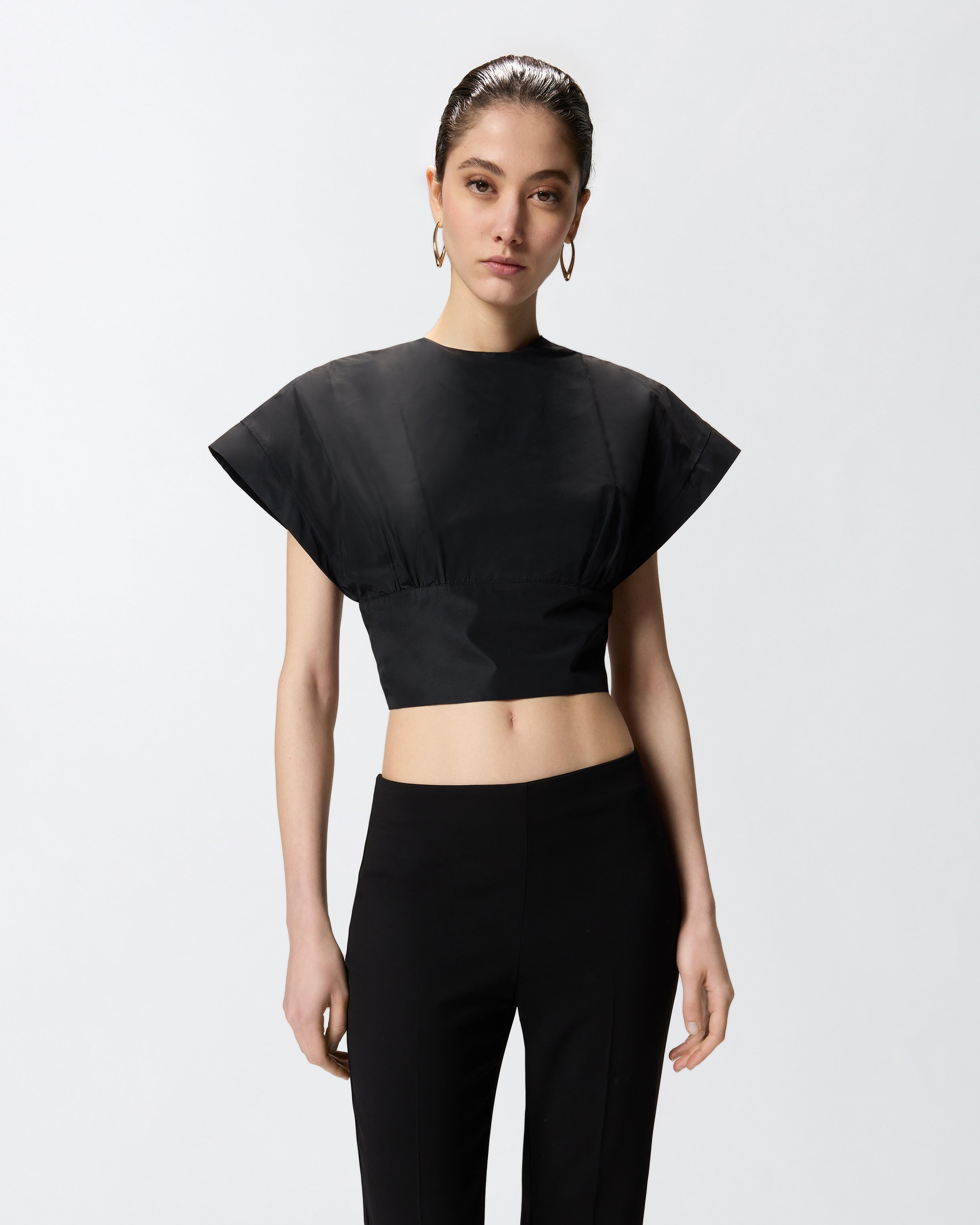 Top corto de cuello redondo y diseño contemporáneo, caracterizado por manga corta y ancha y por una amplia banda bajo el pecho. La prenda está confeccionada en tafetán, un tejido brillante de textura recia y firme que representa plenamente el ADN PINKO, y está acabada con elegantes pinzas en la parte delantera que confieren mayor estructura. La parte posterior presenta un doble cierre: un pequeño botón a tono colocado detrás del cuello y dos corchetes estilo sujetador en la cintura que permiten dos opciones de ajuste diferentes. Este top es el complemento perfecto para tus conjuntos de verano para ocasiones especiales, combinado con una refinada falda midi.