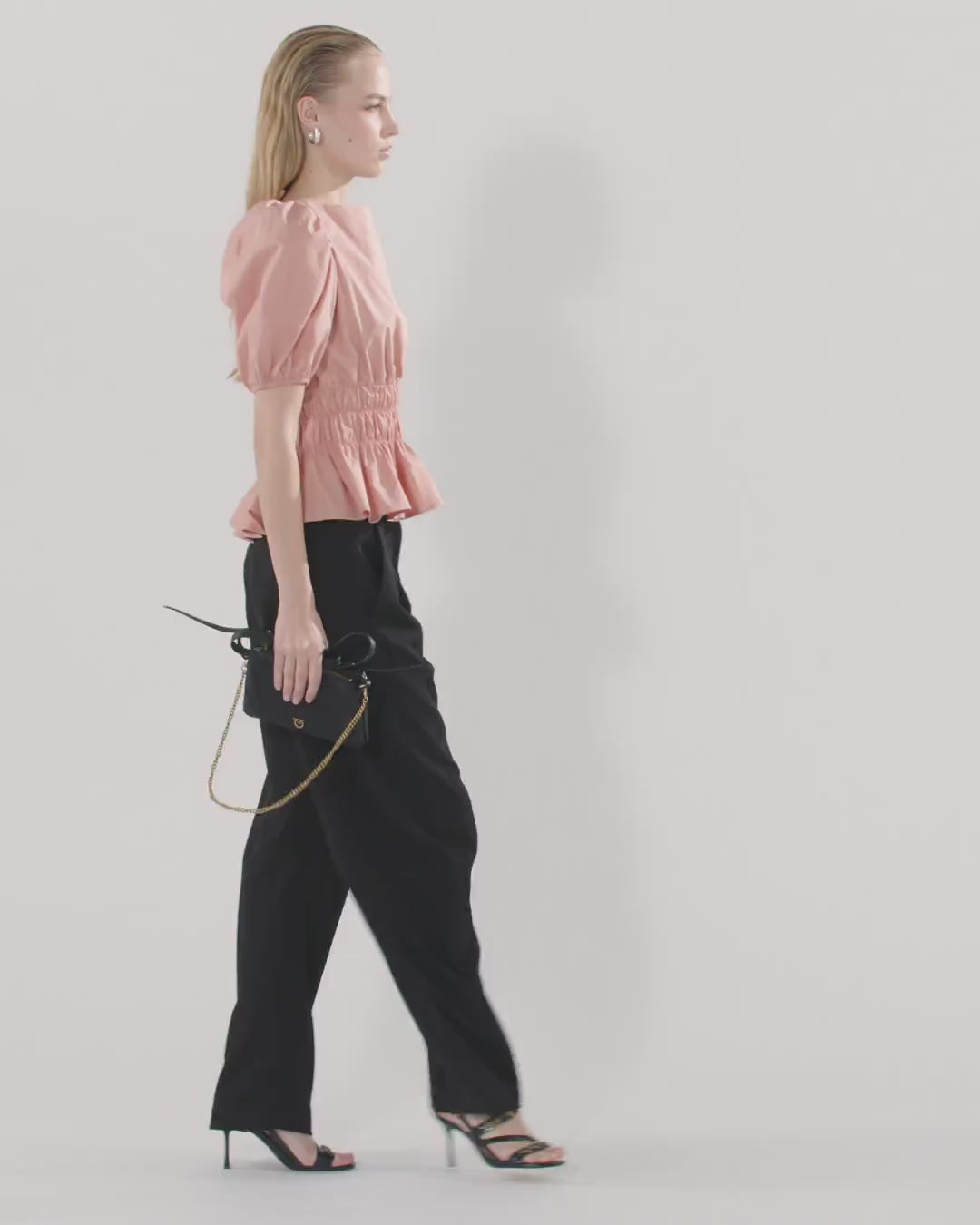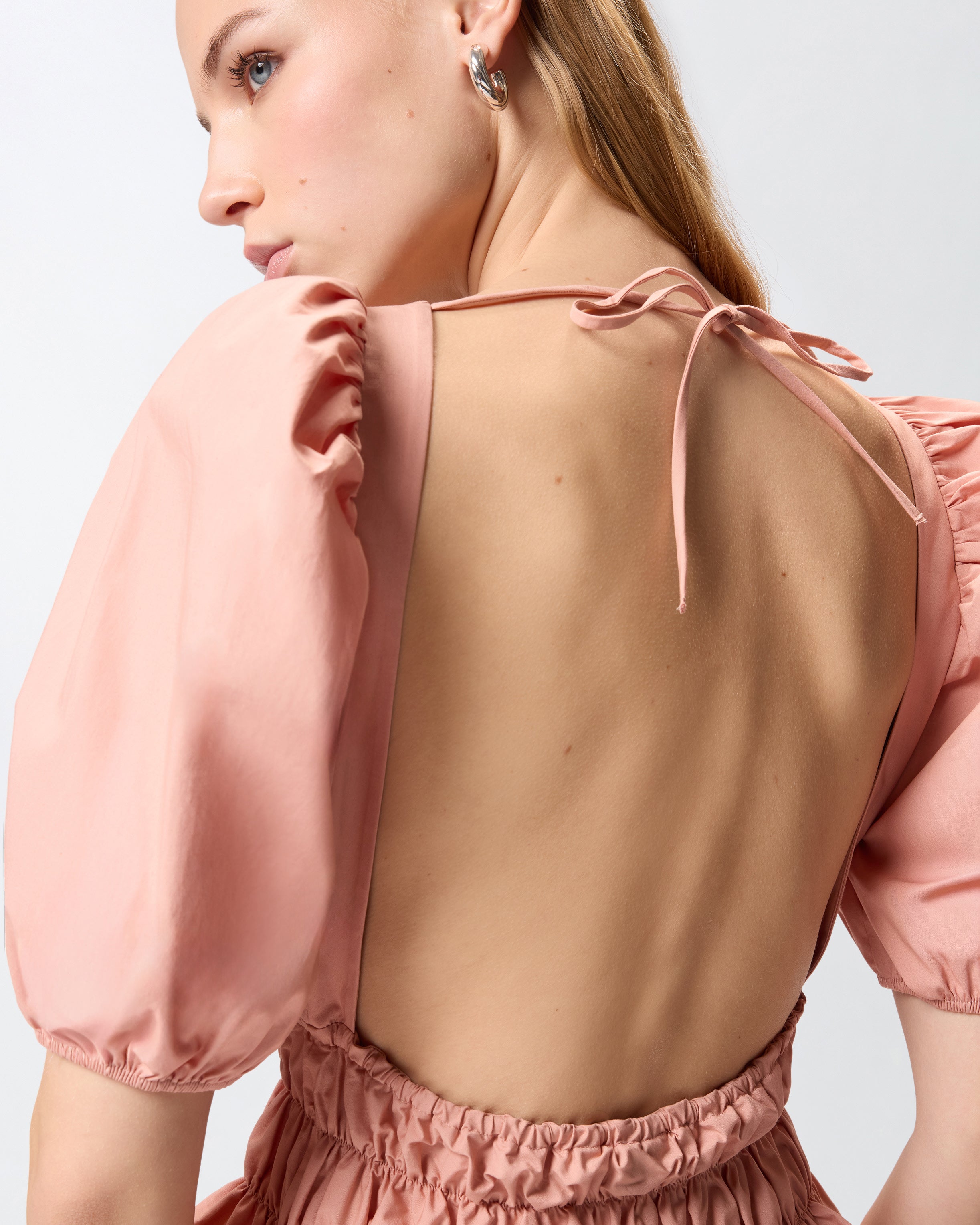 Top de corte «cropped» con escote redondo frontal y media manga ancha abullonada con borde elástico. Confeccionada en popelina de algodón elástico, la prenda resulta especial por la banda fruncida en la cintura, que da lugar a un amplio volante en la parte inferior, y por la parte posterior, caracterizada por cintas que se anudan detrás del cuello, así como por un amplio escote cuadrado que deja la espalda al descubierto. Con este top, que combina a la perfección con pantalones clásicos de talle alto o con un par de vaqueros, te resultará fácil crear un look de día femenino, refinado e inspirado en el bon ton.