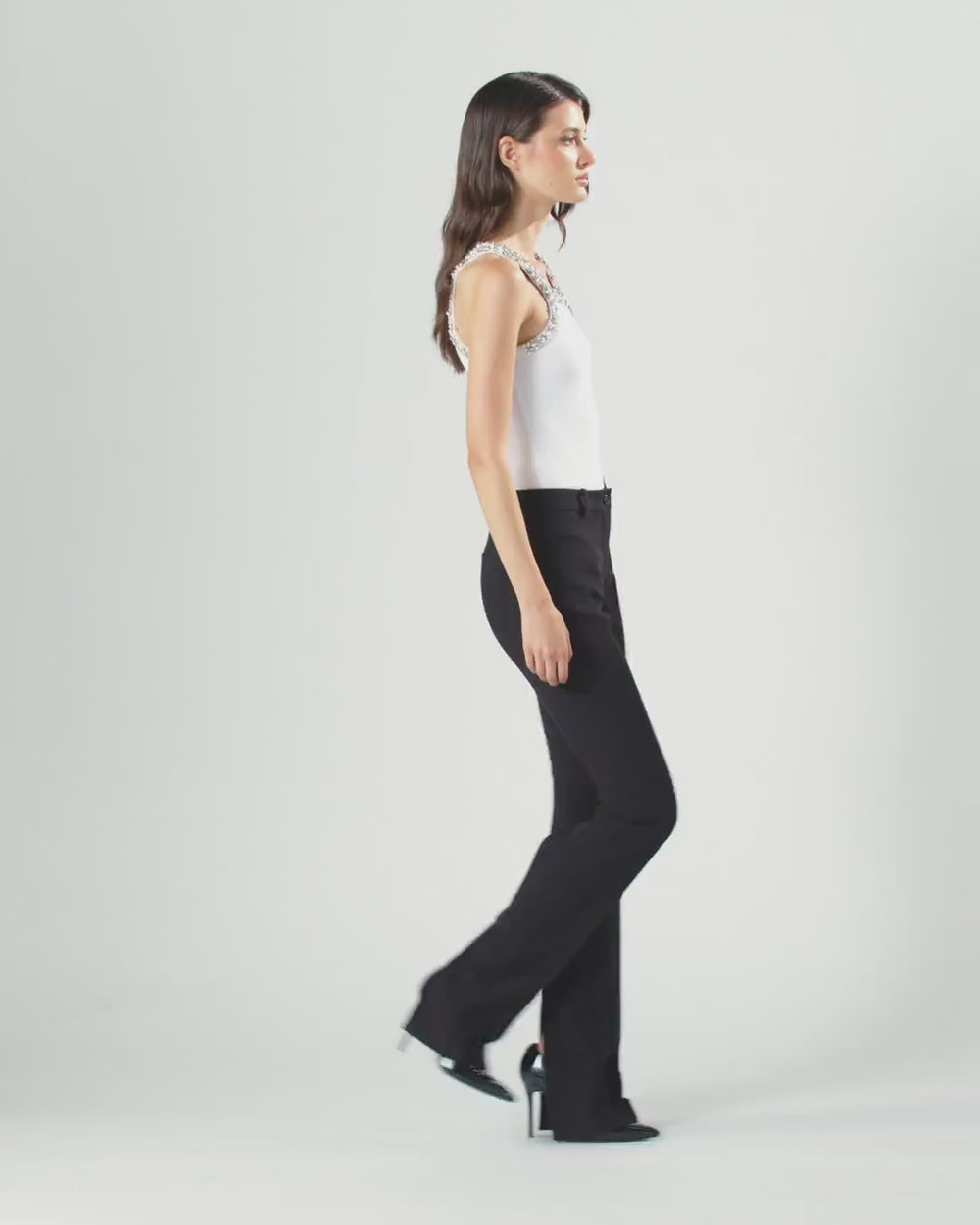 Top sin mangas de punto de algodón de confección canalé. Los tirantes y los escotes delantero y trasero están cubiertos de cristales, pedrería y detalles de vidrio cuidadosamente bordados a mano, que aportan luz y vistosidad a la prenda. Realza la elegancia y la feminidad de cualquier conjunto gracias a este top, que es la prenda perfecta para llevar debajo de la chaqueta con pantalones sastre, pero también con un par de vaqueros especiales.