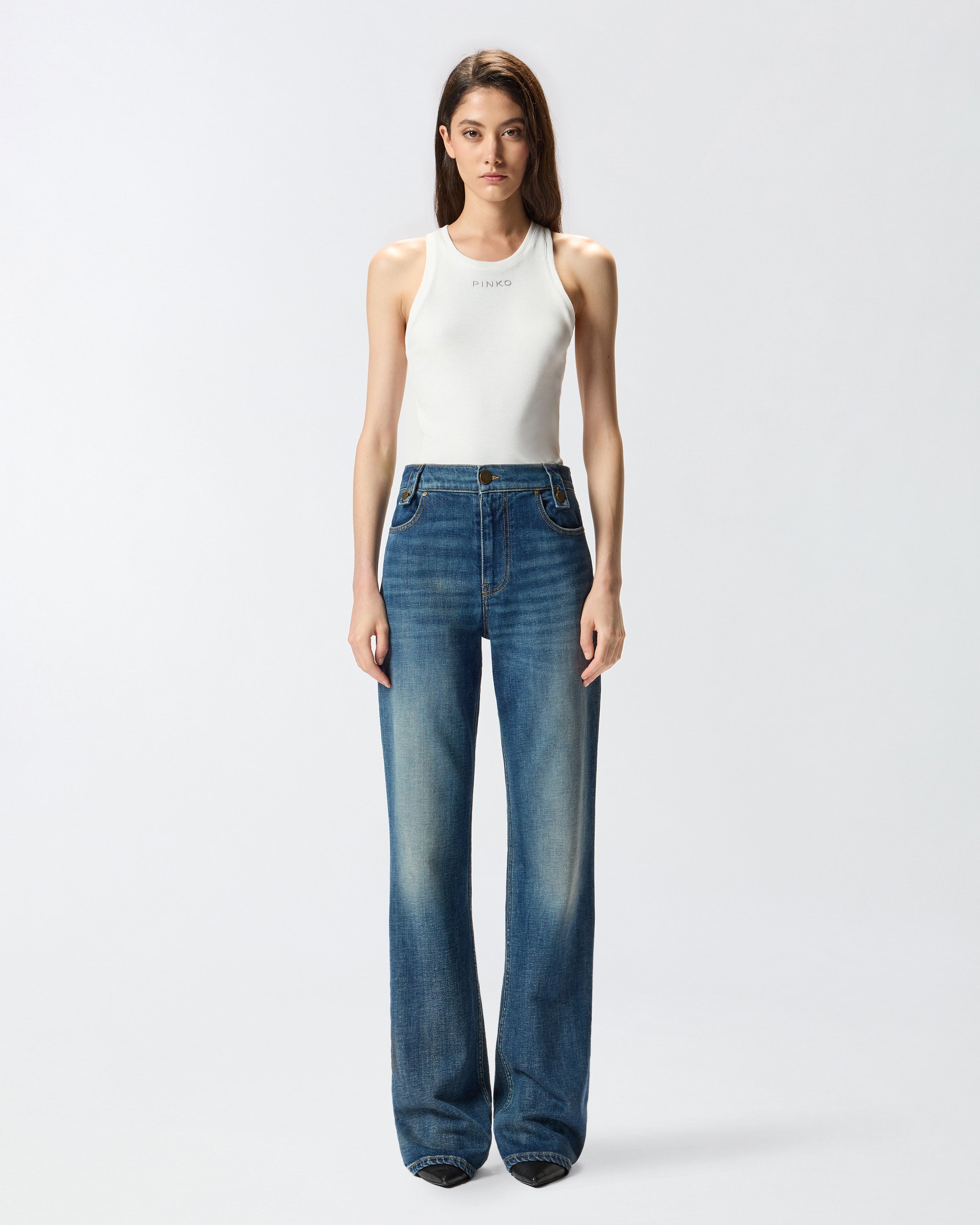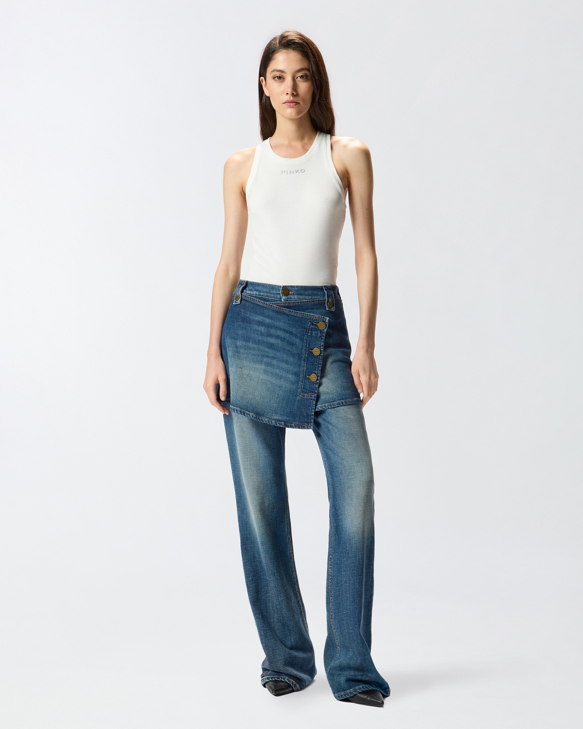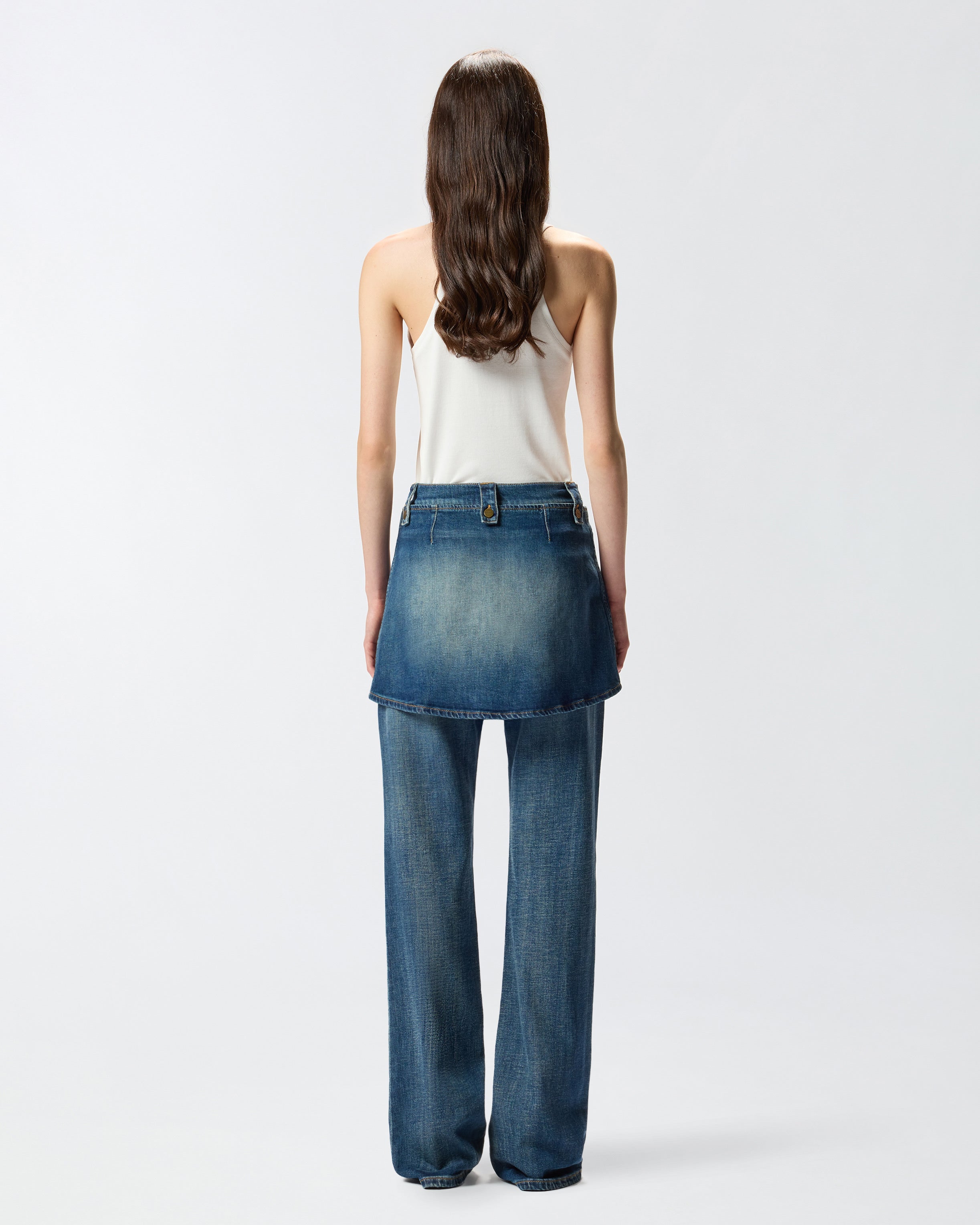 Vaqueros de cinco bolsillos «flared-fit», con pernera ceñida hasta la rodilla y acampanada en el bajo, confeccionados en denim confort de algodón con tratamiento de lavado a la piedra y lavado final con ozono para crear decoloraciones en la tela. Este efecto de sabor vintage también viene dado por el lijado manual, especialmente en las zonas de desgaste. Sin embargo, la particularidad de la prenda reside en su divertido diseño multiusos: gracias a la minifalda extraíble mediante botones con logotipo, dispondrás de tres modelos diferentes en uno y podrás ponerte sólo los vaqueros, sólo la falda o los vaqueros y la falda combinados, para lucir un look inédito y original. Talle medio con trabillas para el cinturón y cierre con cremallera y botón.