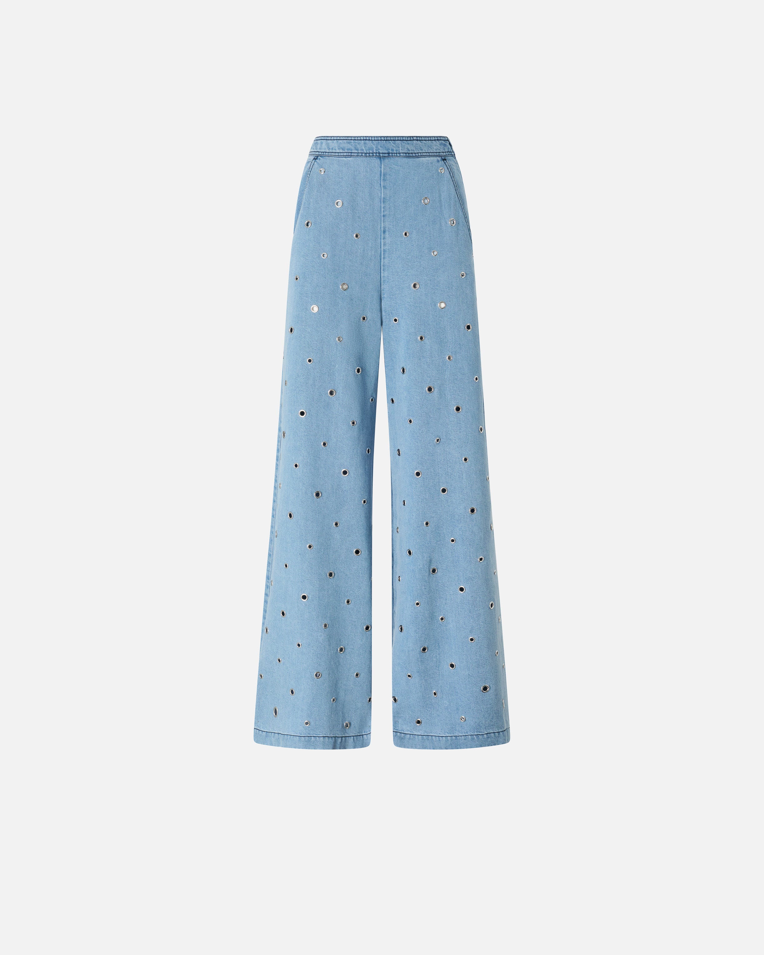 Pantalones de corte acampanado con bolsillos laterales oblicuos y cierre con cremallera lateral. El modelo se caracteriza por su particular confección: el tejido denim de puro lyocell ligero y fluido presenta un acabado descolorido con destreza y está decorado íntegramente con pequeños ojales metálicos que crean un sutil efecto perforado. Haz que tu look de día sea original y declarativo combinando los vaqueros con la blusa a juego. - STIRATRICI TROUSERS