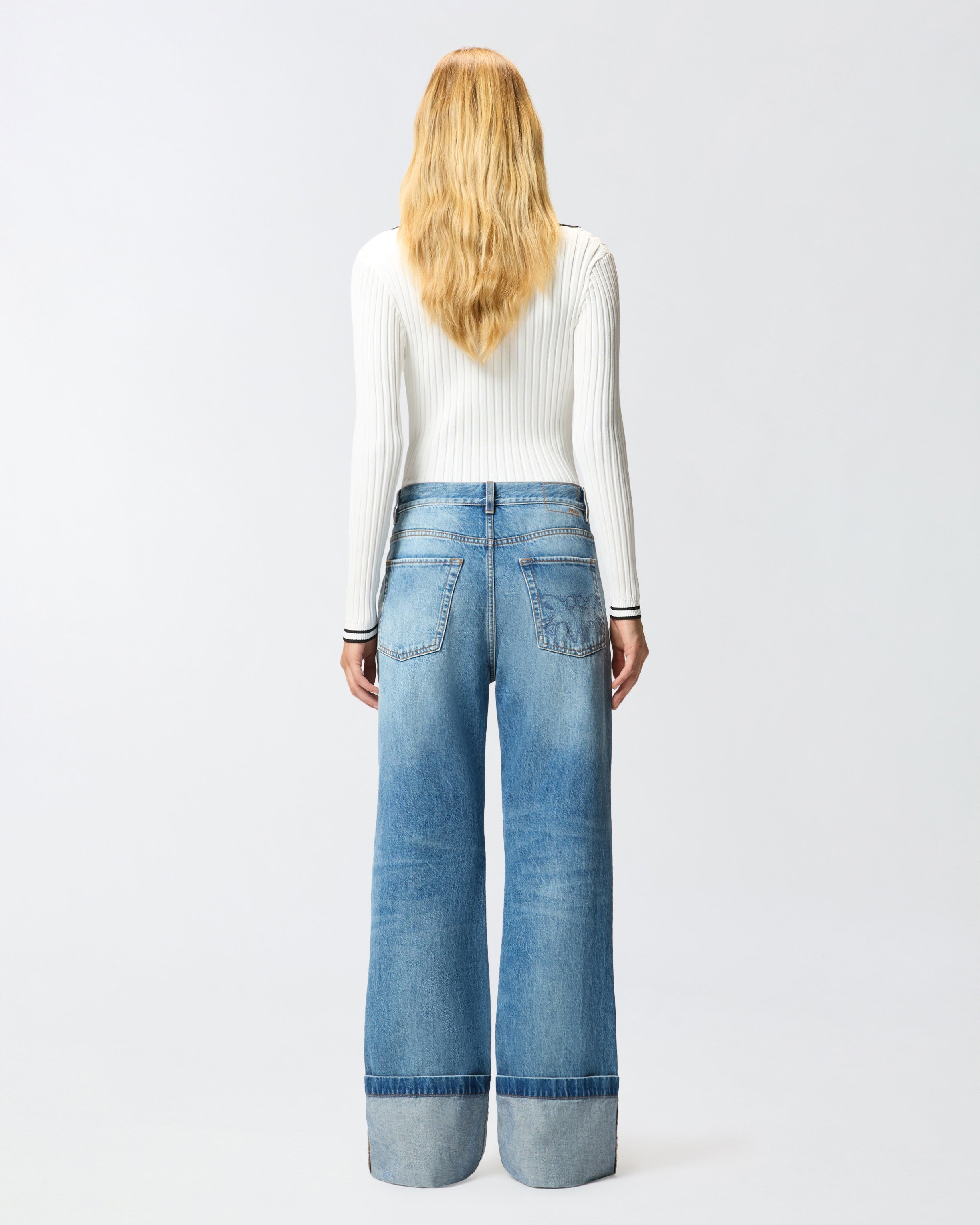 Vaqueros de cinco bolsillos para mujer de corte «wide leg» con pernera recta y amplia con dobladillo fijo. La prenda está confeccionada en denim azul de puro algodón tratado con diferentes técnicas de lavado para obtener el tono final efecto vintage. Personalizando el diseño al más puro estilo PINKO encontramos el logotipo de letras bordado en la parte trasera de la cintura y el logotipo Love Birds, presente en forma de bordado en el bolsillo trasero derecho y en forma de trabilla extraíble. Trabillas para el cinturón y cierre frontal con botón y cremallera oculta. El modelo queda un poco más holgado respecto a la talla habitual.