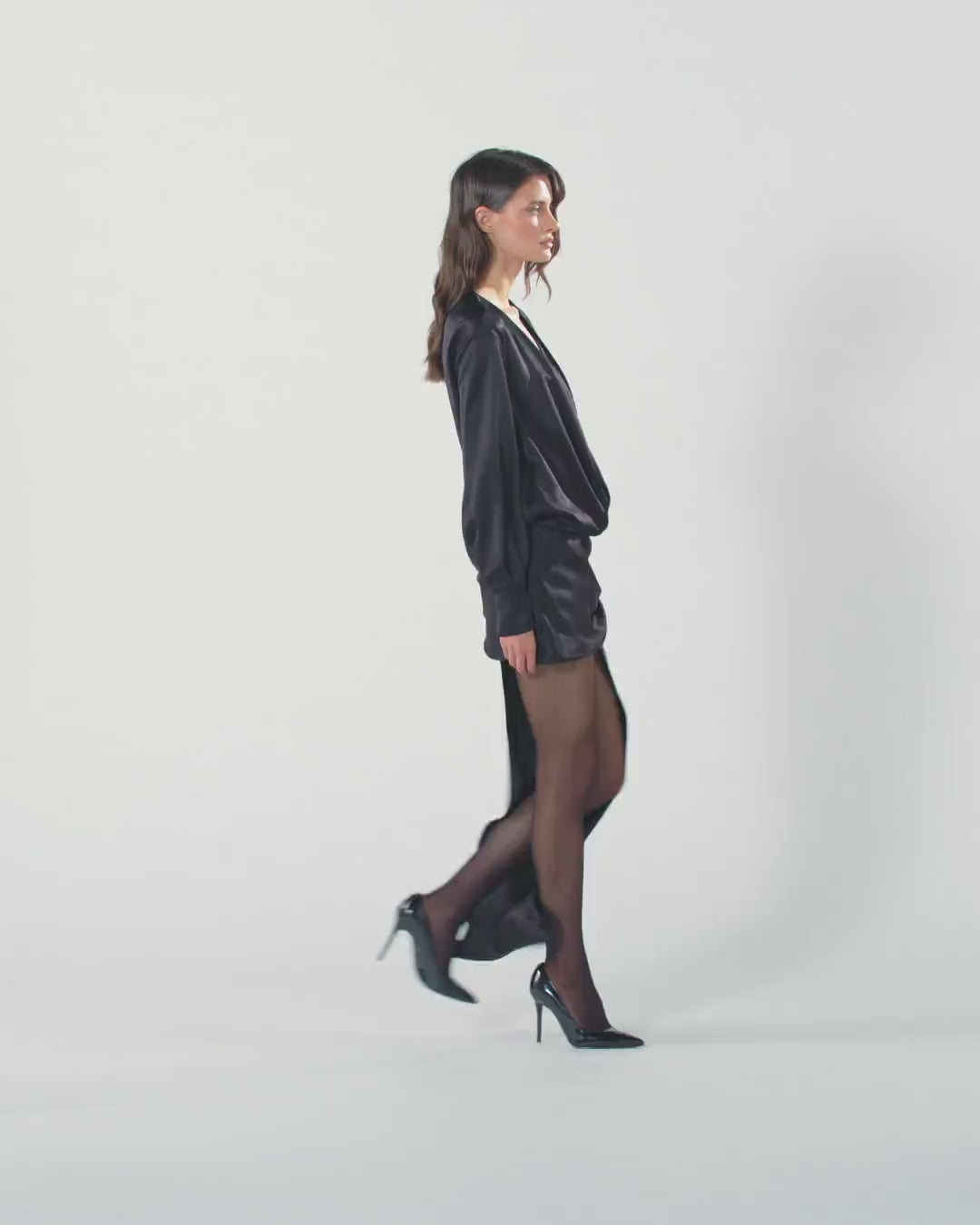 Vestido corto con cola lateral, con cremallera invisible a un lado y mangas con botón esférico de color dorado. El raso brillante aporta una luminosidad única y un tacto especialmente suave a la prenda. La prenda se completa con un toque de sensualidad dado por el top lencero con encaje en contraste. Luce este diseño de efecto fluido y deslizante que realza con elegancia y refinamiento las líneas y la silueta femenina.