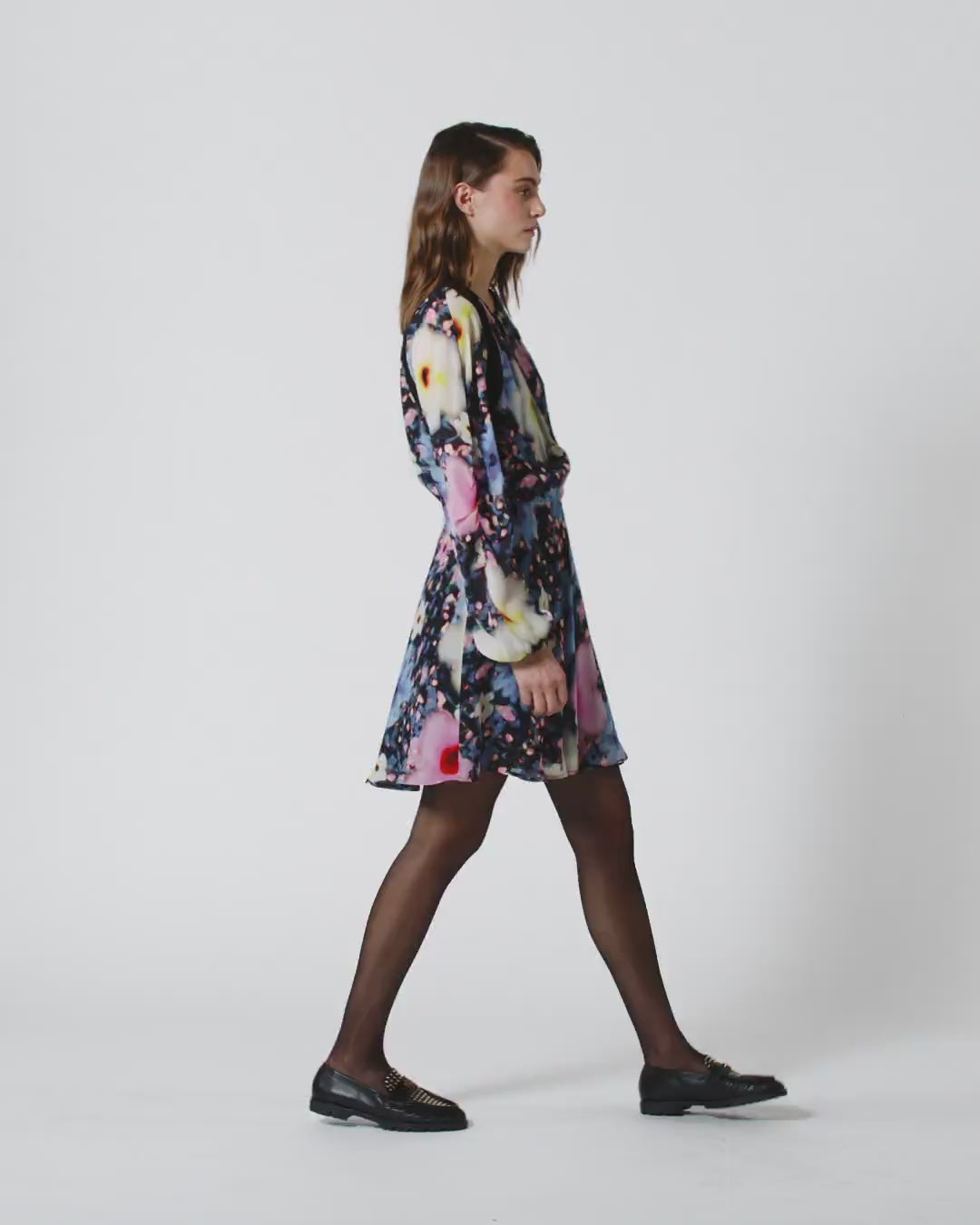 Vestido corto de georgette de viscosa con estampado floral. El modelo presenta un corte holgado acentuado por la parte superior, con manga larga y cuello redondo ligeramente fruncido, y por la falda cortada al bies, que cae con fluidez y crea un romántico movimiento en el bajo. El estampado multicolor, realizado con técnica digital, le da al vestido un look femenino, mientras que los detalles de color liso en las sisas y el cierre trasero con abertura en forma de lágrima con botón crean un atractivo juego de contrastes.