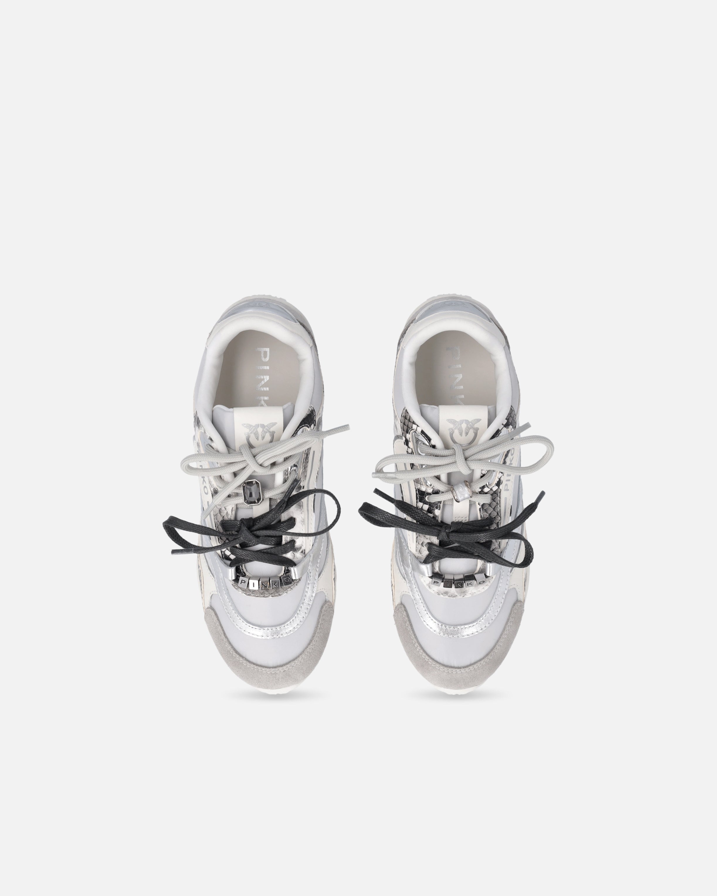 Zapatilla de deporte caracterizada por un refinado juego de contrastes dado por los cordones dobles de diferentes colores y la combinación de tejido técnico, detalles de ante, inserciones de piel laminada e inserciones con estampado de pitón. El logotipo con los pajaritos Love Birds remata la lengüeta y el talón con efecto espejo, mientras que el icónico logotipo de letras PINKO figura en la inserción lateral y en las anillas metálicas que adornan los cordones en la parte delantera. Los cordones superiores se completan con una brillante joya engastada en una zapatilla y un «charm» con efecto jaspeado en la otra. En el interior, el modelo presenta una plantilla de 10 mm de látex para una amortiguación perfecta, mientras que la cómoda suela de goma garantiza el agarre. Una visión contemporánea del calzado deportivo reinterpretada en clave PINKO, para distinguirte con estilo incluso en tus conjuntos diarios. - YULIA 01