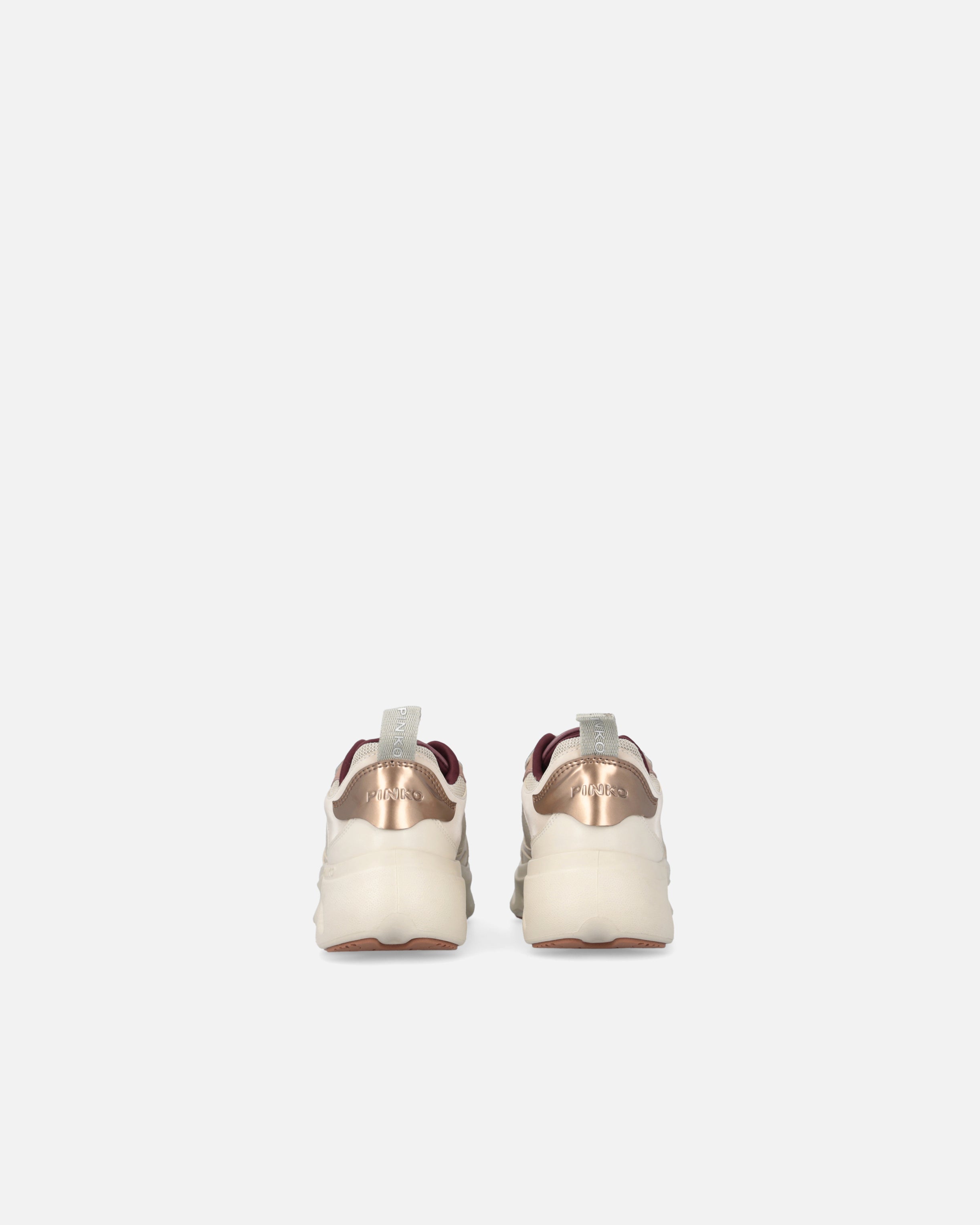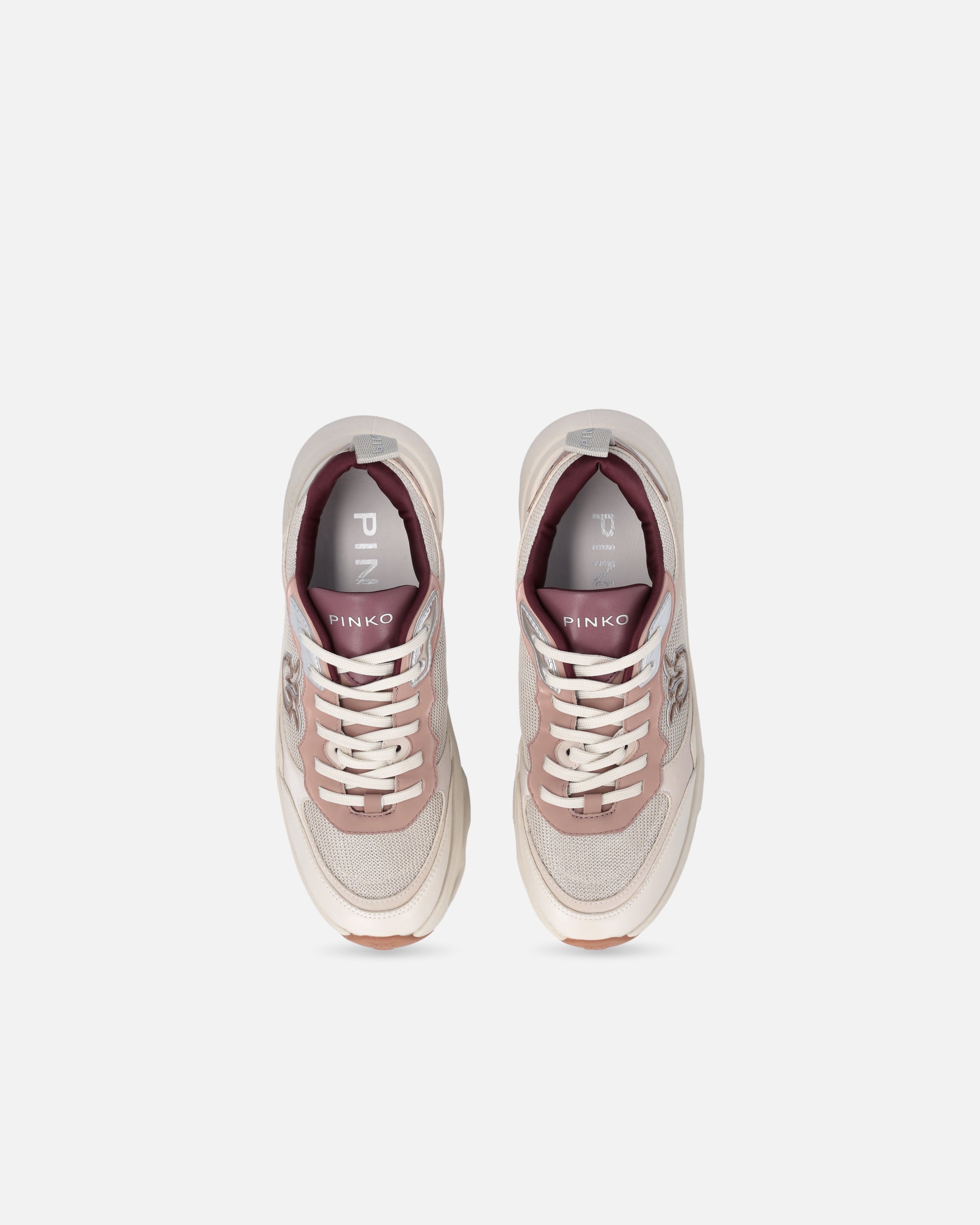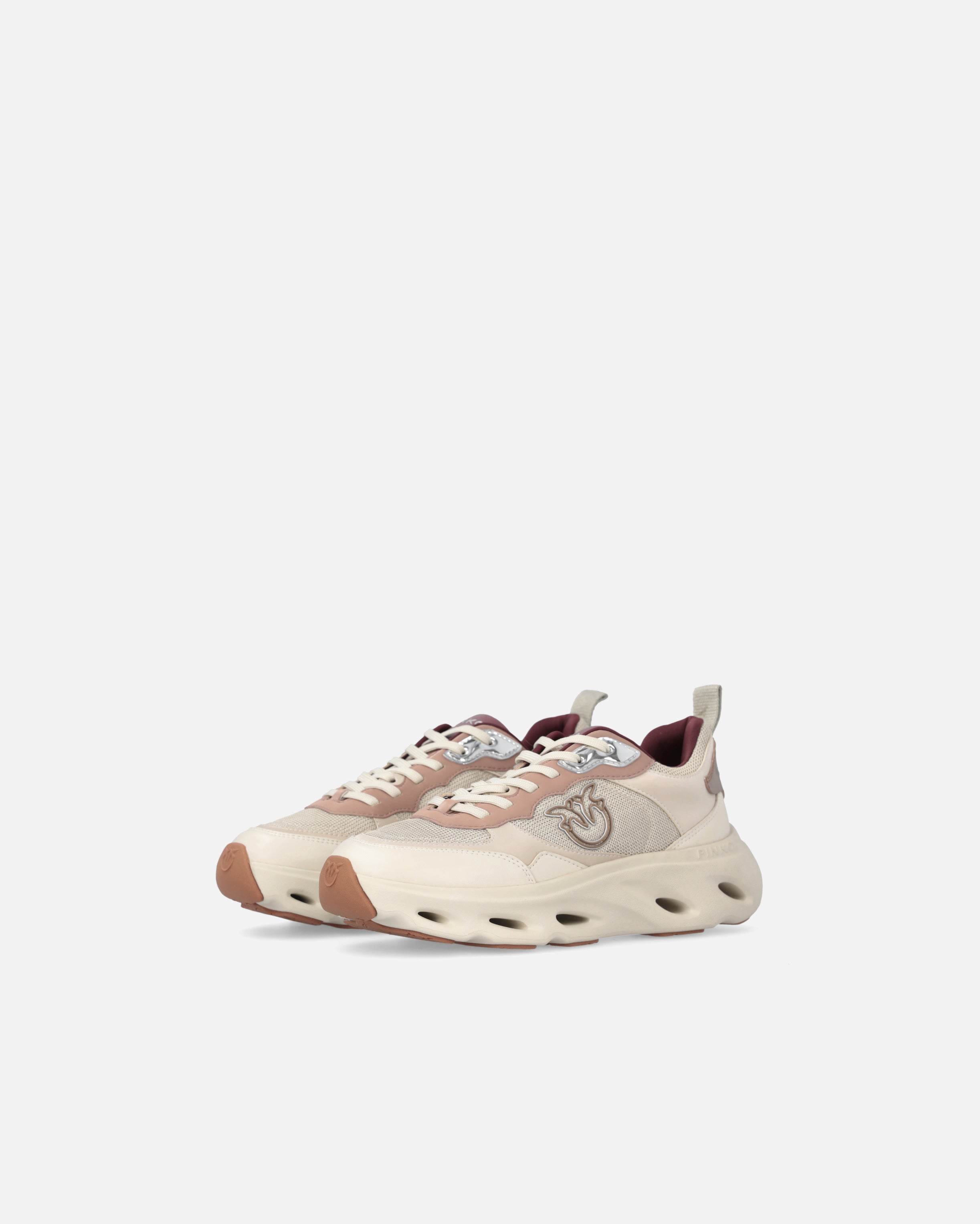 Zapatilla deportiva con cordones y tirador en el talón para calzarlas cómodamente. La pala se caracteriza por un refinado juego de contrastes táctiles y visuales gracias a la combinación de malla, inserciones de piel lisa y detalles de piel laminada, para brindar el toque de elegancia que siempre ha distinguido a la marca. El logotipo de letras PINKO destaca en la lengüeta y en la suela interior, mientras que el logotipo Love Birds en relieve adorna los laterales de las zapatillas. La suela de plataforma perforada se caracteriza por una aplicación adicional de goma en el piso, salpicada por el motivo del logotipo Love Birds en toda la superficie. Reinterpretación contemporánea de un clásico del armario deportivo, estas zapatillas aportan un toque de glamour al más puro estilo PINKO a tus conjuntos de diario. - PINK 09
