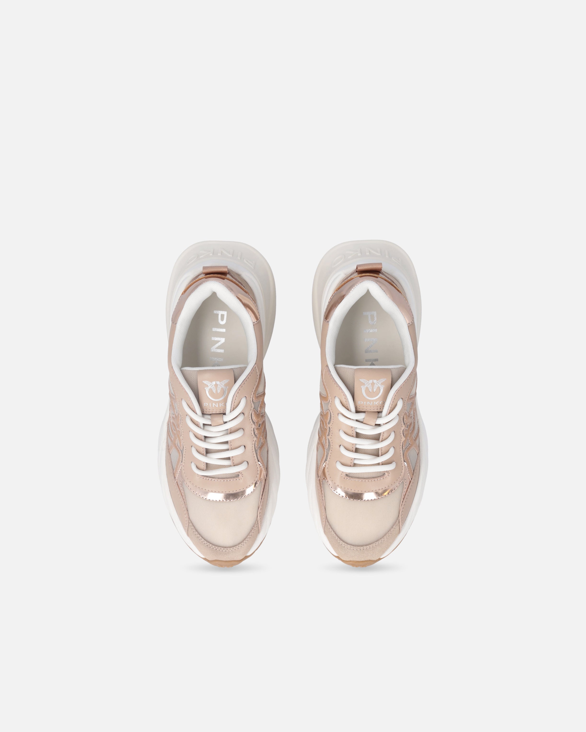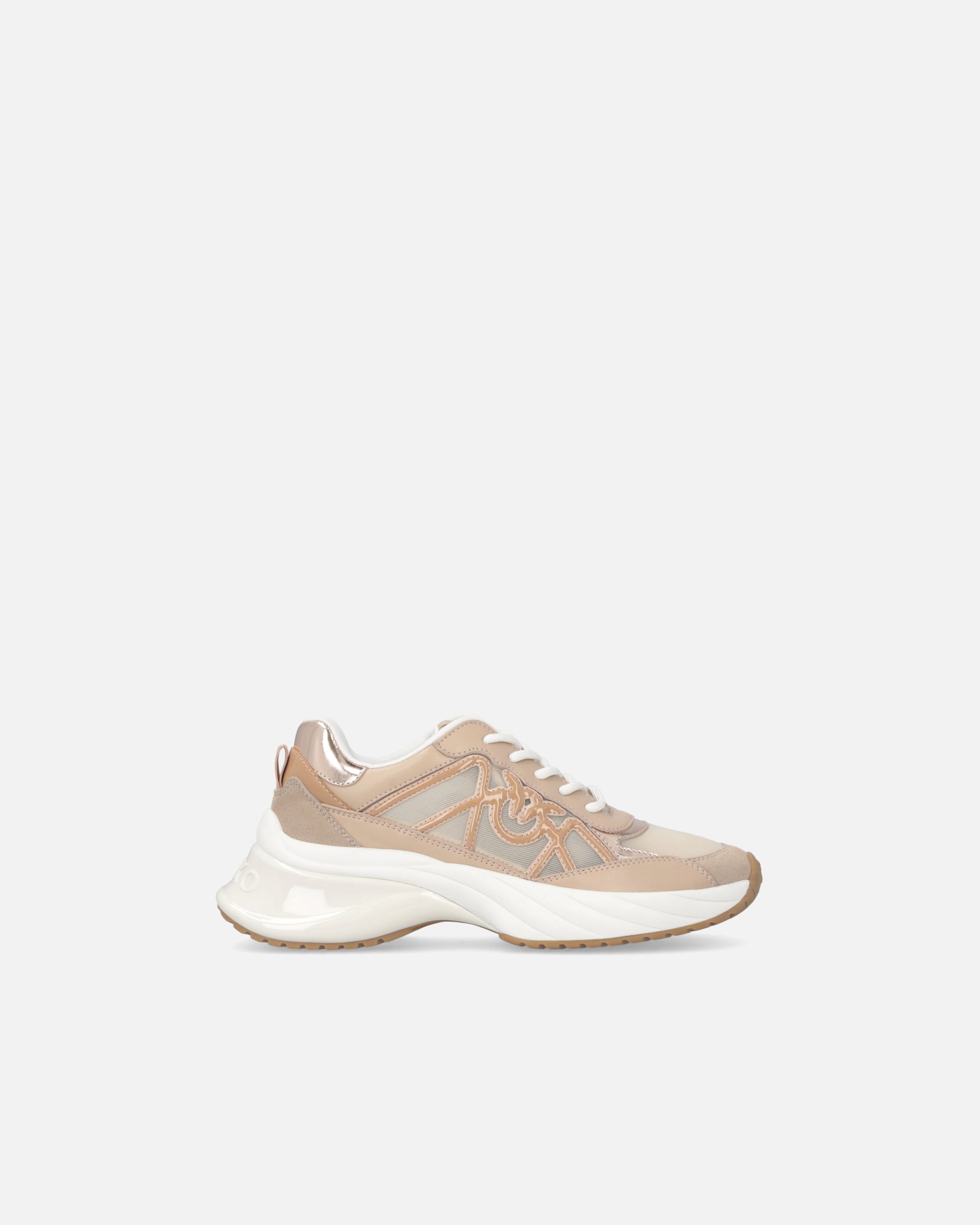 Zapatilla de deporte con cordones caracterizada por un refinado juego de contrastes táctiles y visuales gracias a la combinación de malla, detalles de ante e inserciones de piel brillante. El imprescindible logotipo Love Birds está incorporado en el lateral de la pala y también se reproduce en la lengüeta. El tirador trasero facilita el calzado, mientras que la suela gruesa, con la parte posterior brillante y con el logotipo, garantiza una comodidad inmediata. Reinterpretación contemporánea de un clásico del armario deportivo, estas zapatillas aportan un toque de glamour al más puro estilo PINKO a cualquier conjunto informal. - ARIEL 33