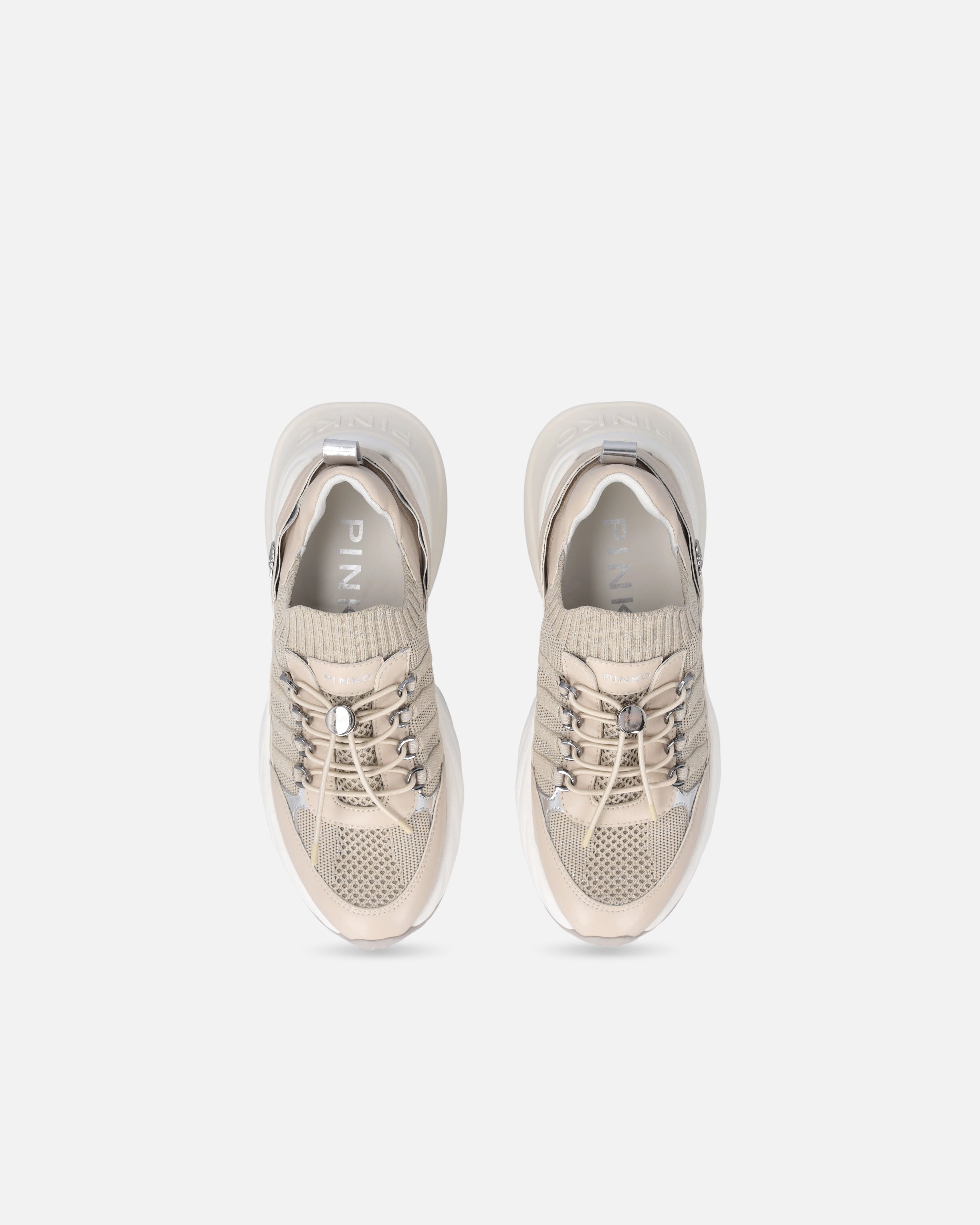 Zapatilla deportiva caracterizada por un particular diseño de punto con inserciones de piel y detalles de piel laminada, y dotada de cordones que se cierran con un tope estilo jareta. El modelo está personalizado con el logotipo de letras PINKO en la lengüeta y el imprescindible logotipo con pájaros Love Birds en forma de pequeña aplicación metálica lateral. El tirador trasero facilita el calzado, mientras que la suela gruesa, con la parte posterior brillante y con el logotipo, garantiza una comodidad inmediata. Reinterpretación original de un clásico del armario deportivo, estas zapatillas aportan un toque de glamur al más puro estilo PINKO a cualquier conjunto informal. - ARIEL 34