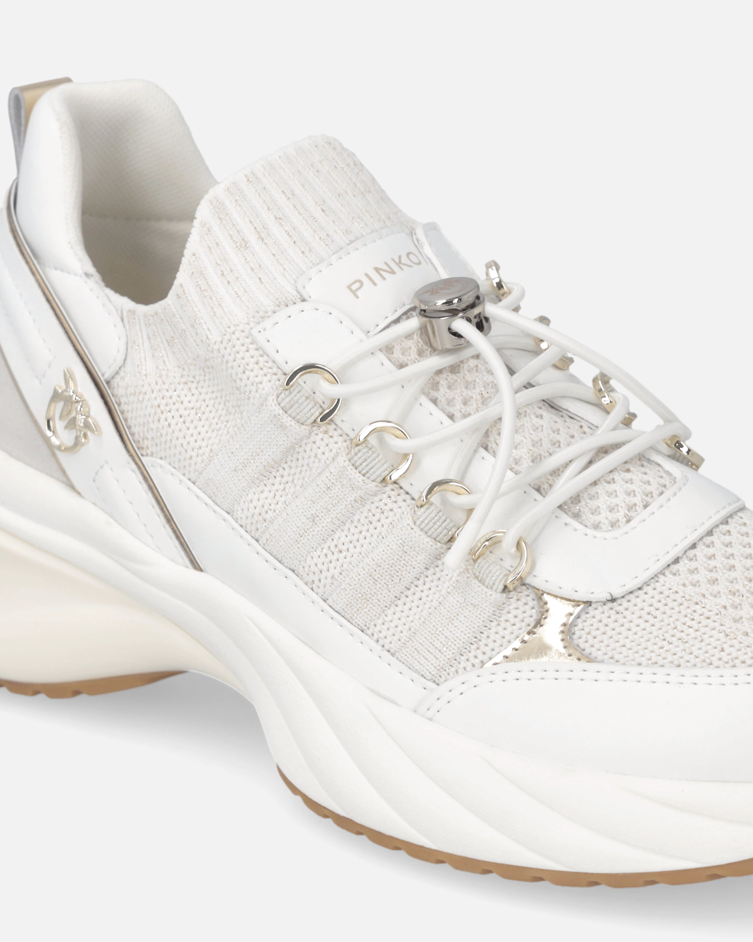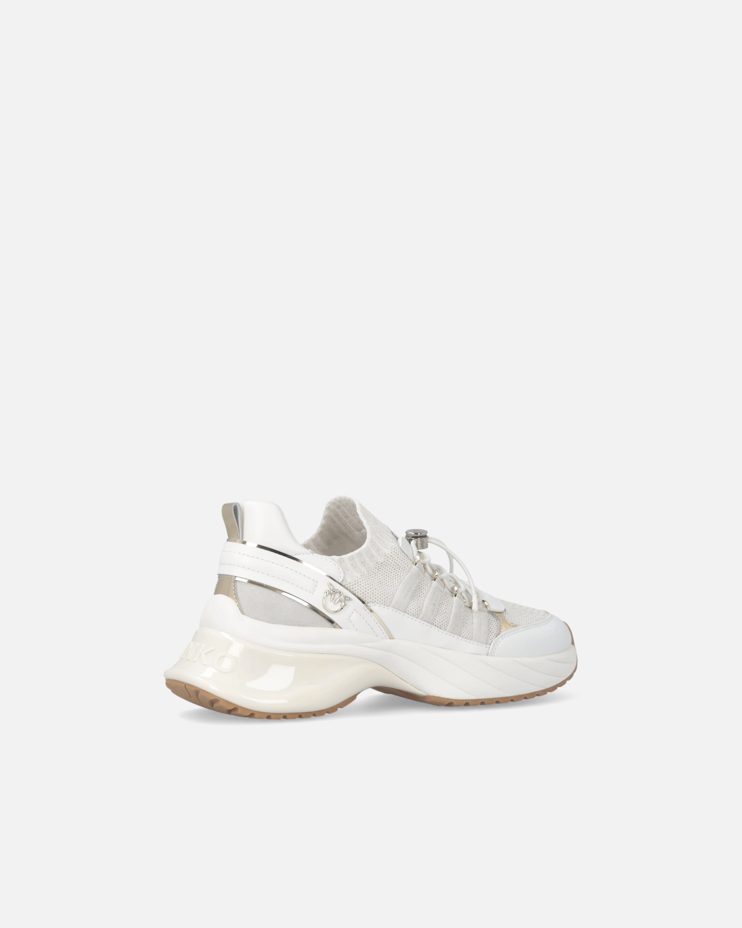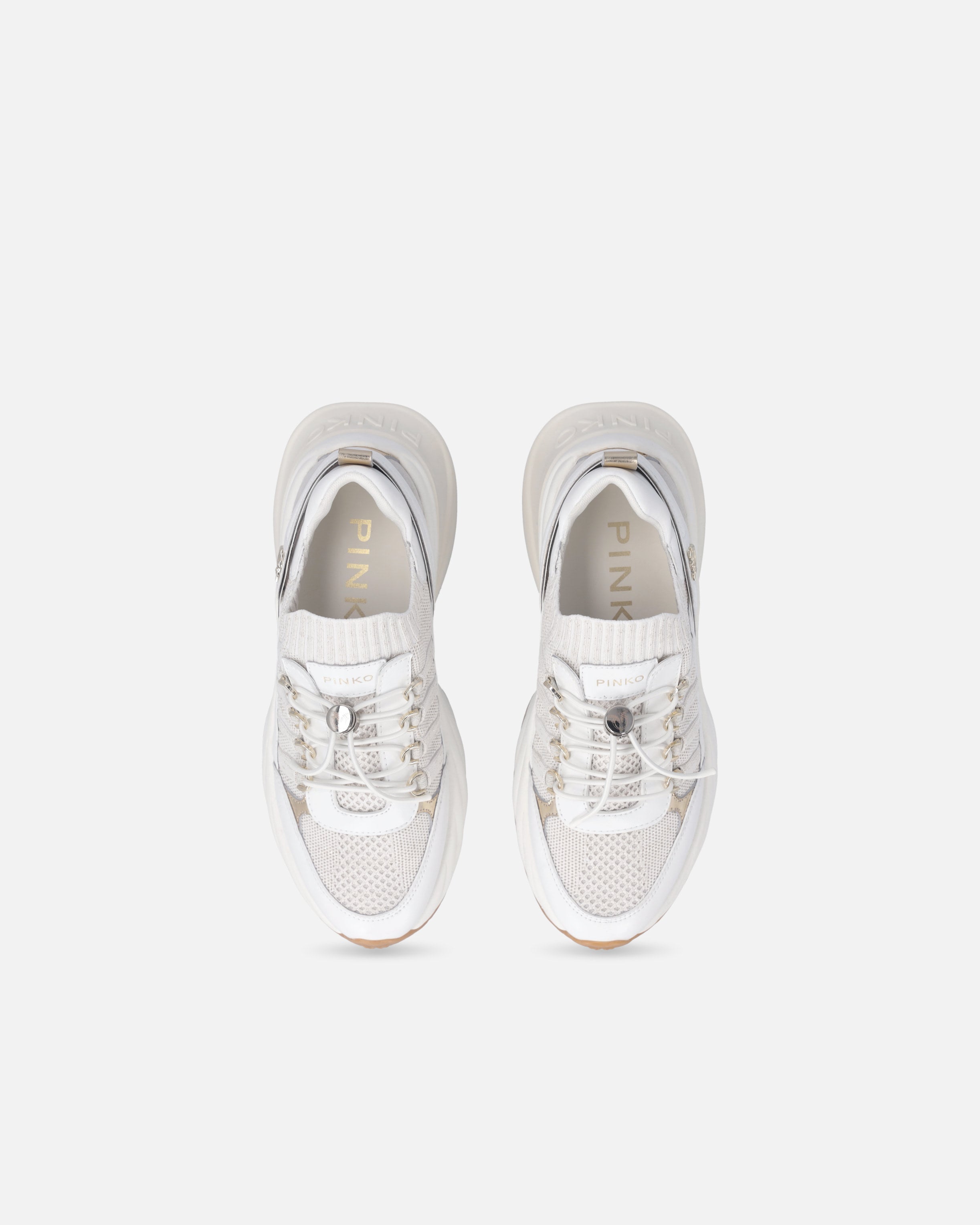 Zapatilla deportiva caracterizada por un particular diseño de punto con inserciones de piel y detalles de piel laminada, y dotada de cordones que se cierran con un tope estilo jareta. El modelo está personalizado con el logotipo de letras PINKO en la lengüeta y el imprescindible logotipo con pájaros Love Birds en forma de pequeña aplicación metálica lateral. El tirador trasero facilita el calzado, mientras que la suela gruesa, con la parte posterior brillante y con el logotipo, garantiza una comodidad inmediata. Reinterpretación original de un clásico del armario deportivo, estas zapatillas aportan un toque de glamur al más puro estilo PINKO a cualquier conjunto informal. - ARIEL 34