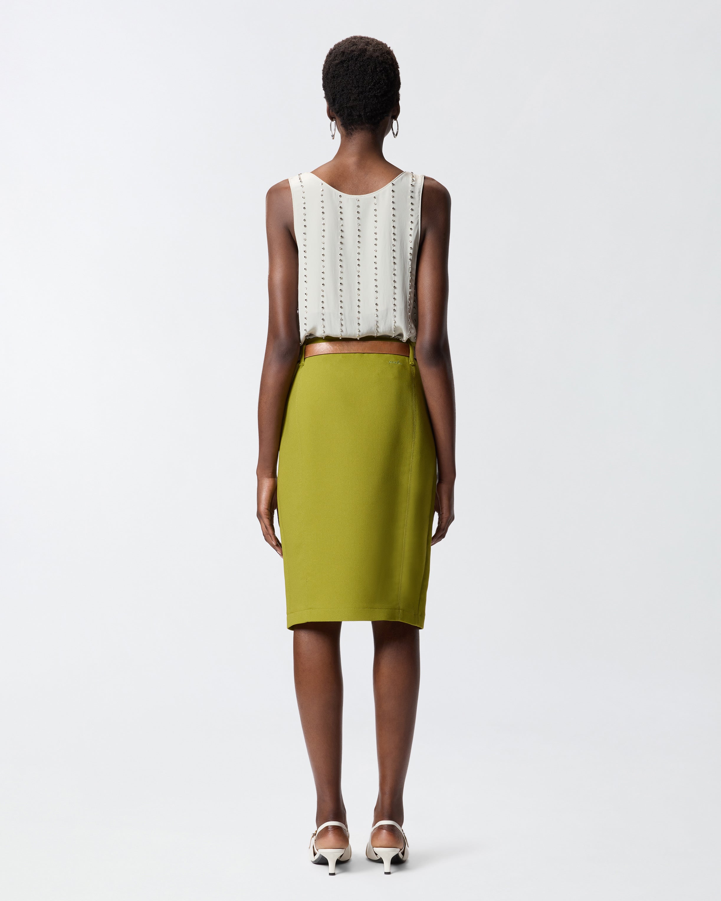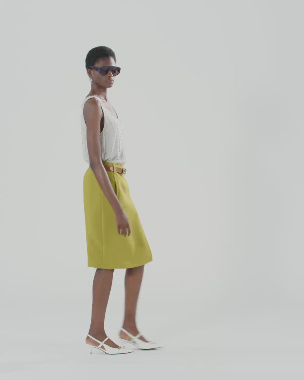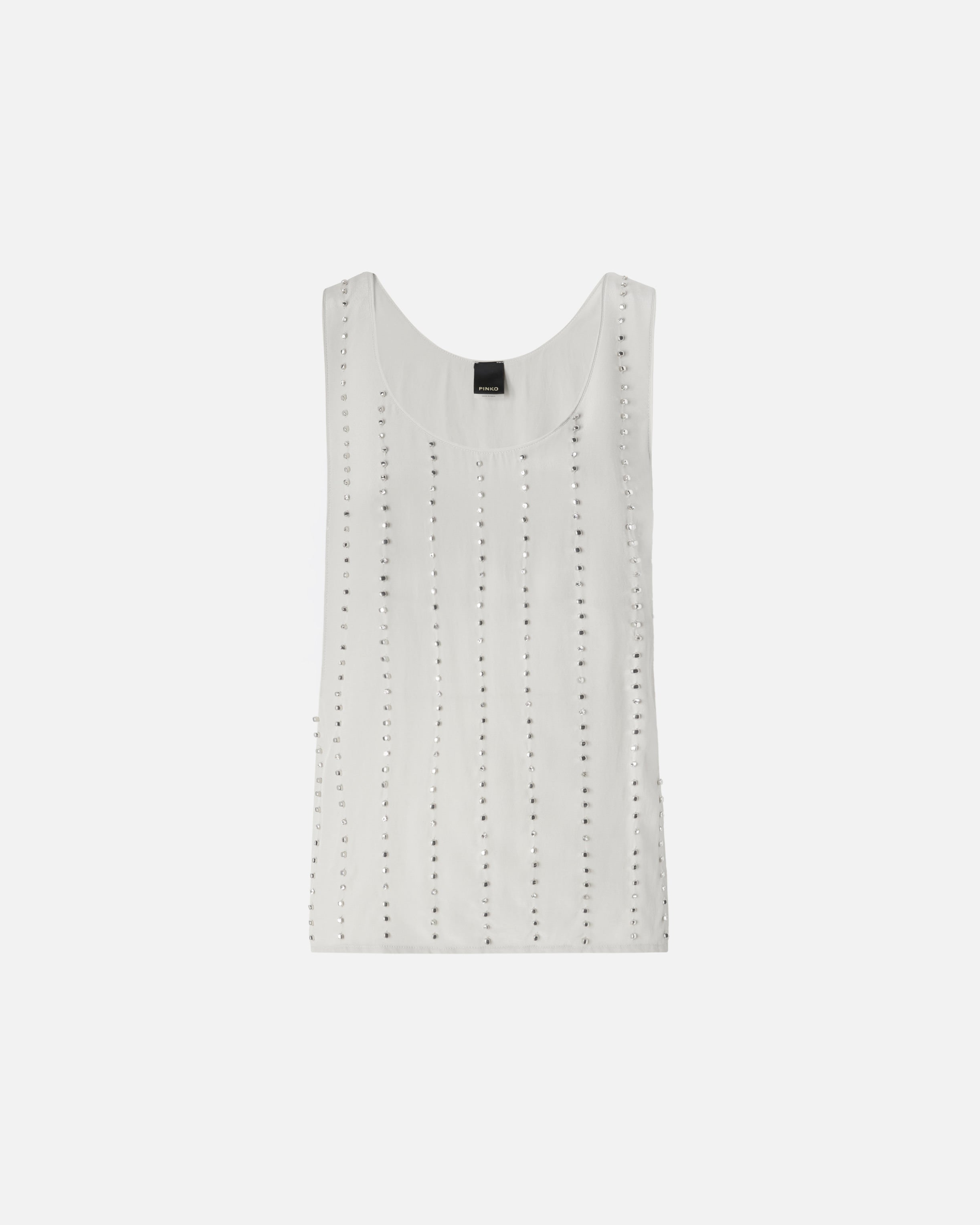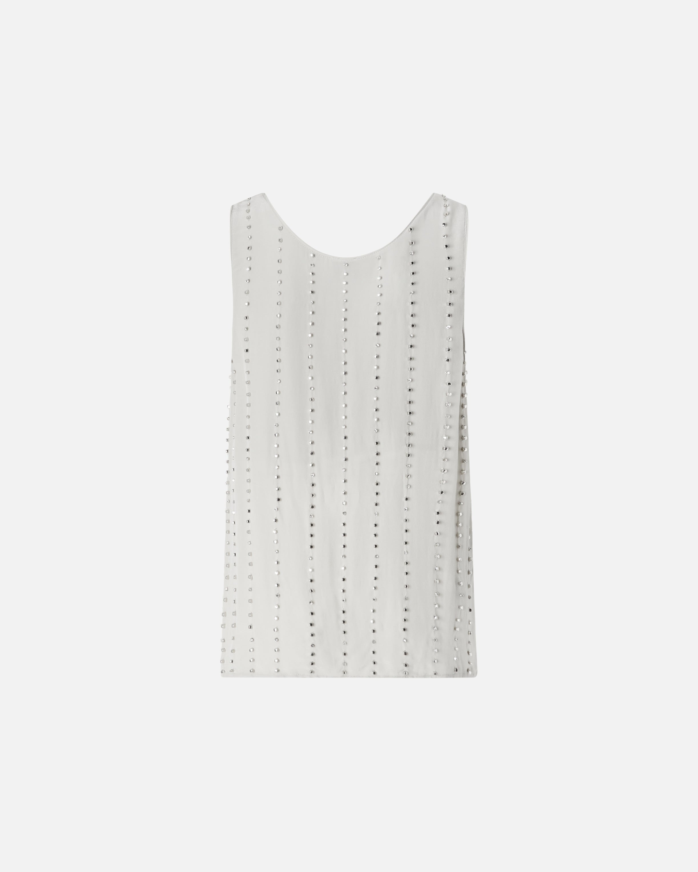 Débardeur avec large encolure ronde, en crêpe de viscose fluide et glissant au toucher. Ce modèle est un véritable bijou grâce à son motif rayé original façon costume obtenu par l’alternance de petits cubes métalliques et de cristaux sertis brodés à la main. Sa coupe polyvalente et élégante en fait une pièce parfaite à porter sous une veste avec un pantalon couture ou un jean original.