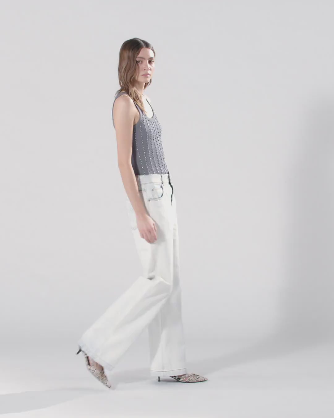 Jean wide leg cinq poches pour femme à la coupe droite et large à revers fixe. Modèle en denim de pur coton à délavage super bleached pour un blanc optique all-over, à l'exception de l’intérieur de la taille et du revers en bas de jambe pour une touche de couleur contrastante. Grâce à sa fermeture zippée plus courte, à son agrafe intérieure et à son bouton-pression, ce modèle peut être porté de deux façons : à taille moyenne, pour un look plus classique, ou à taille basse rabattue pour une touche d’originalité raffinée dans le plus pur style PINKO. Ce modèle affiche les symboles emblématiques de la marque : le logo Love Birds imprimé au laser sur l'une des poches arrière et le logo PINKO à l'intérieur de la taille au dos.