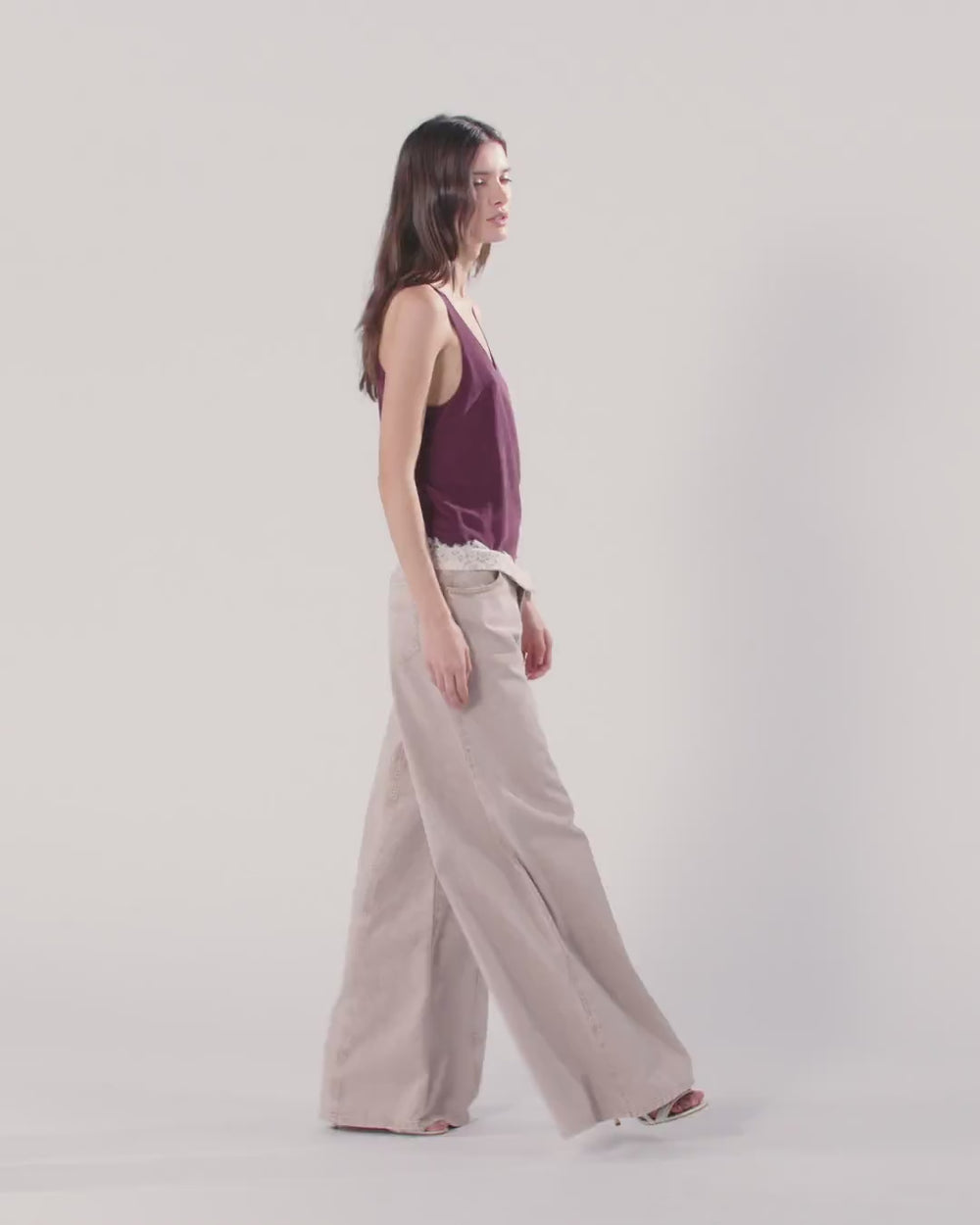 Jean cinq poches super wide leg en bull denim de coton marron à l'effet décoloré saisissant orné de dentelle crème à l’intérieur de la taille. La fermeture zippée et le bouton intérieur permettent de porter ce modèle de deux façons : taille haute pour un look monochrome ou à taille rabattue laissant entrevoir la dentelle pour une touche d'originalité raffinée dans le plus pur style PINKO. - WINONA WIDE LEG WAIST DOWN