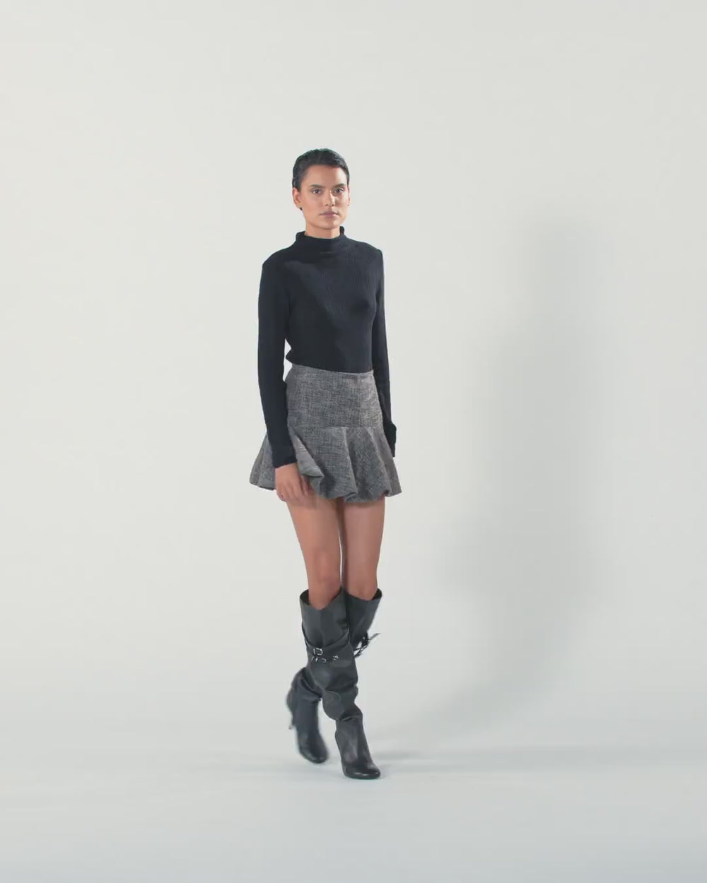 Jupe courte légèrement évasée à base volantée. Modèle en flanelle chaude et agréable au toucher avec motif tweed classique et doublure en jersey pour plus de confort. Fermeture zippée invisible au dos. Ce modèle s’accorde parfaitement avec la veste assortie pour un look féminin.