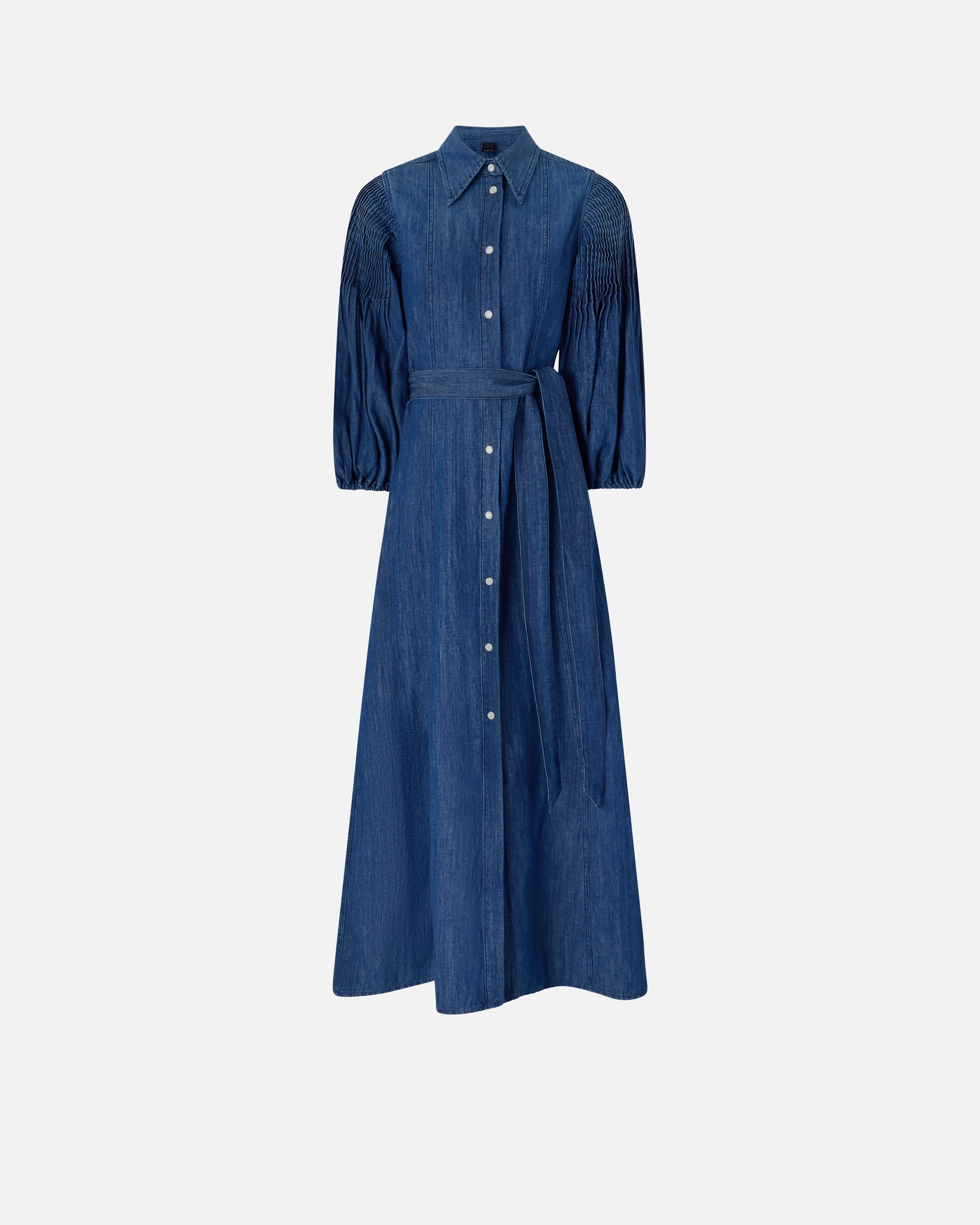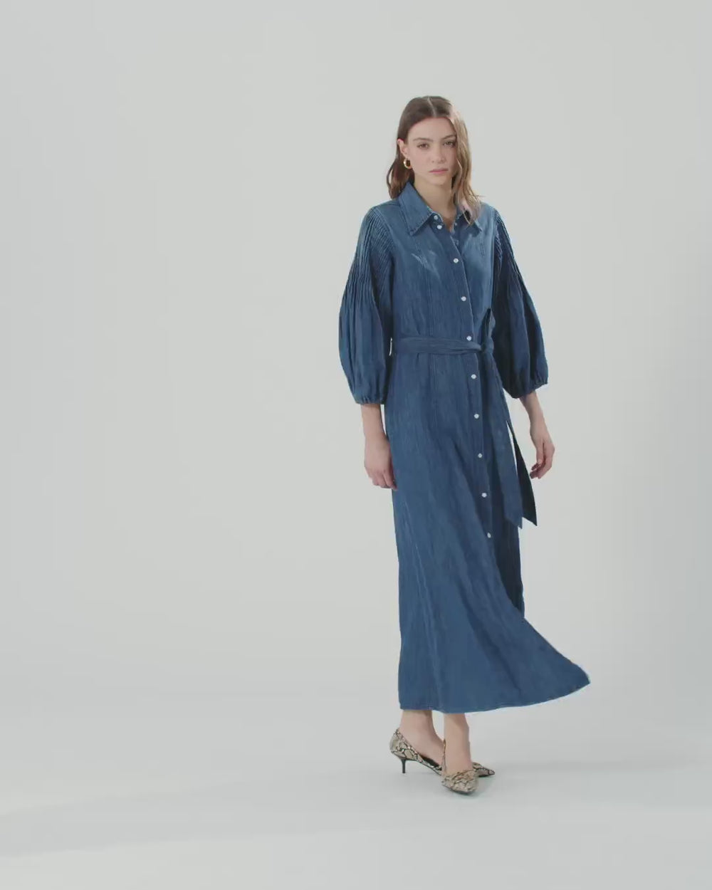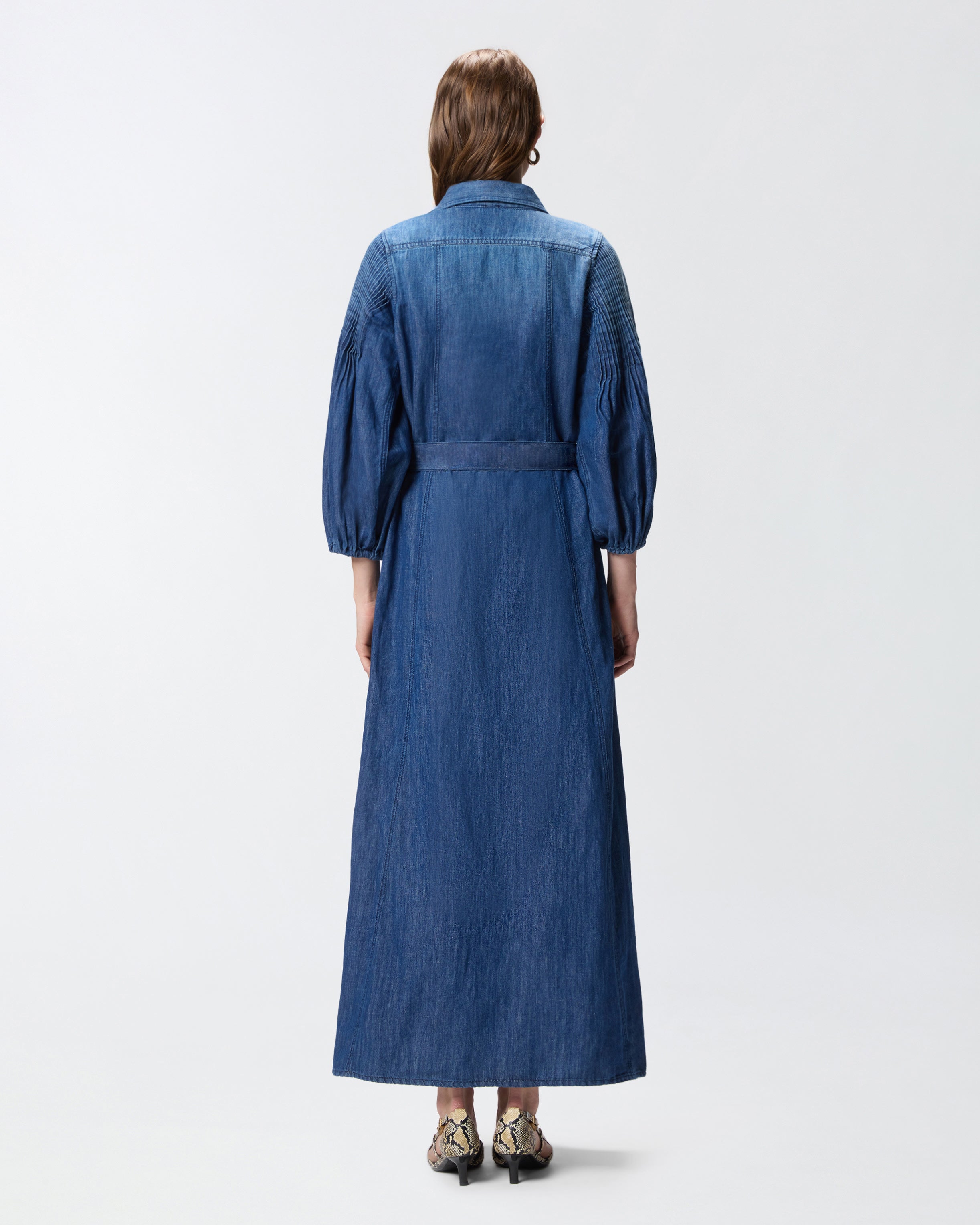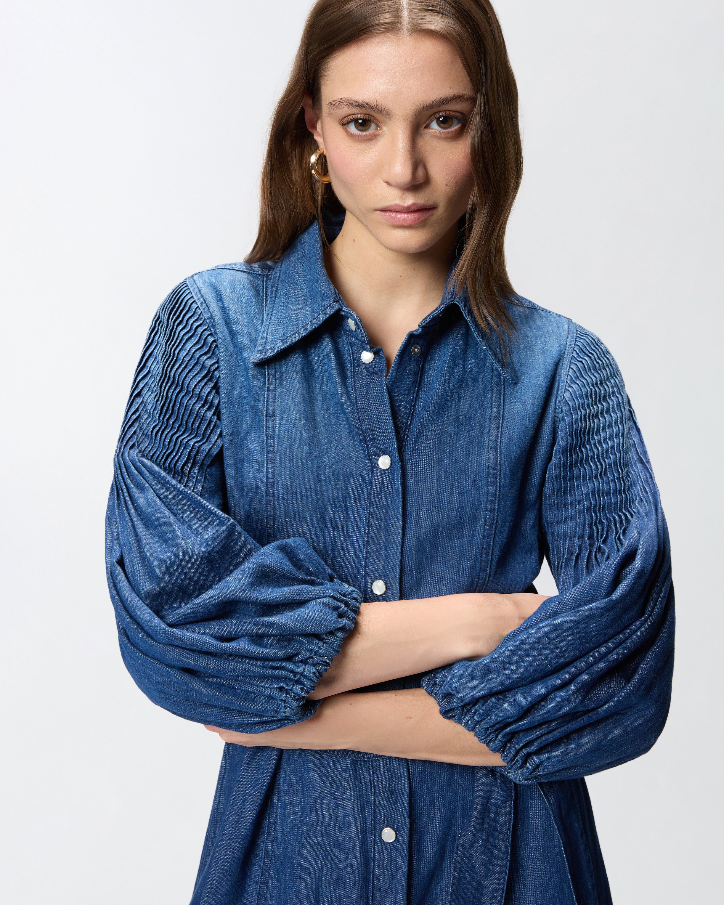 Robe chemise longue à col chemise, larges manches longues ballon smockées en haut à poignets élastiqués et jupe légèrement évasée. Ce modèle, doté d’une fermeture boutonnée sur le devant et d'une ceinture assortie à nouer à la taille, est fabriqué en denim léger de lin et coton agrémenté de contrastes et de décolorations, un tissu confortable et léger pour accompagner vos tenues quotidiennes.
