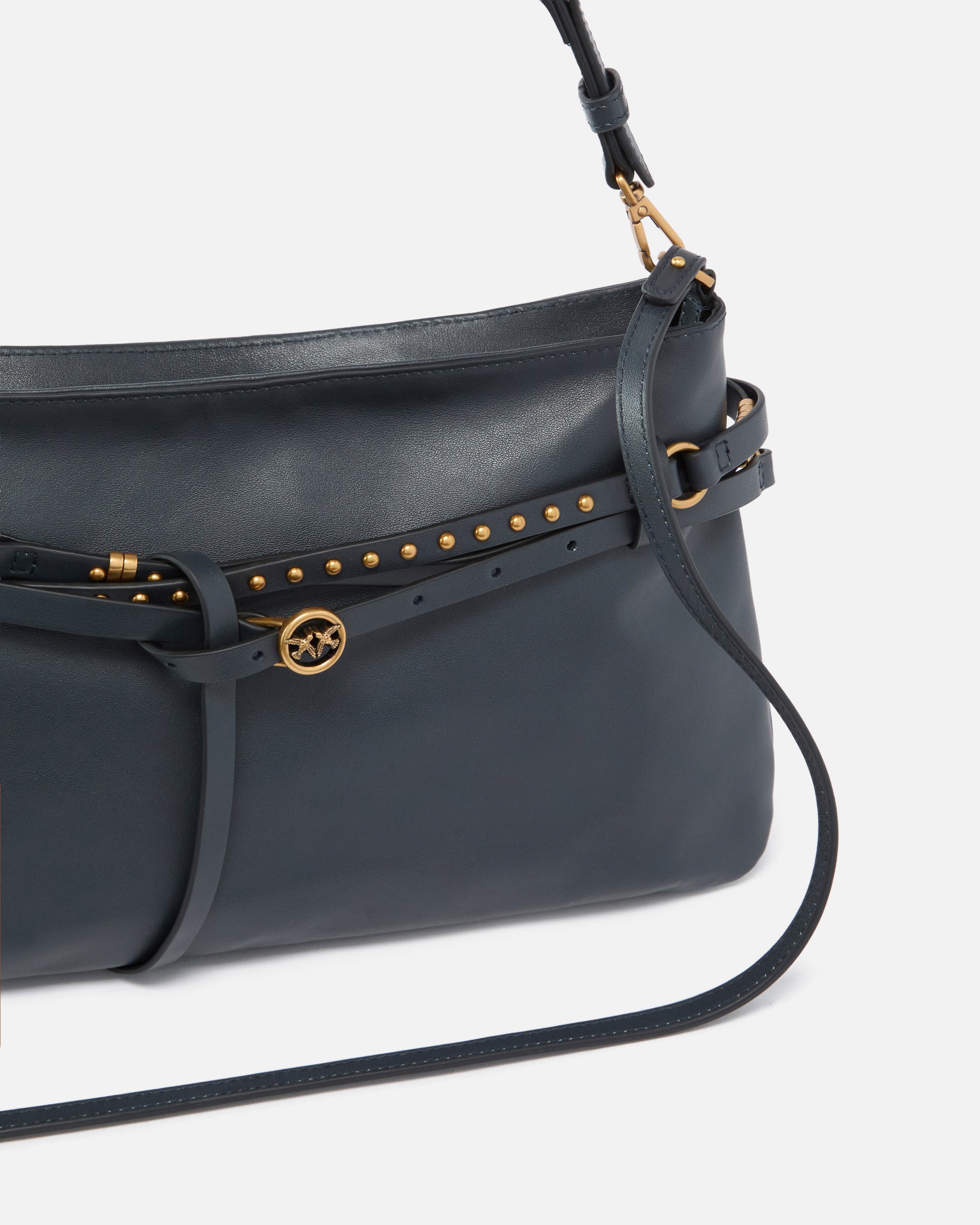 Sac trapèze plat moyen Belt Bag en cuir souple. Modèle orné d’une fine ceinture assortie et réglable enroulée autour de la partie supérieure, rehaussée de clous arrondis, d’une petite boucle ronde agrémentée de l’emblématique logo Love Birds et d’anneaux décoratifs en métal formant le logo PINKO. Les deux bandoulières amovibles en cuir, une plus courte et l’autre plus longue, offrent un porté épaule ou bandoulière confortable, tandis que la fermeture zippée s’ouvre sur un intérieur doublé de drill de coton et doté d’une poche plaquée pratique à plaquette logotée. Activez votre sac PINKO : vérifiez l’authenticité de votre article et accédez à une expérience personnalisée en approchant votre smartphone de la broderie Love Birds à l’arrière du sac !