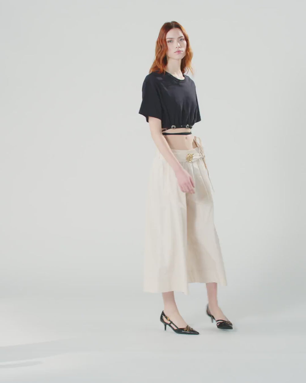 T-shirt cropped à manches courtes en jersey double de pur coton doux et compact au toucher. Modèle doté d’un bas élastiqué avec un lacet à enrouler autour de la taille et à nouer au gré de vos envies, rehaussé de micro-clous et de boucles à passant d’inspiration western avec une finition couleur argent vieilli. Portez ce t-shirt avec le pantalon assorti pour un look estival qui ne laisse rien au hasard.