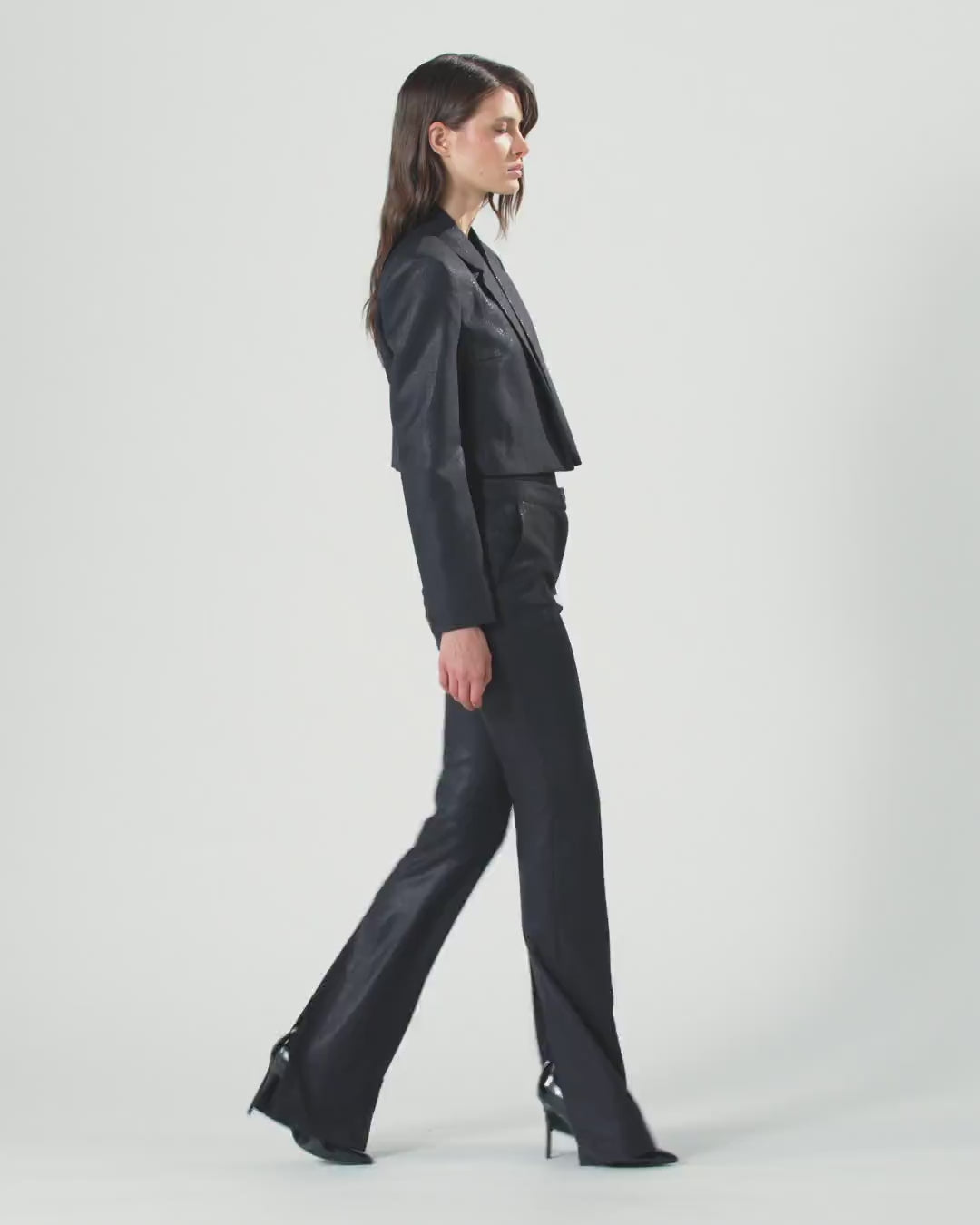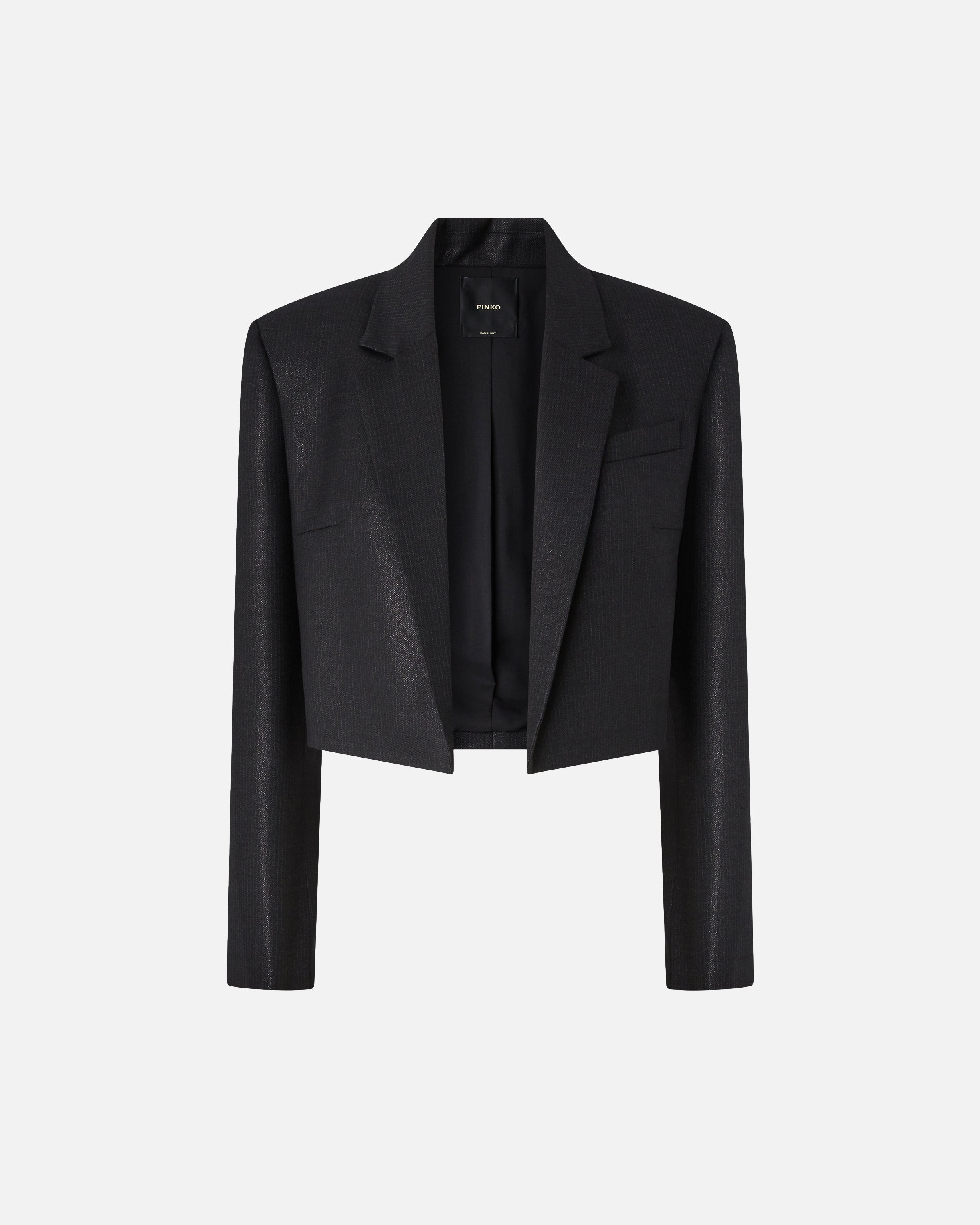 Veste spencer ajustée en tissu de laine mélangée classique orné d’un fil fin métallisé créant un effet rayé très délicat et légèrement chatoyant sous la lumière. Modèle couture bord à bord avec épaules structurées, col à revers et poches poitrine asymétriques. À porter avec la jupe ou le pantalon assorti pour un total look glamour qui fera de vous l’objet de tous les regards.