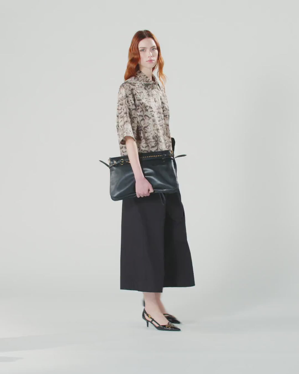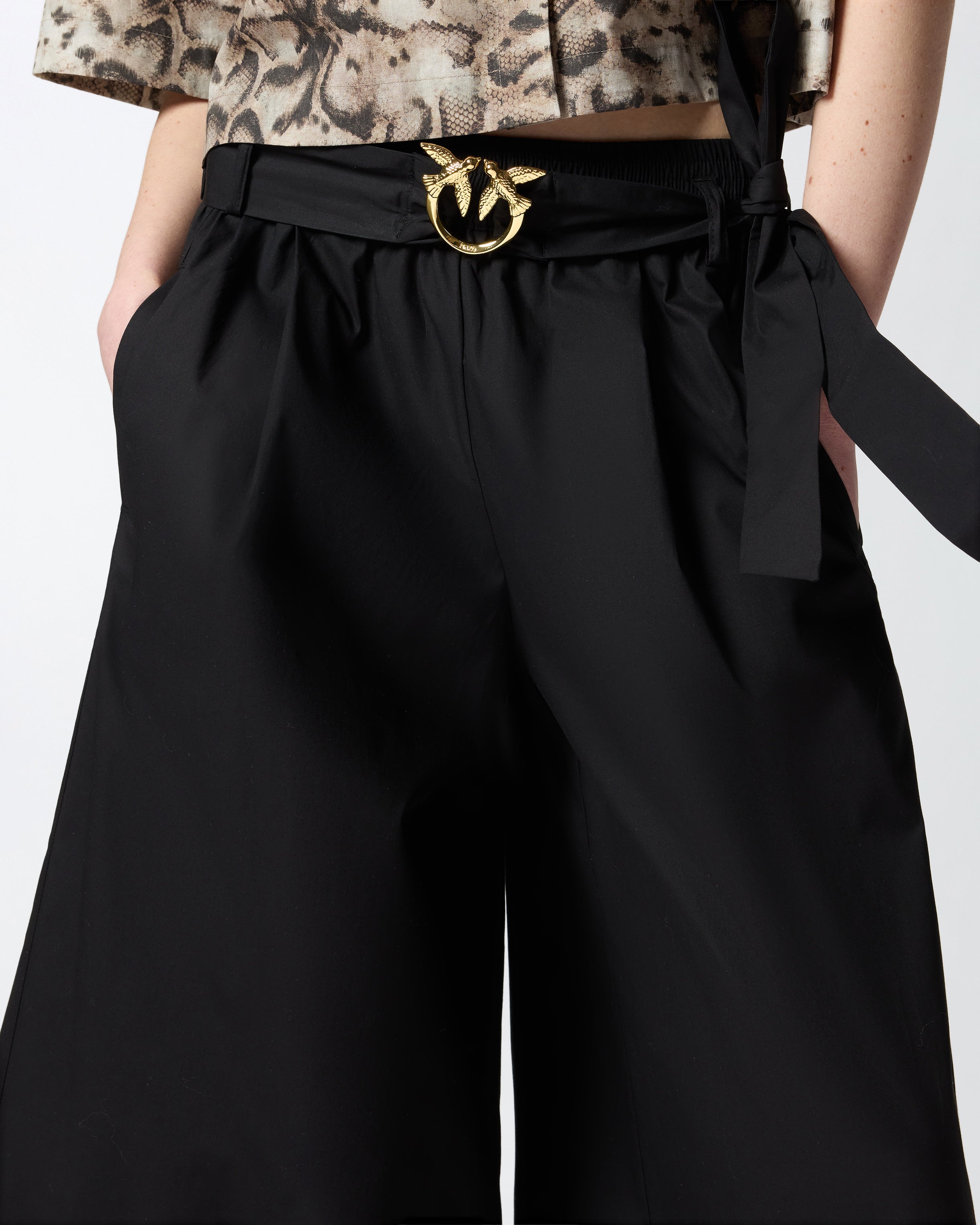 Bermuda long avec une jambe légèrement évasée en popeline de coton stretch confortable et fraîche. Ce modèle présente une taille élastiquée et des pinces raffinées sur le devant, et est complété par une ceinture en tissu assorti caractérisée par une boucle dorée avec l’emblématique logo Love Birds Diamond Cut. Sa grande polyvalence en fait un incontournable de la garde-robe féminine estivale.