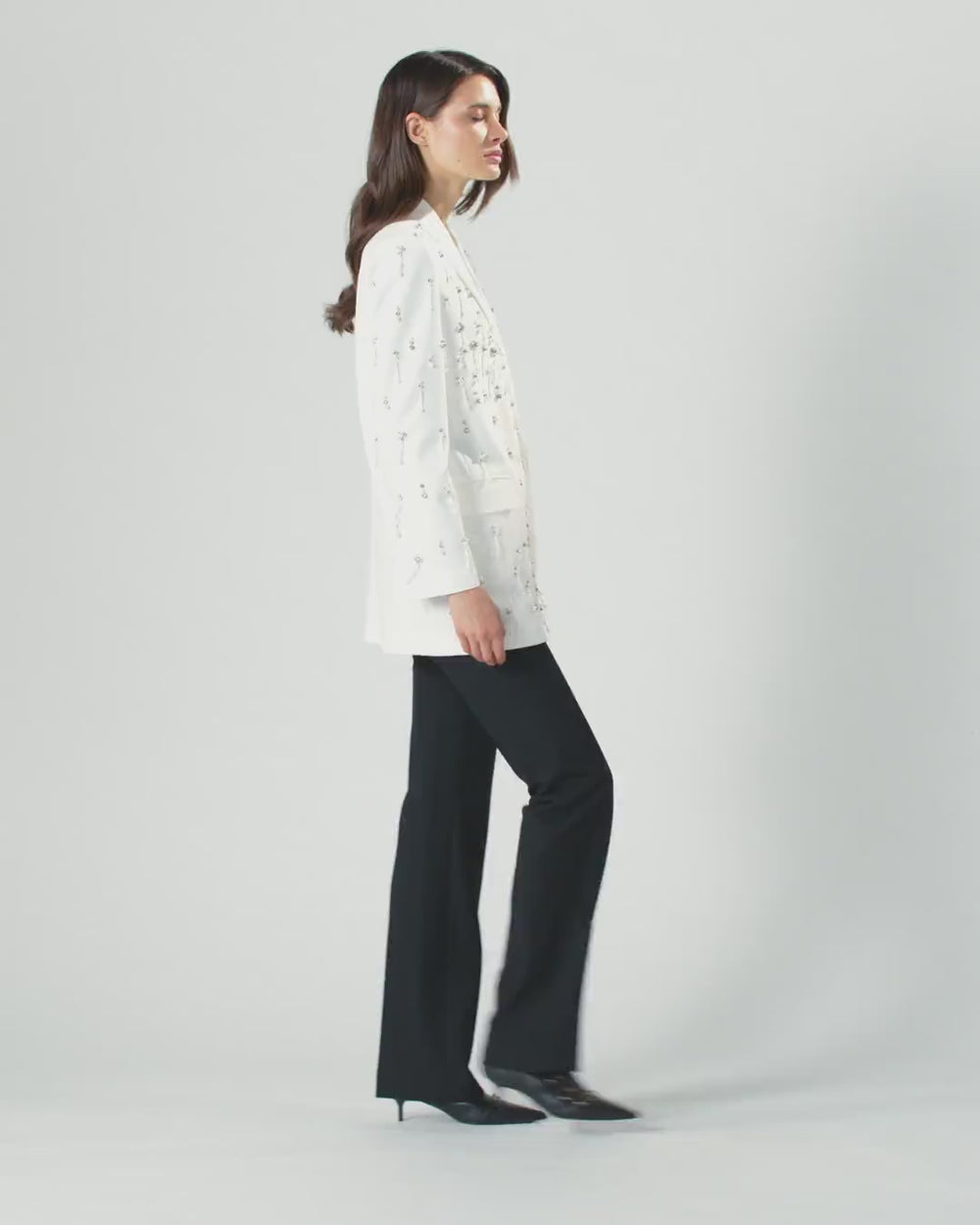 Blazer coupe droite avec bouton invisible, poches avant et poche poitrine, en fine polyviscose. Alliance parfaite d'élégance et de savoir-faire artisanal, ce modèle est orné de cristaux et de perles scintillants sur le devant et les manches : en plus d'offrir une luminosité incomparable, ils lui confèrent une fluidité et une allure contemporaine. Sa coupe élégante et ses finitions soignées font de cette veste une pièce unique, idéale pour les soirées spéciales et les occasions spéciales.