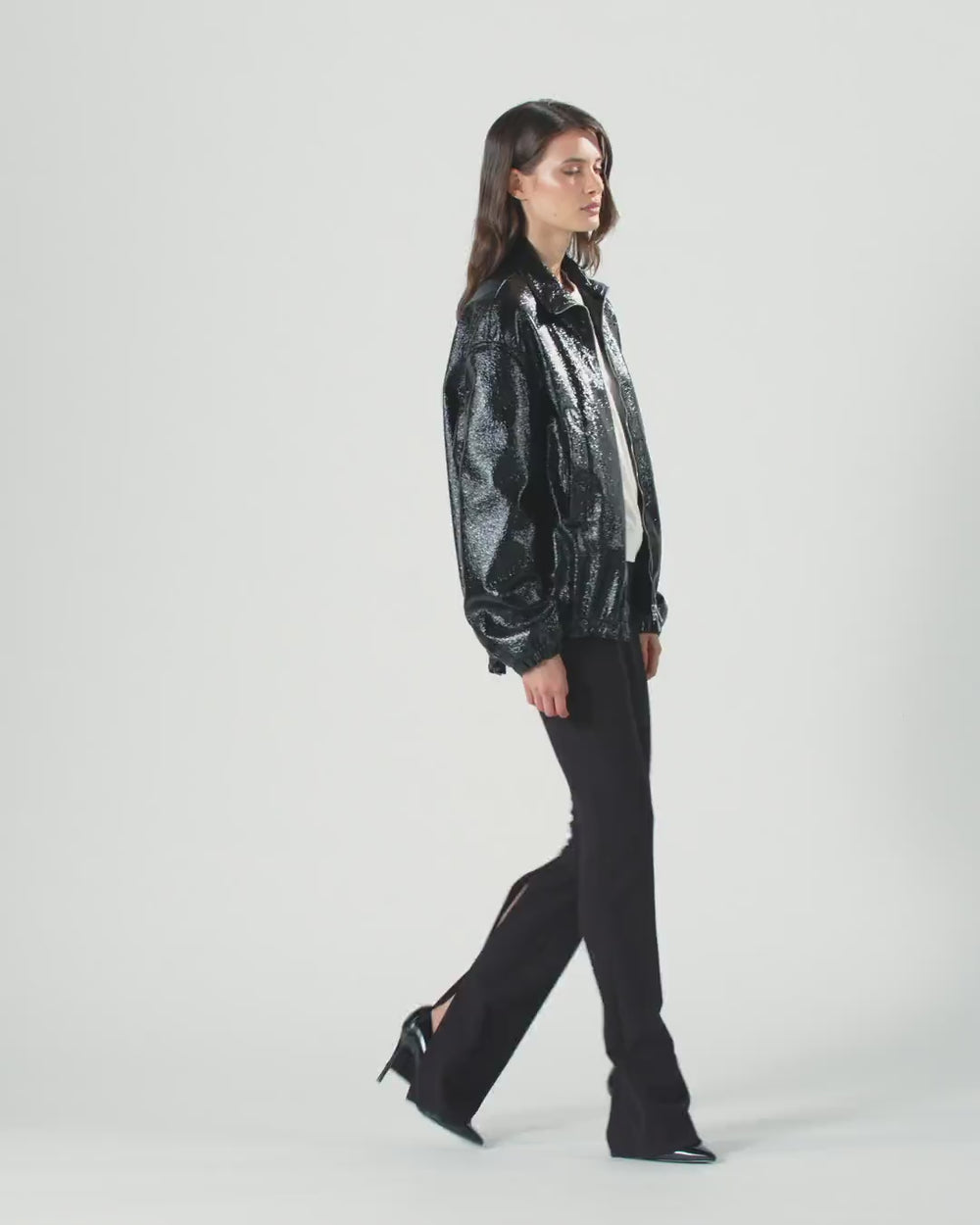 Bomber en jersey enduit effet vernis, chaud et agréable au toucher, avec doublure douillette en polaire. Avec sa coupe oversize dotée d’un col officier, d’une fermeture zippée et de poches latérales, ce modèle pratique est parfait pour apporter une touche audacieuse à vos tenues quotidiennes.