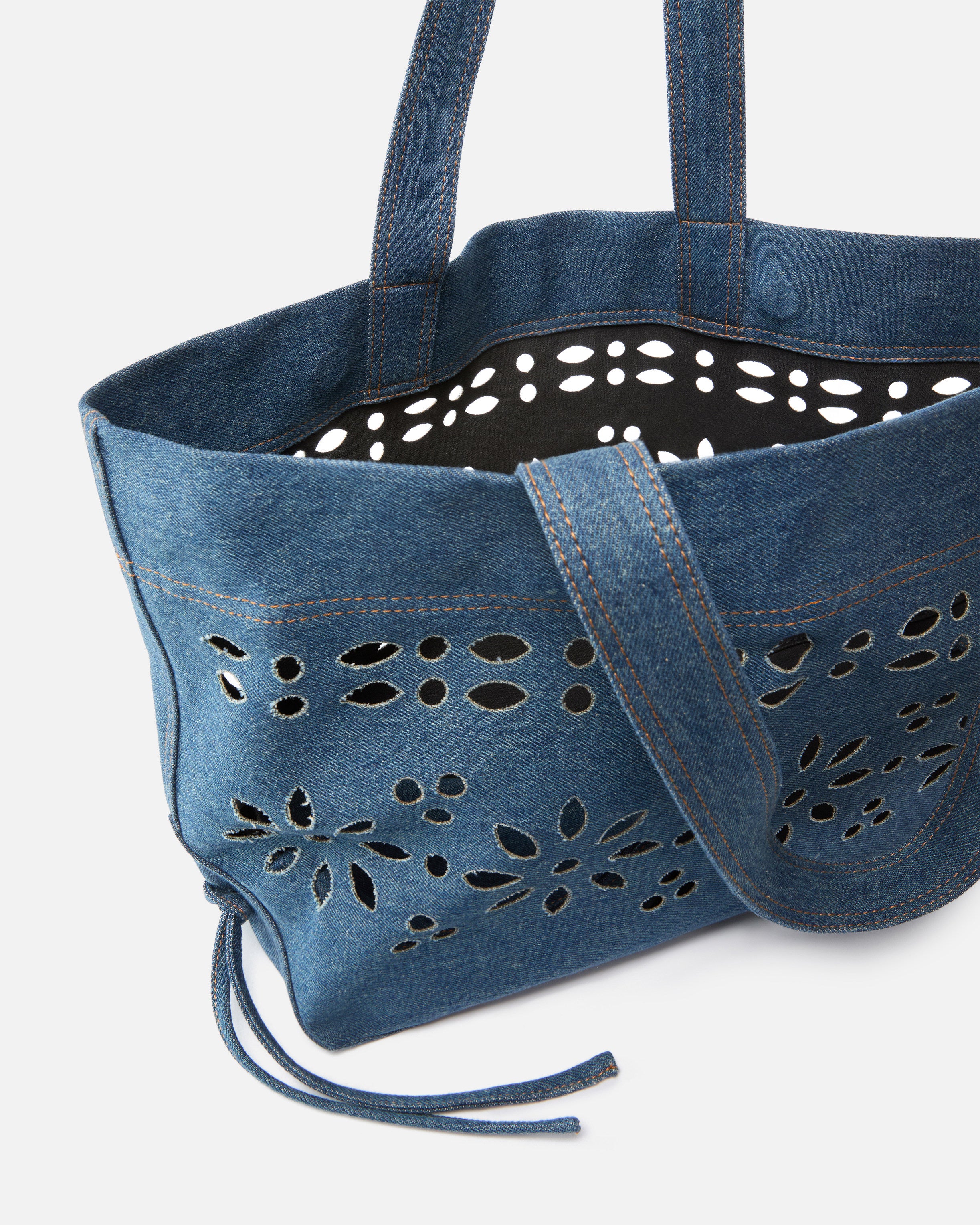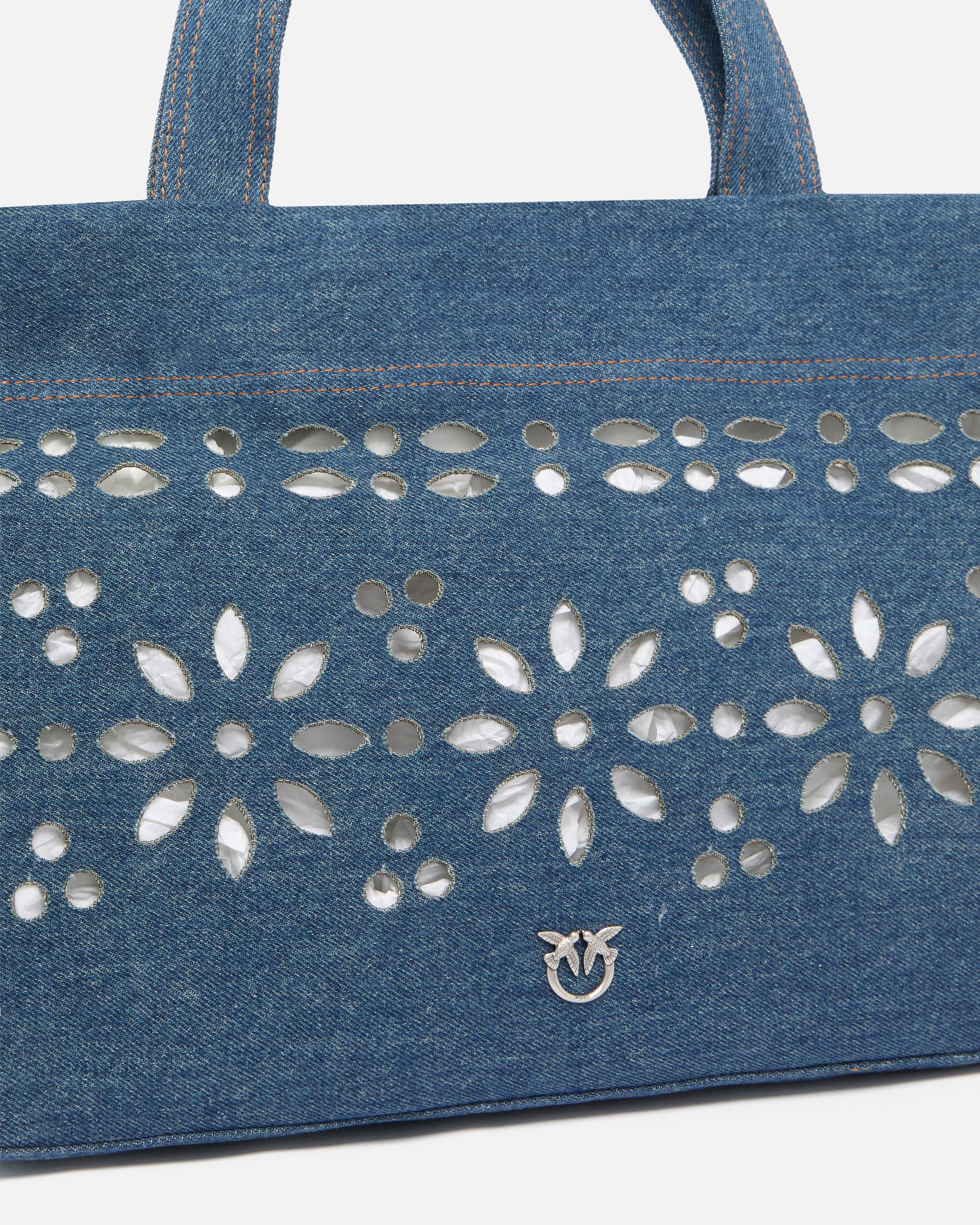 Cabas rectangulaire moyen en denim découpé au laser caractérisé par un motif floral ajouré raffiné inspiré de la broderie anglaise. Doté de deux anses supérieures pratiques pour un porté épaule, ce modèle est rehaussé de liens en bas sur les côtés et d'une plaquette en métal représentant l'emblématique logo Love Birds Diamond Cut sur le devant. Cet accessoire, parfait pour emporter vos essentiels avec vous tout au long de la journée, est la solution que vous recherchiez pour ajouter une touche de couleur à vos tenues sans renoncer à la fonctionnalité. Activez votre sac PINKO : vérifiez l’authenticité de votre article et accédez à une expérience personnalisée en approchant votre smartphone de la broderie Love Birds à l’arrière du sac !