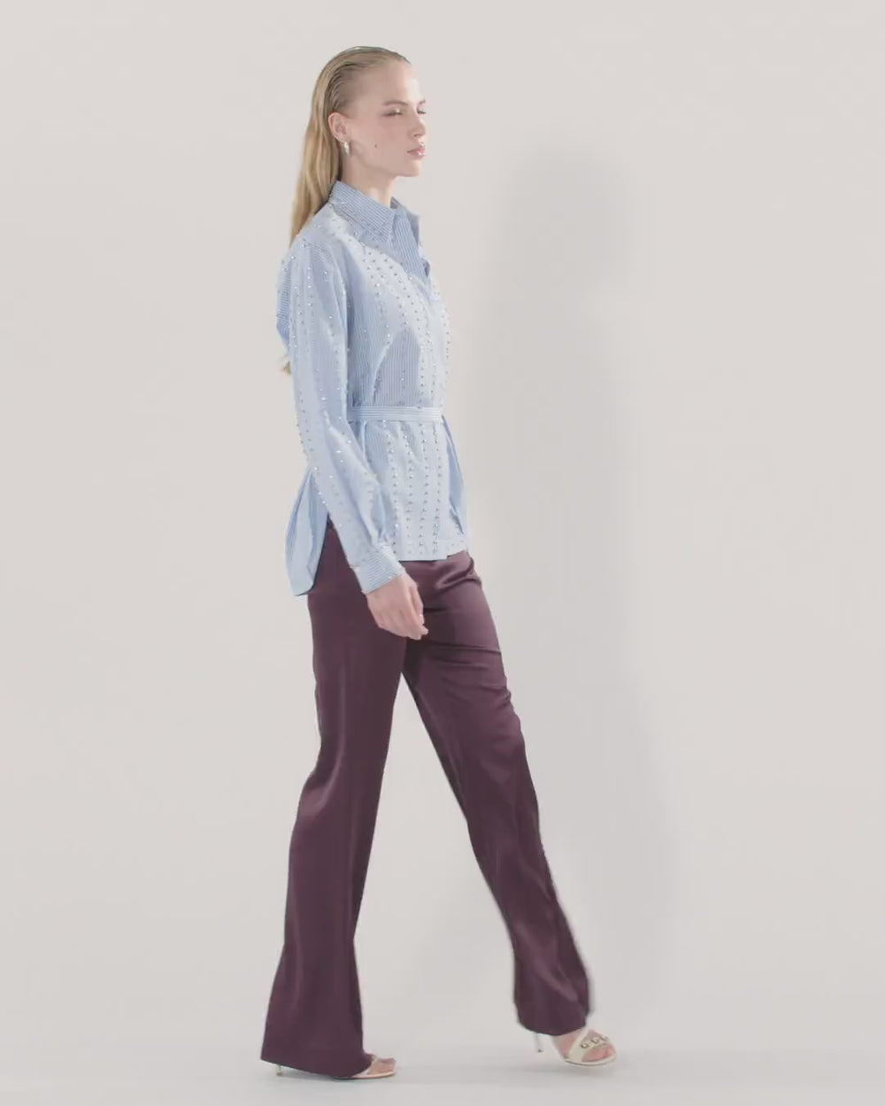 Chemise oversize en popeline de coton teinte en fil à col classique, manches longues à poignets boutonnés, boutonnage sous patte sur le devant à l’exception du premier bouton et ceinture à la taille à ajuster et à nouer selon vos envies. Modèle à rayures verticales bleues et blanches, surmontées d'un autre motif à rayures obtenu par l'alternance de petits cubes métalliques et de cristaux sertis brodés à la main, que l’on retrouve également sur tout le bord du col. Grâce à son motif polyvalent et à sa décoration raffinée, ce vêtement deviendra une pièce incontournable pour composer des looks toujours différents. - CARLEY SHIRT