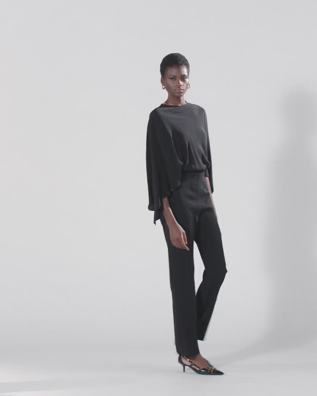 Combinaison caractérisée par un pantalon long et droit avec un pli marqué sur le devant et le dos, et par une partie supérieure avec de larges manches chauve-souris, une encolure légèrement bateau sur le devant et un profond décolleté à l’arrière qui laisse le dos nu. Ce vêtement présente un design bi-matière qui crée un contraste de textures raffiné, combinant un tissu crêpe plus technique et texturé pour le pantalon et un tissu crêpe de Chine doux en soie mélangée pour la partie supérieure. Pour ce modèle au design élégant monochrome, PINKO propose une personnalisation raffinée et féminine : un fin collier amovible avec de petites boules métalliques à faire retomber au milieu du dos. Cette combinaison élégante est fermée par une fermeture zippée invisible sur le côté, qui garde la silhouette épurée et la rend parfaite pour les cérémonies et les soirées spéciales qui exigent un code vestimentaire élégant.
