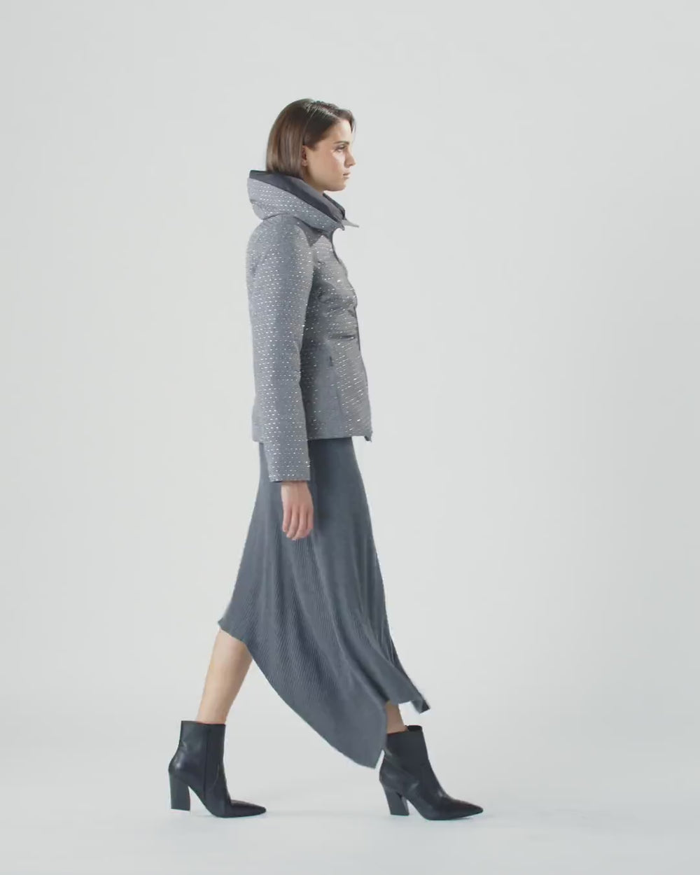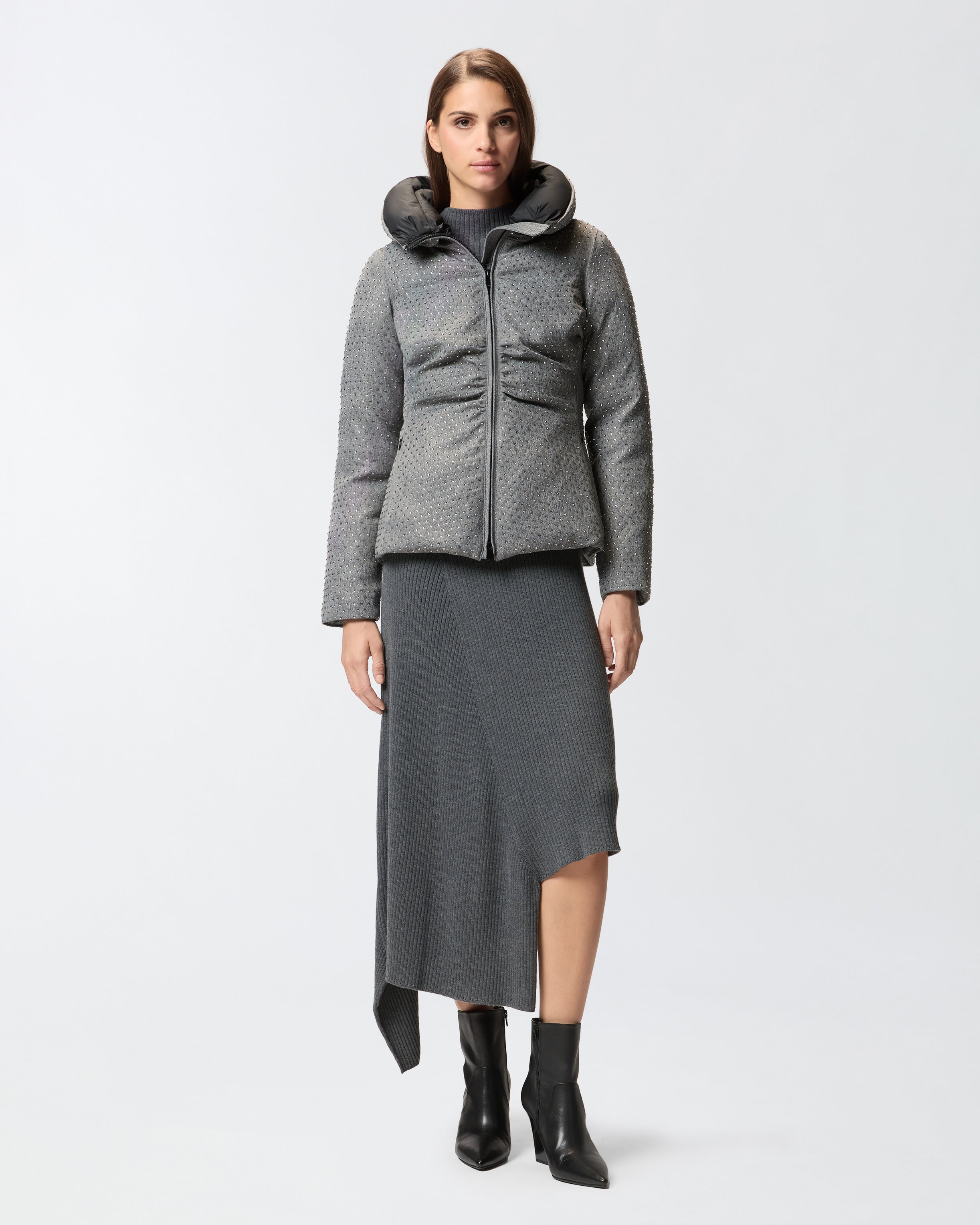Doudoune courte avec col montant enveloppant, poches latérales et fermeture zippée intégrale à double curseur. Une doudoune pratique au style féminin et raffiné grâce à ses fronces et à ses mini strass all-over, qui reflètent l'ADN PINKO. Un modèle idéal pour affronter les premiers froids avec une touche de style sans renoncer au confort.