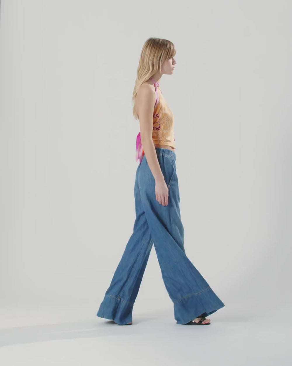 Pantalon large et légèrement évasé en denim de lin et coton, léger et confortable au toucher à délavage stone wash pour un effet vintage. Modèle avec fermeture zippée invisible sur le côté pour faciliter l’enfilage. Un basique revisité par PINKO pour créer des tenues quotidiennes à la fois fonctionnelles et féminines.