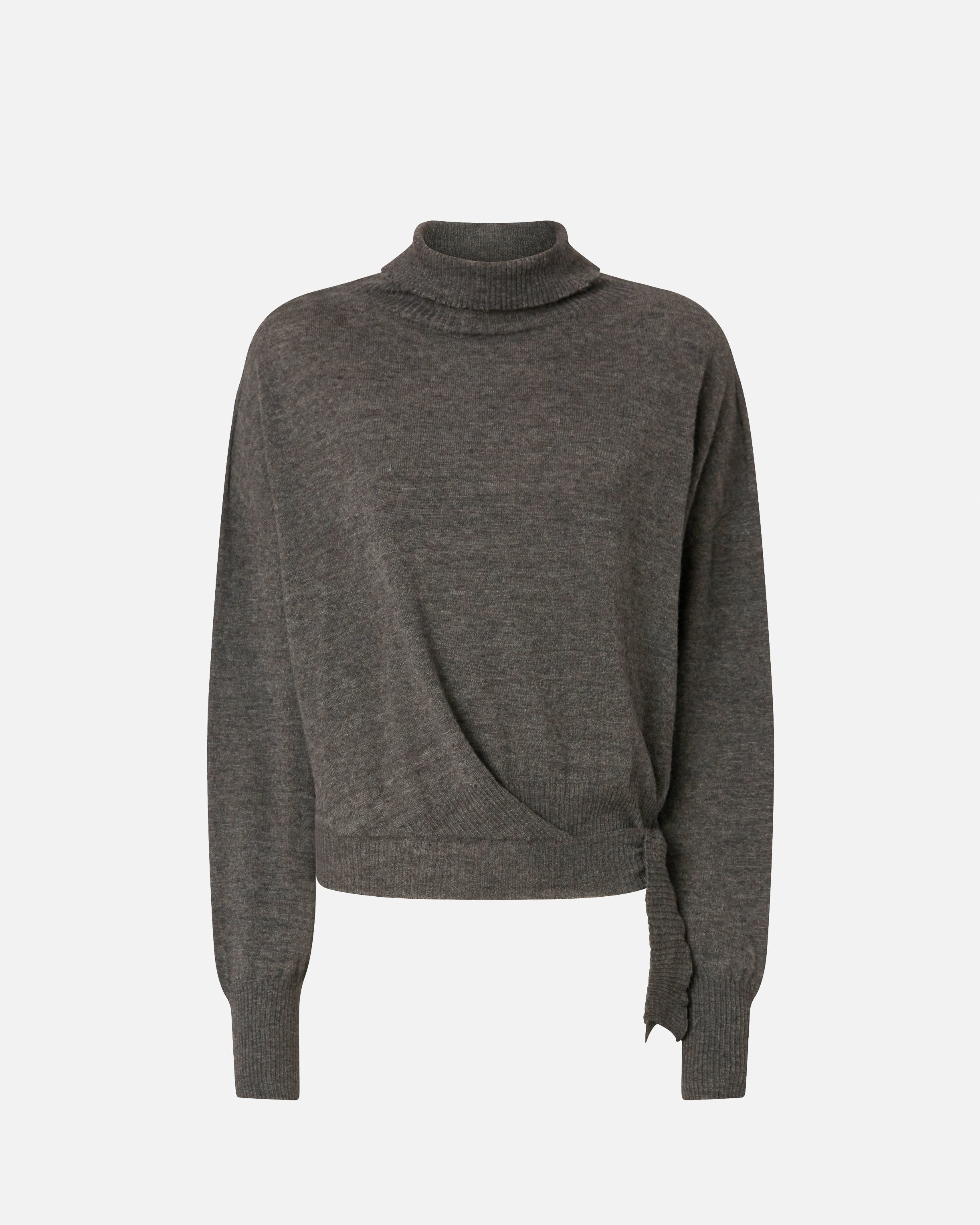 Pull à roulé à manches longues en laine et alpaga, un fil ultra-doux Made in Italy agréable à porter et qui offre une sensation de douceur au toucher. Coupe croisée sur le devant, à nouer façon chaud-cœur, créant un effet drapé raffiné. Finitions bords-côtes au col, aux poignets et à la base et griffe de la maison ton sur ton sur la nuque pour la touche finale. Ce modèle a été traité pour minimiser le risque de boulochage et offrir plus de douceur et de durabilité.