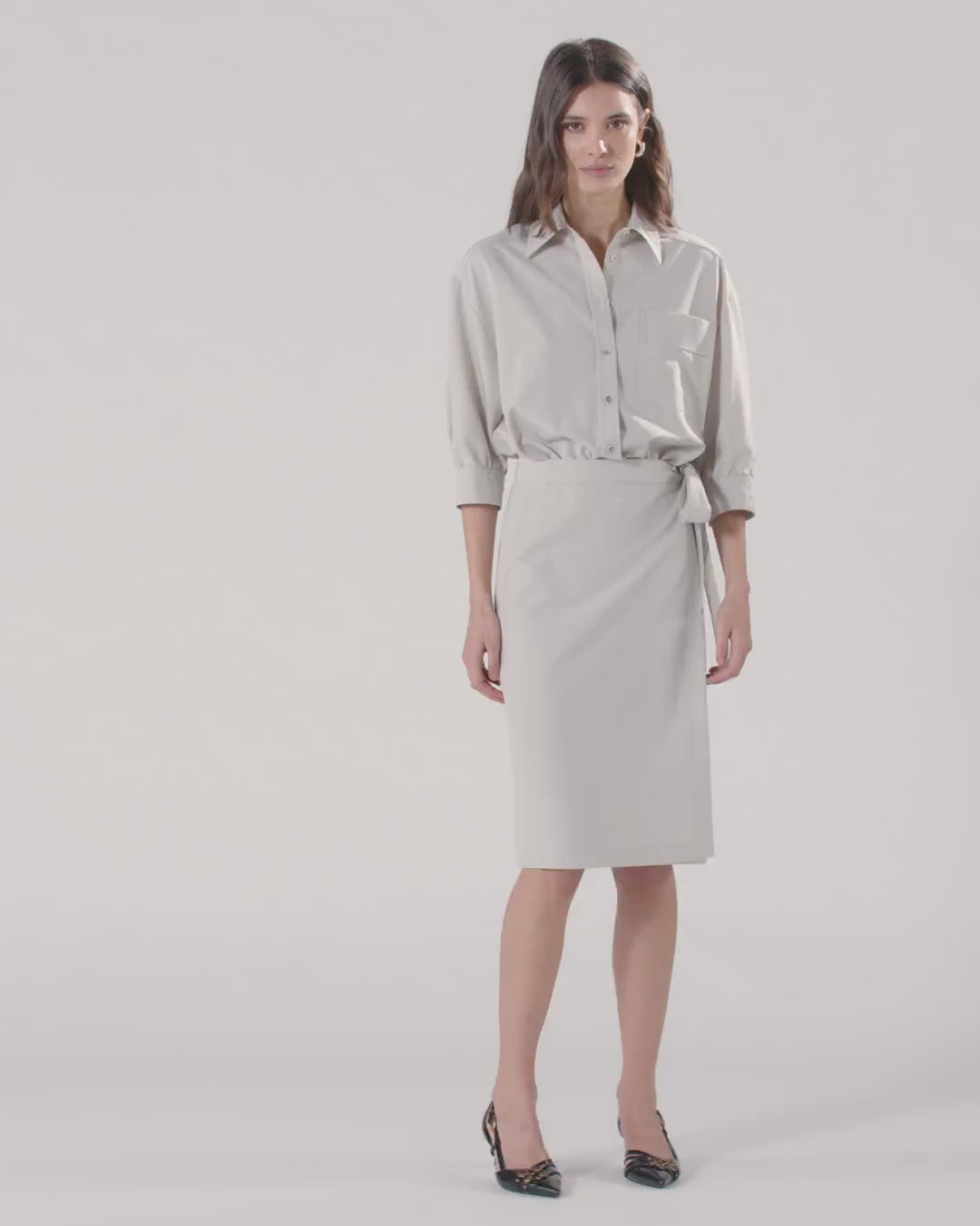 Robe midi en tissu fluide de viscose, idéale pour accompagner la silhouette sans forcer les mouvements. Ce modèle présente une partie supérieure plus large et plus fluide, caractérisée par un design chemise à col classique, des manches trois-quarts boutonnées sur le bas, une patte de boutonnage sur le devant et une poche plaquée sur le côté gauche, tandis que la jupe, au design plus élégant, se distingue par sa coupe ajustée à fermeture portefeuille à nouer sur le côté. Grâce à sa polyvalence, cette robe se prête à être portée à plusieurs occasions : il vous suffira de changer de chaussures et d’accessoires pour l’adapter à des événements un peu plus formels ou à des soirées décontractées entre amis. - ARIANE DRESS