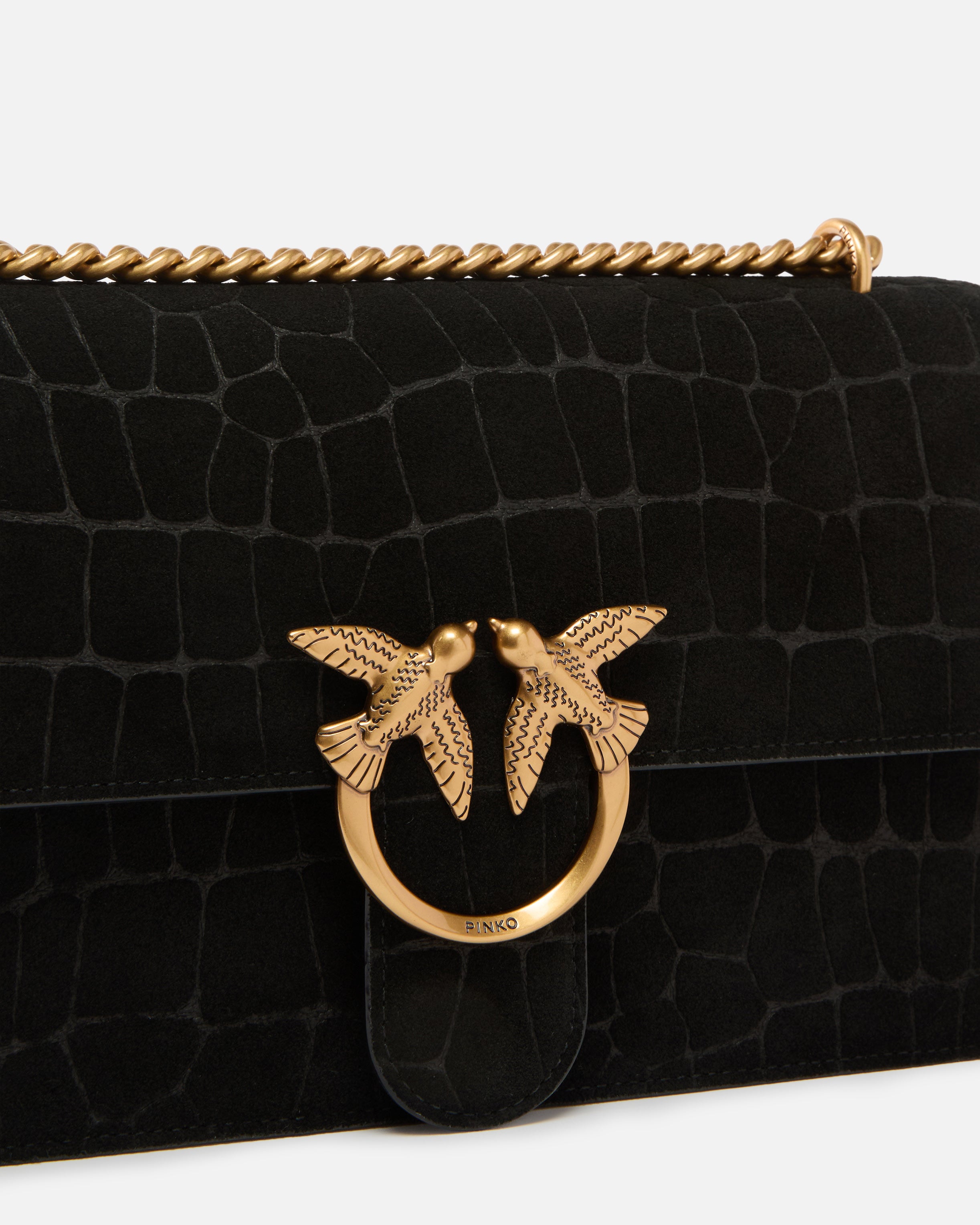 Sac moyen Love Bag One en nubuck embossé crocodile. Modèle doté d’une bandoulière chaîne ronde avec patte d’épaule en cuir pour trois portés différents : main, épaule ou croisé. La fermeture à bouton magnétique est agrémentée de l’emblématique boucle Love Birds Diamond Cut et dévoile un intérieur doublé en drill de coton, doté de deux compartiments séparés par un compartiment zippé. Activez votre sac PINKO : vérifiez l’authenticité de votre article et accédez à une expérience personnalisée en approchant votre smartphone de la broderie Love Birds à l’arrière du sac !