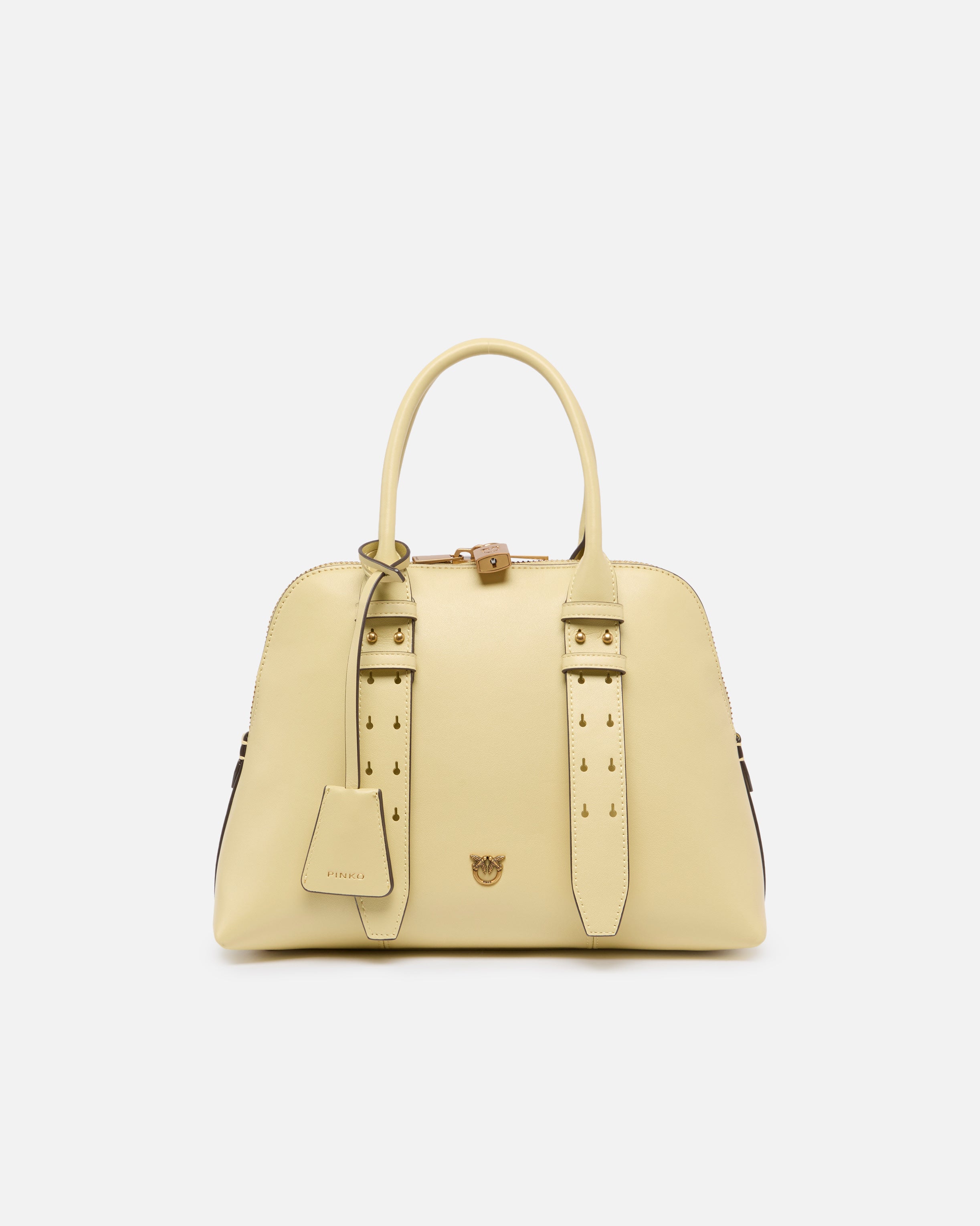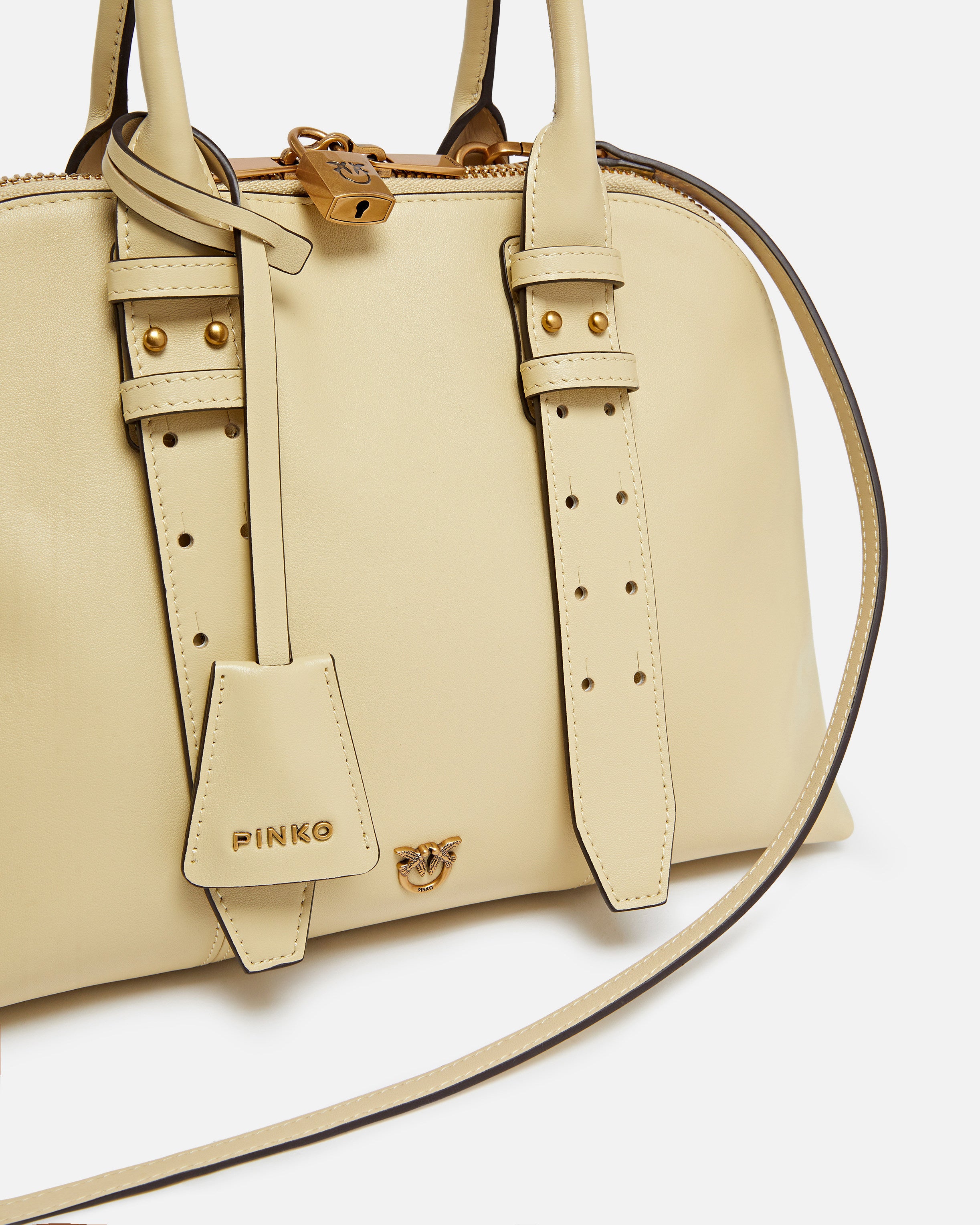Sac bowling moyen Escape Bag en cuir souple. Modèle ultra-polyvalent et pratique avec bandoulière réglable et amovible en cuir et double anse pour un porté main ou épaule. Accessoire doté d’un cadenas fonctionnel pouvant être ouvert ou fermé grâce à la clé contenue dans la breloque assortie. La plaquette à logo Love Birds, symbole du style unique de la maison, apporte la touche finale. La fermeture zippée sur le dessus s’ouvre sur un intérieur doublé de coton et doté d'une poche plaquée, zippée elle aussi. Activez votre sac PINKO : vérifiez l’authenticité de votre article et accédez à une expérience personnalisée en approchant votre smartphone de la broderie Love Birds à l’arrière du sac ! - BOWLING BAG MEDIUM