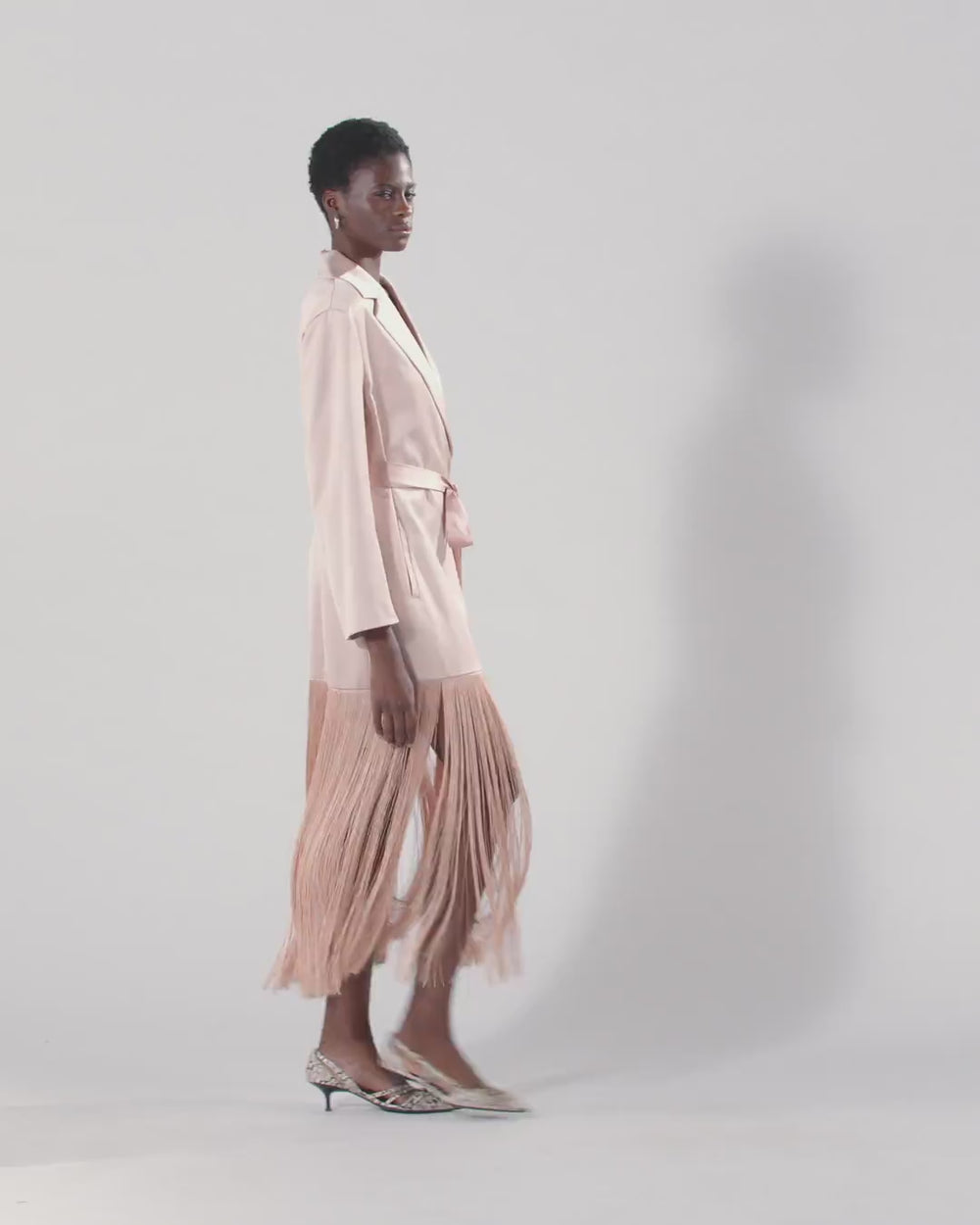 Trench long en satin doux et brillant à l'aspect soyeux avec large col à revers, fermeture croisée avec boutons-pression à l’intérieur et ceinture amovible à nouer à la taille. Coupe épurée rehaussée de longues et fines franges à la base et à l'extrémité de la ceinture pour un effet dynamique et sensuel à chaque pas. Idéal pour apporter une touche d'originalité dans le plus pur style PINKO à vos tenues quotidiennes, ce trench fera de vous l’objet de tous les regards.