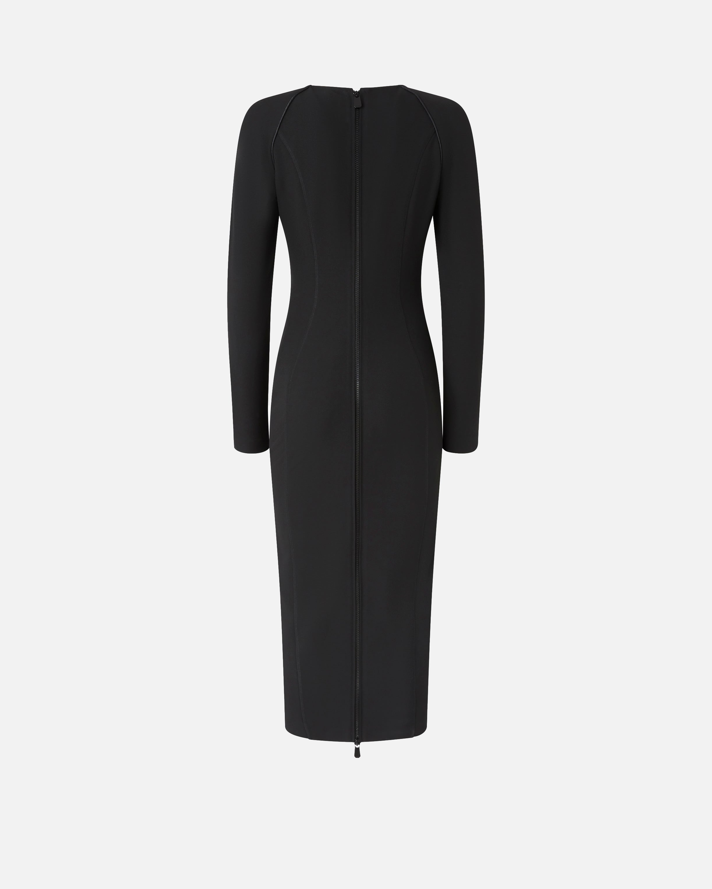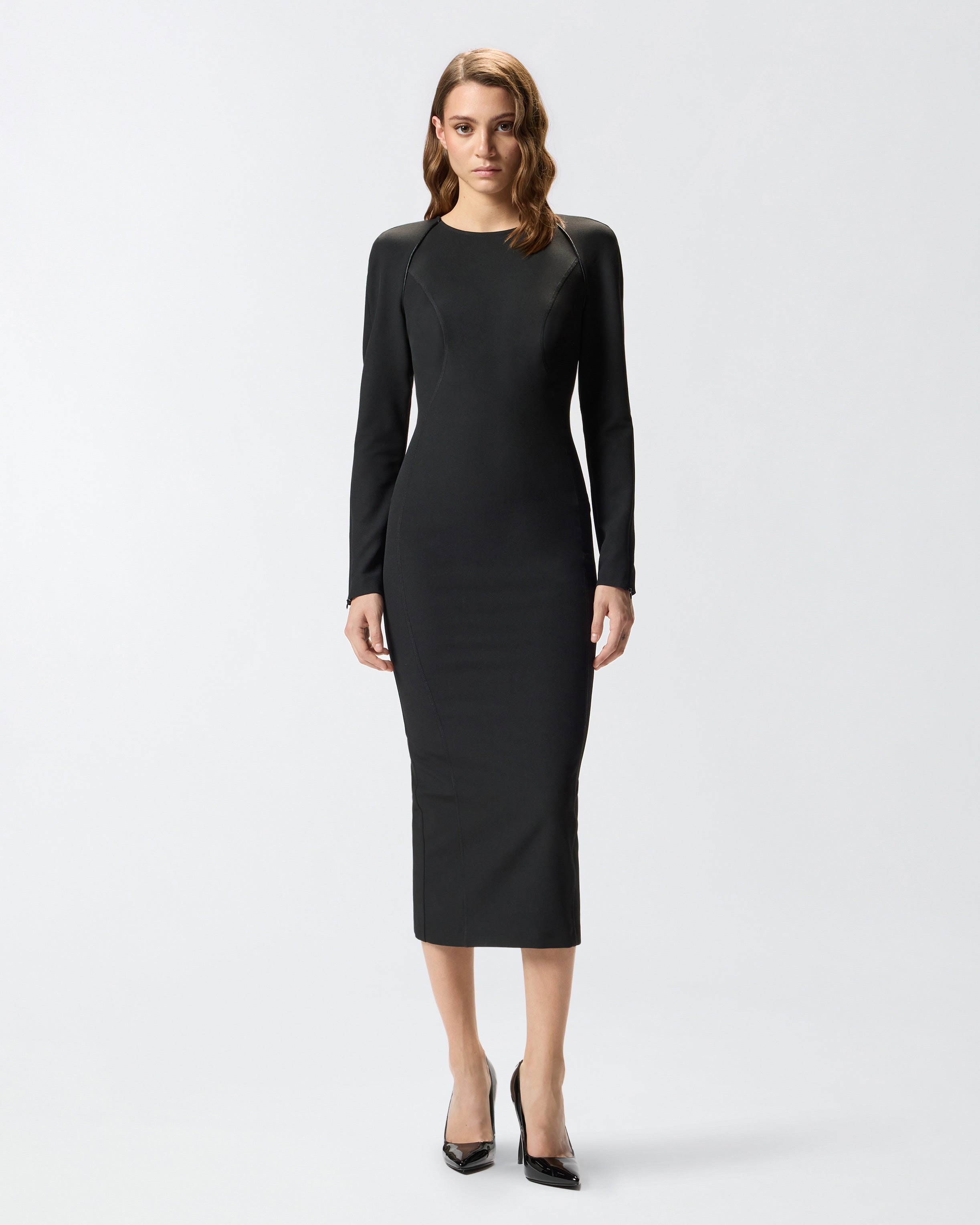 Abito midi dalla linea bodycon, aderente al corpo, con scollo tondo e maniche lunghe dotate di zip per un indosso personalizzato. Il crêpe di poly viscosa, un tessuto doppio particolarmente versatile e performante grazie alla costruzione bistretch, è stato sottoposto a trattamenti di alta qualità che permettono di ottenere un sofisticato aspetto laniero. Rifiniscono il vestito dettagli di piping a contrasto lungo le spalle. Chiusura posteriore con zip a doppio cursore.