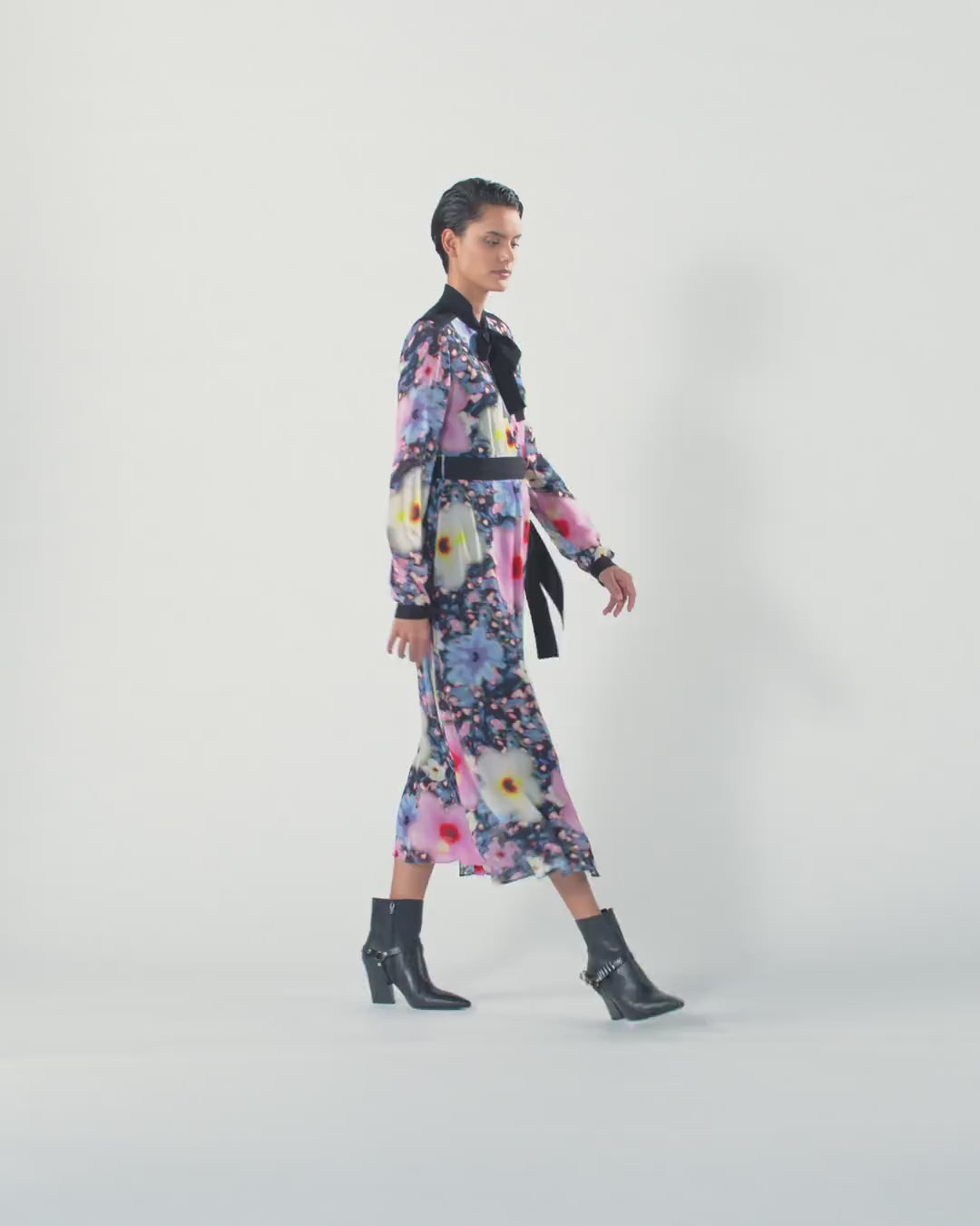 Abito chemisier lungo in georgette di viscosa con stampa floreale all-over. La stampa multicolore, realizzata con tecnica digitale, dona al vestito un look femminile, mentre i dettagli tinta unita di collo, carré, polsi e cintura creano un accattivante gioco di contrasti. Il modello presenta una vestibilità sfiancata, più aderente sui fianchi. Il collo si chiude davanti in un fiocco, così come la cintura rimovibile. Chiusura con bottoni a vista davanti. Modello foderato.