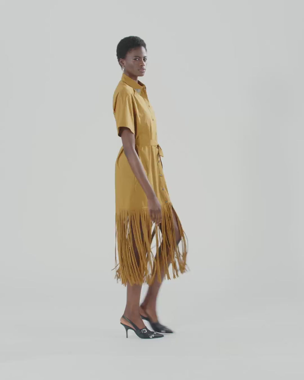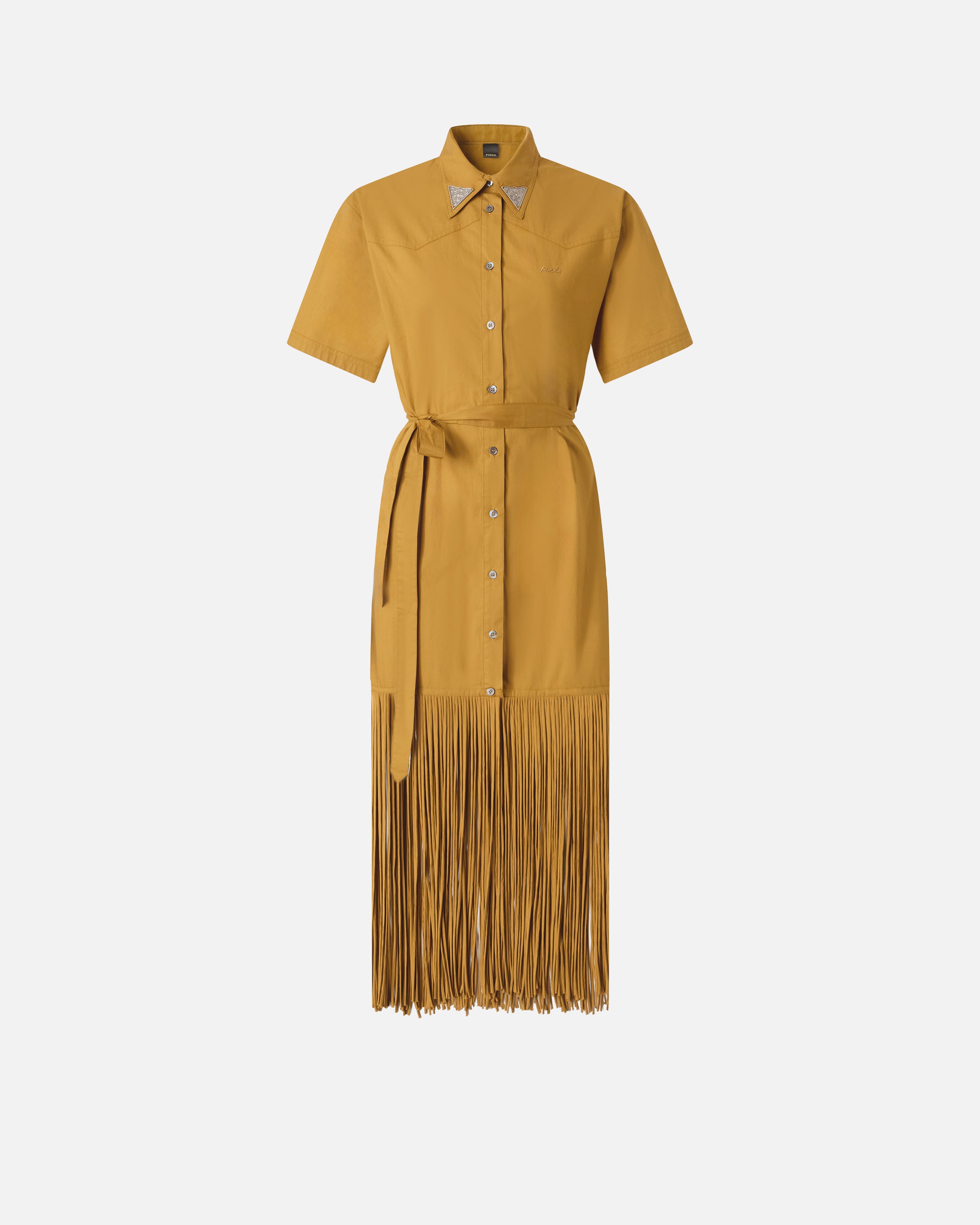 Abito lungo in popeline di puro cotone dalla mano fresca e piacevole, caratterizzato da un design chemisier con abbottonatura frontale a vista, mezze maniche e colletto stile camicia decorato da applicazioni metalliche d'ispirazione texana finemente lavorate. Il richiamo allo stile country è ben visibile anche nelle lunghe frange tubolari, realizzate in leggero tessuto voile di cotone, che profilano l'orlo accompagnando con naturalezza ogni tuo passo. Il vestito, perfetto per dare vita a look da sera originali e confortevoli firmati PINKO, è completato da un nastro rimovibile coordinato da annodare in vita, pensato per permetterti di personalizzare ancora di più lo styling finale.