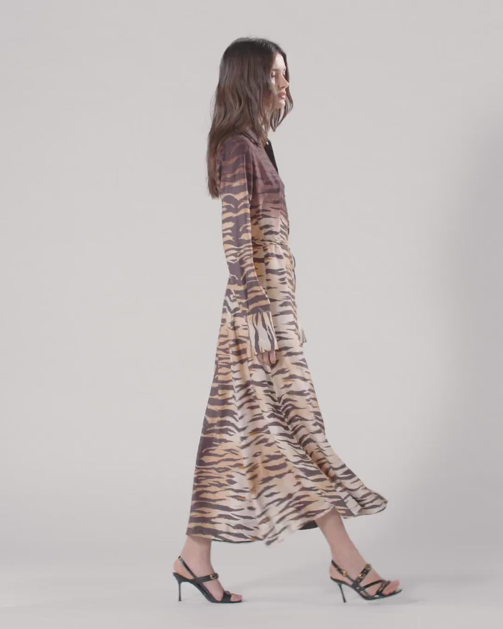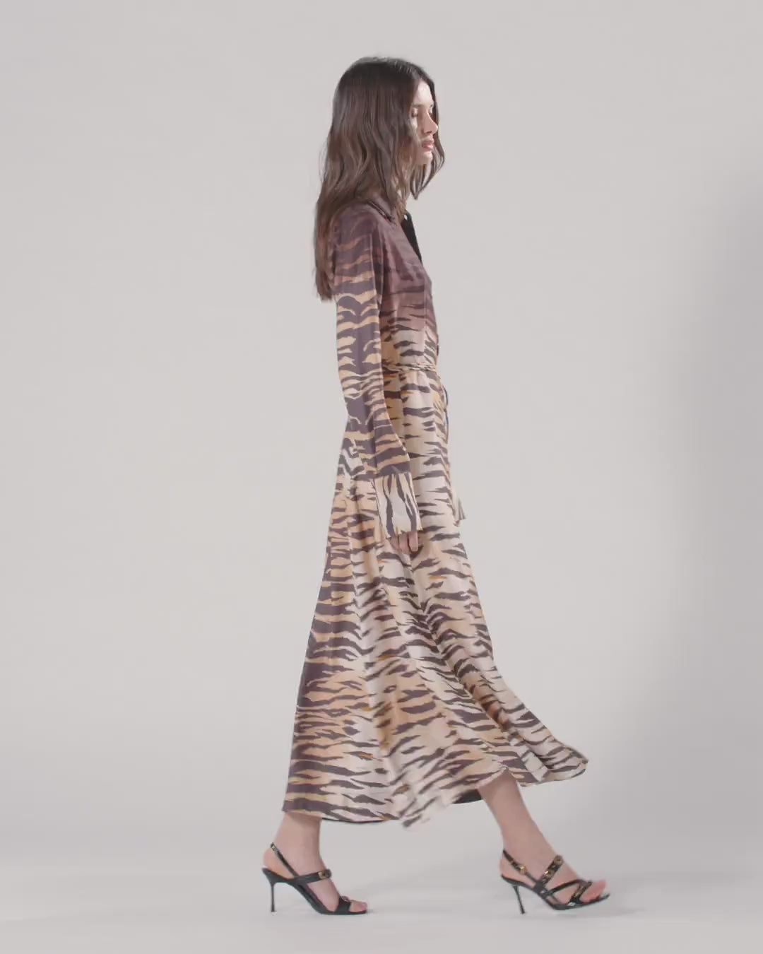 Abito chemisier lungo con gonna leggermente svasata, abbottonatura frontale, colletto a camicia, maniche con bottone sui polsi e sottile cintura in vita da annodare in base al proprio gusto. Realizzato in tessuto twill dalla mano fluida e lucente, particolarmente adatto anche per la stagione estiva, il modello si distingue per la seducente stampa animalier tigrata con parte superiore più scura dall'effetto sfumato, che viene piazzata a mano su ogni capo per trasformarlo in una creazione unica e inimitabile. Il vestito è completato dall'etichetta con logo lettering PINKO sul retro.