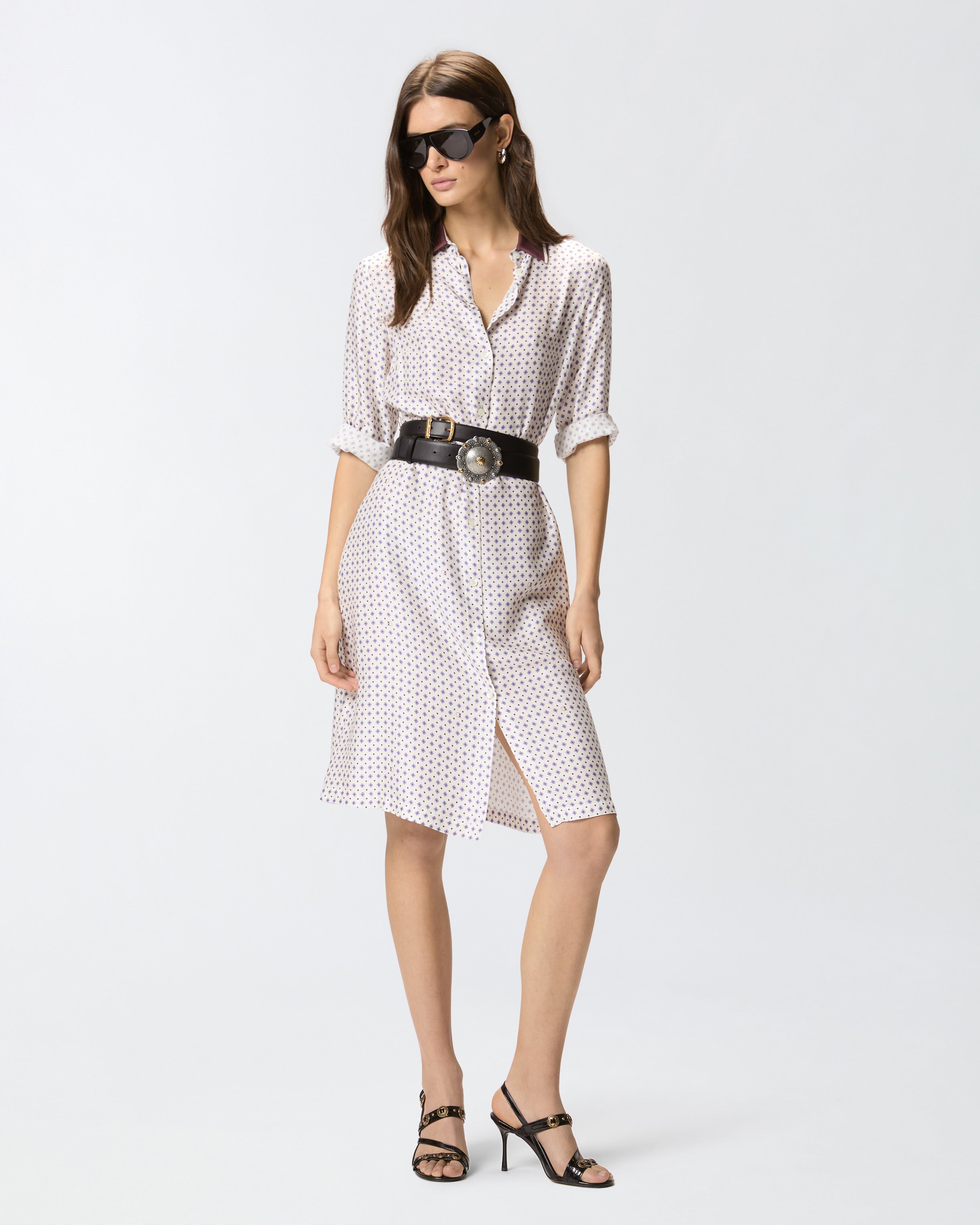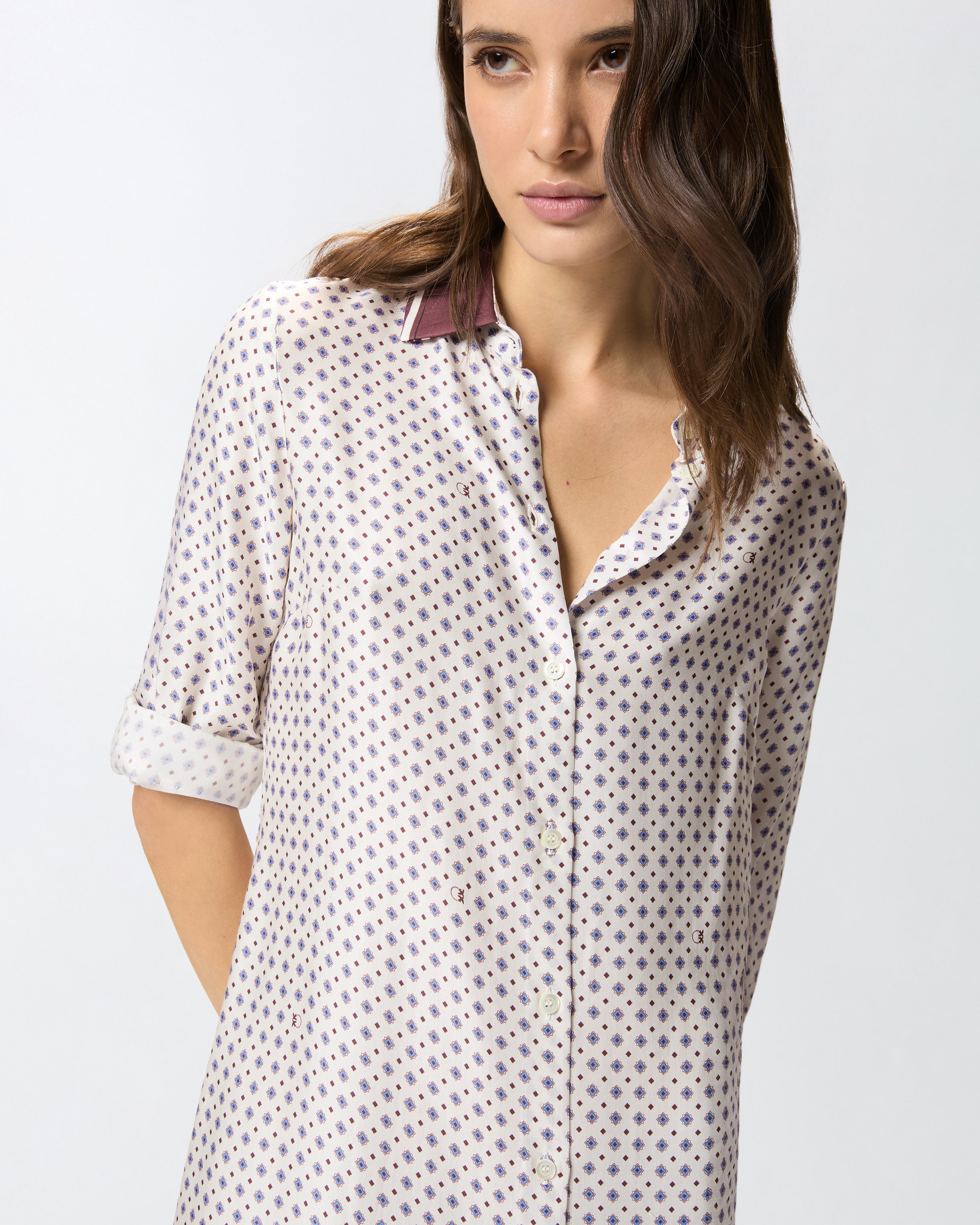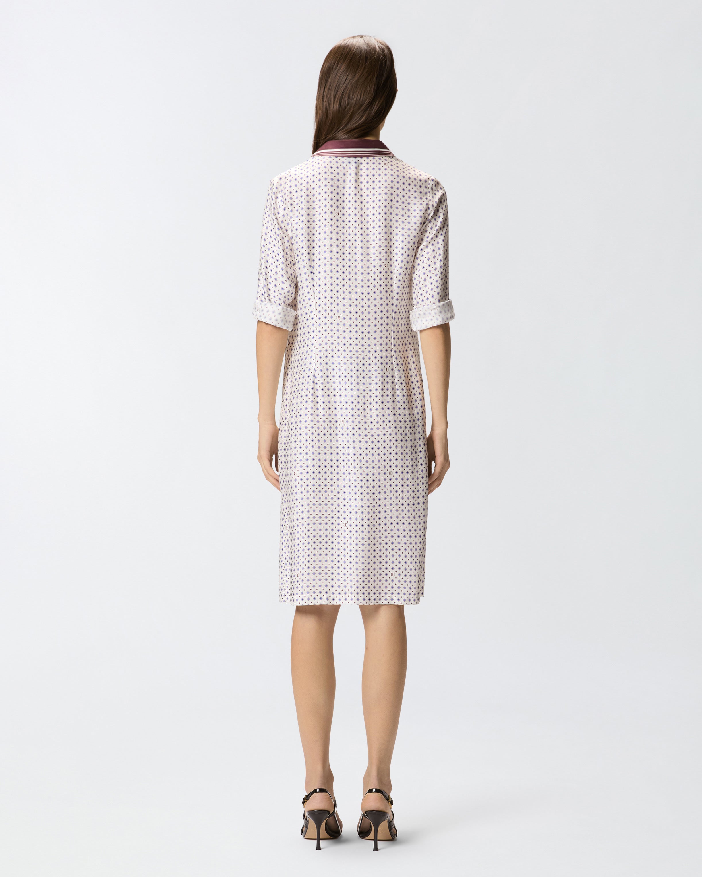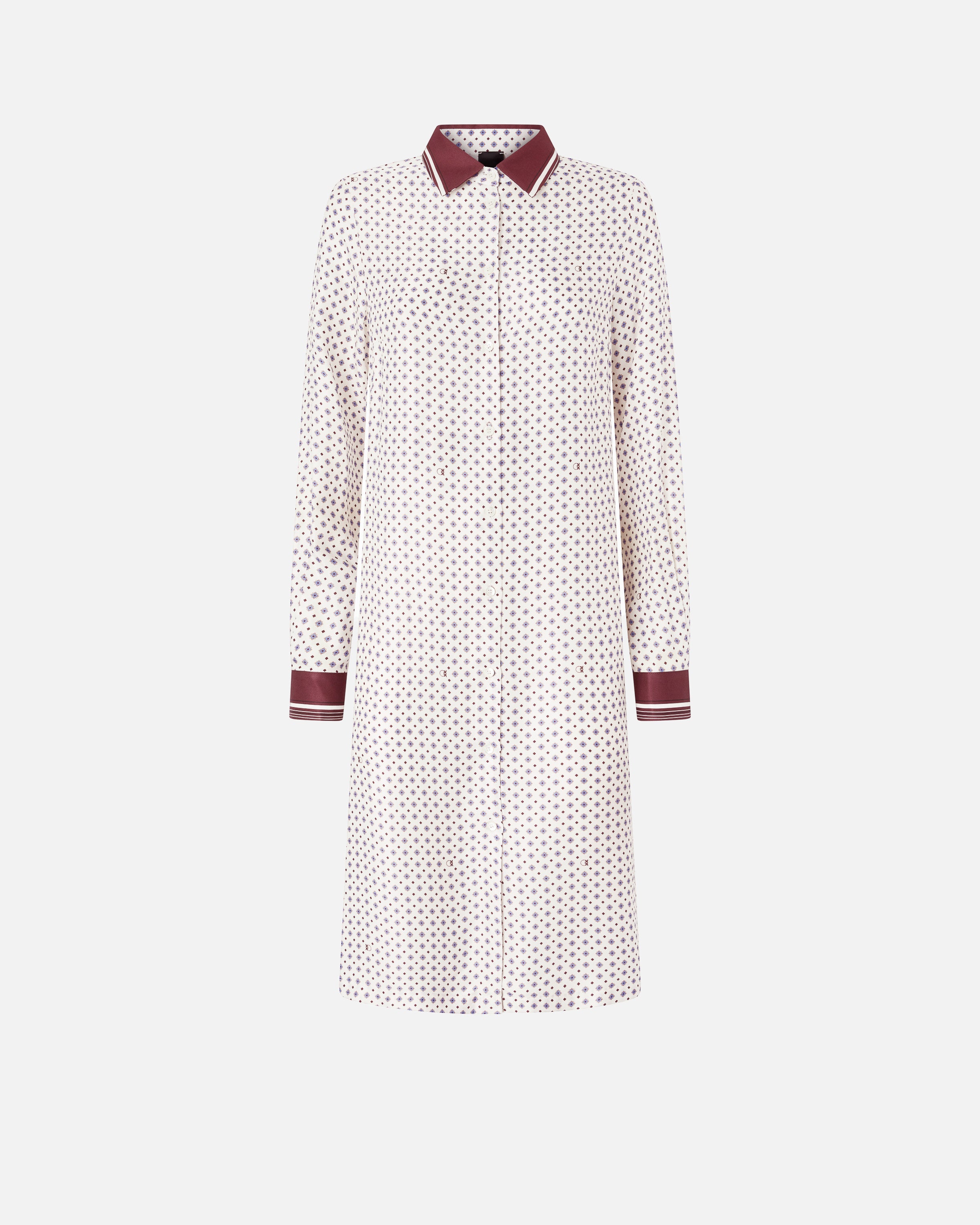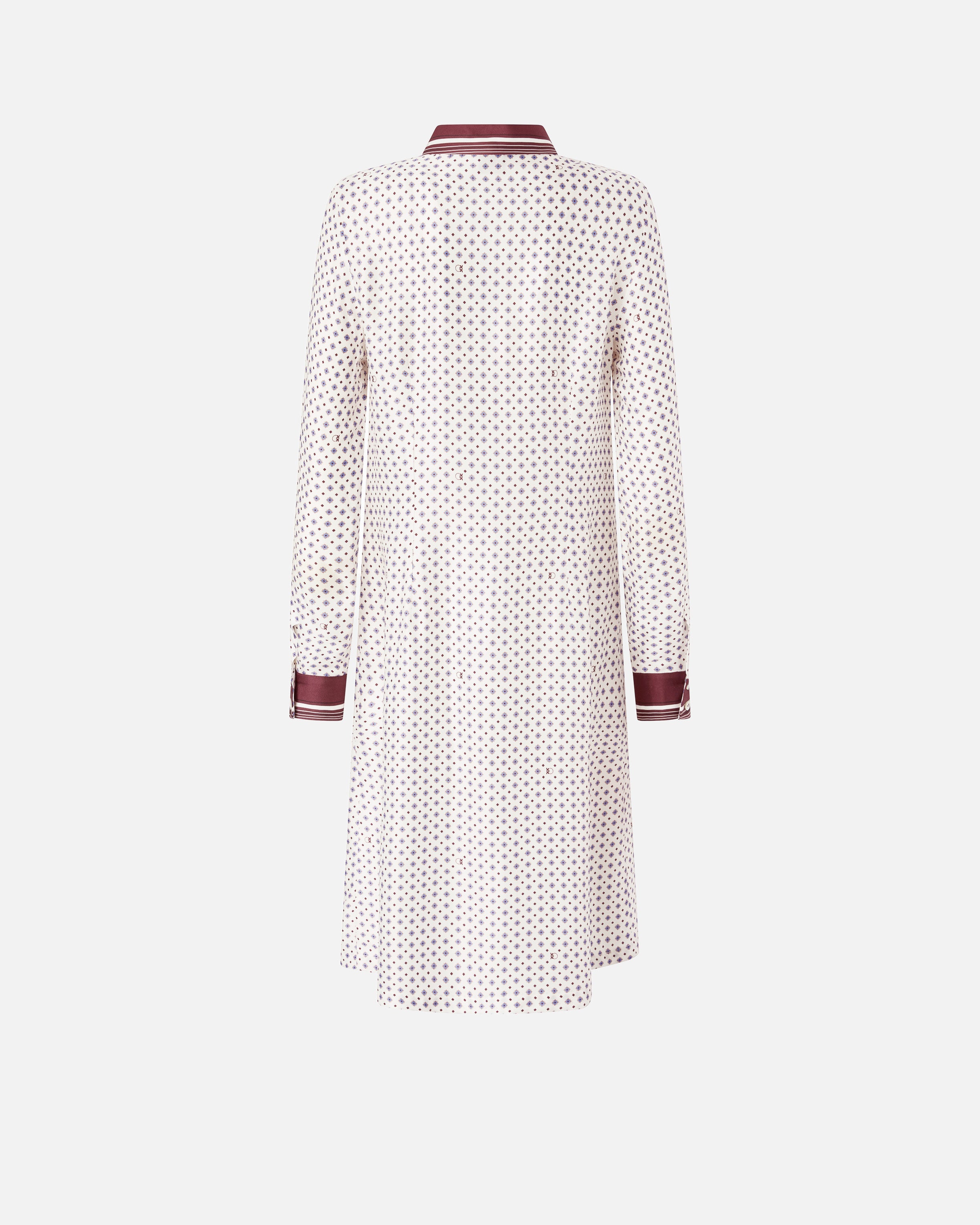 Abito midi dalla linea dritta ma scivolata, realizzato in twill di viscosa e dotato di colletto stile camicia, maniche lunghe con bottoni sui polsini e abbottonatura frontale. Il modello si caratterizza per la stampa d'ispirazione foulard con motivo cravatteria all over e per il colletto e i polsini a contrasto, rifiniti da un sottile motivo rigato. Questo vestito diventerà il tuo alleato ideale sia per un look da giorno femminile, con un paio di scarpe basse, sia per una serata speciale, con un paio di décolleté. - ELICIA ABITO