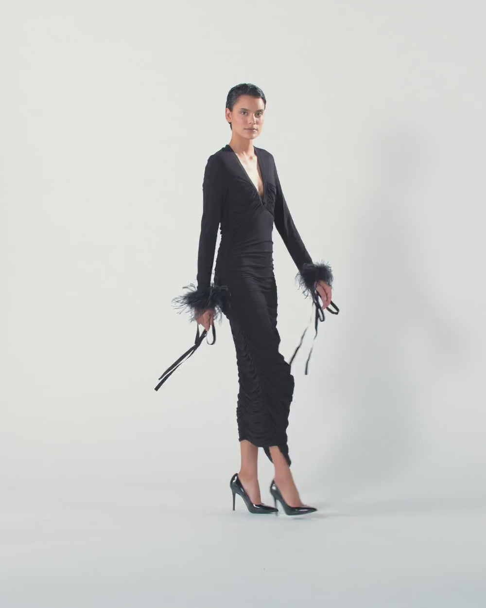 Vestito longuette elegante al ginocchio in jersey light caratterizzato da linea aderente e da un pronunciato scollo a V. La leggerezza del materiale permette di creare drappeggi e arricciature per una silhouette estremamente femminile e raffinata. Il focus del capo è sicuramente sui polsi, impreziositi da vere piume di struzzo staccabili con nastro gros grain, che oltre a donare un tocco di stile, diventano anche un vero e proprio gioiello da indossare al collo. Questo capo è destinato a diventare il tuo asso nella manica quando il dress code è di alto livello.