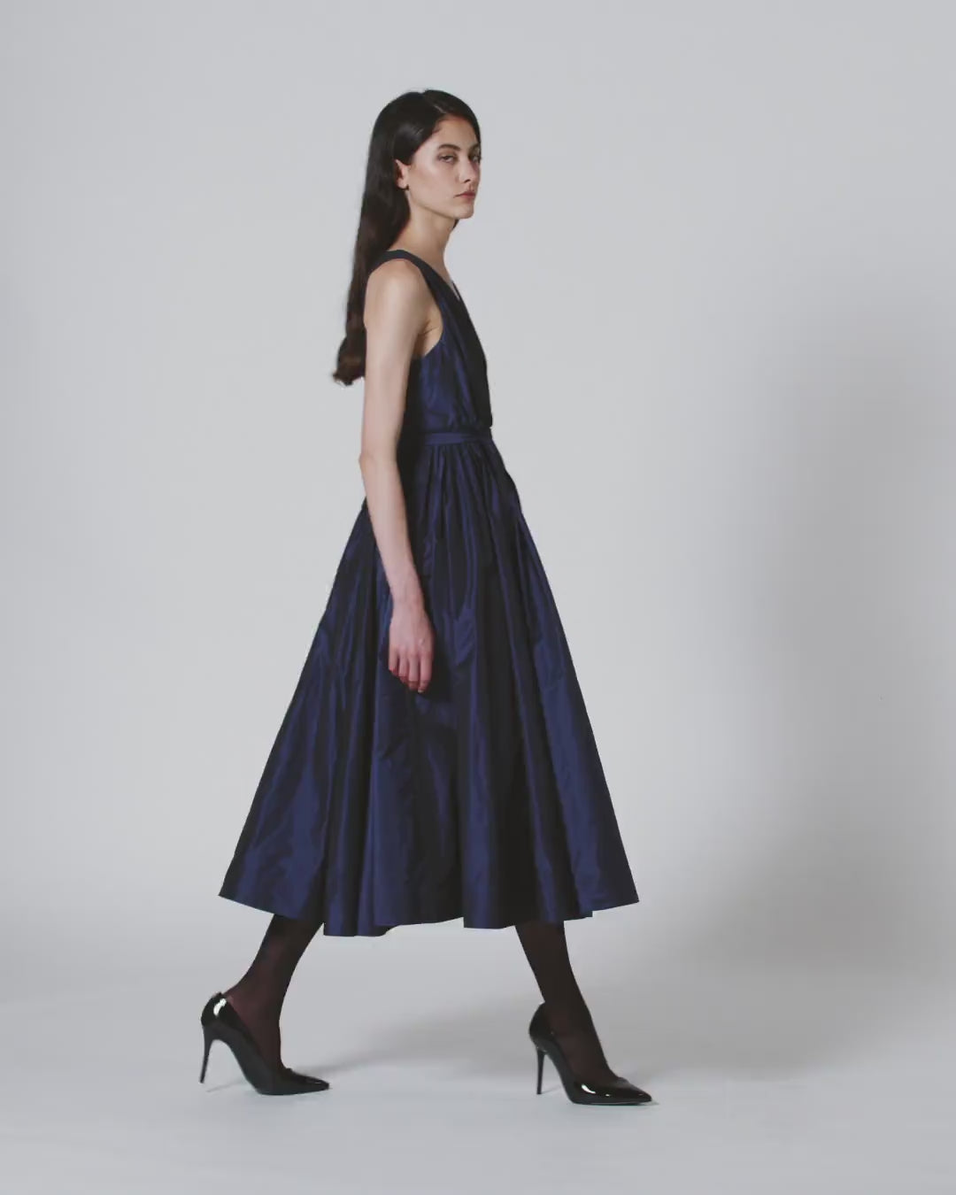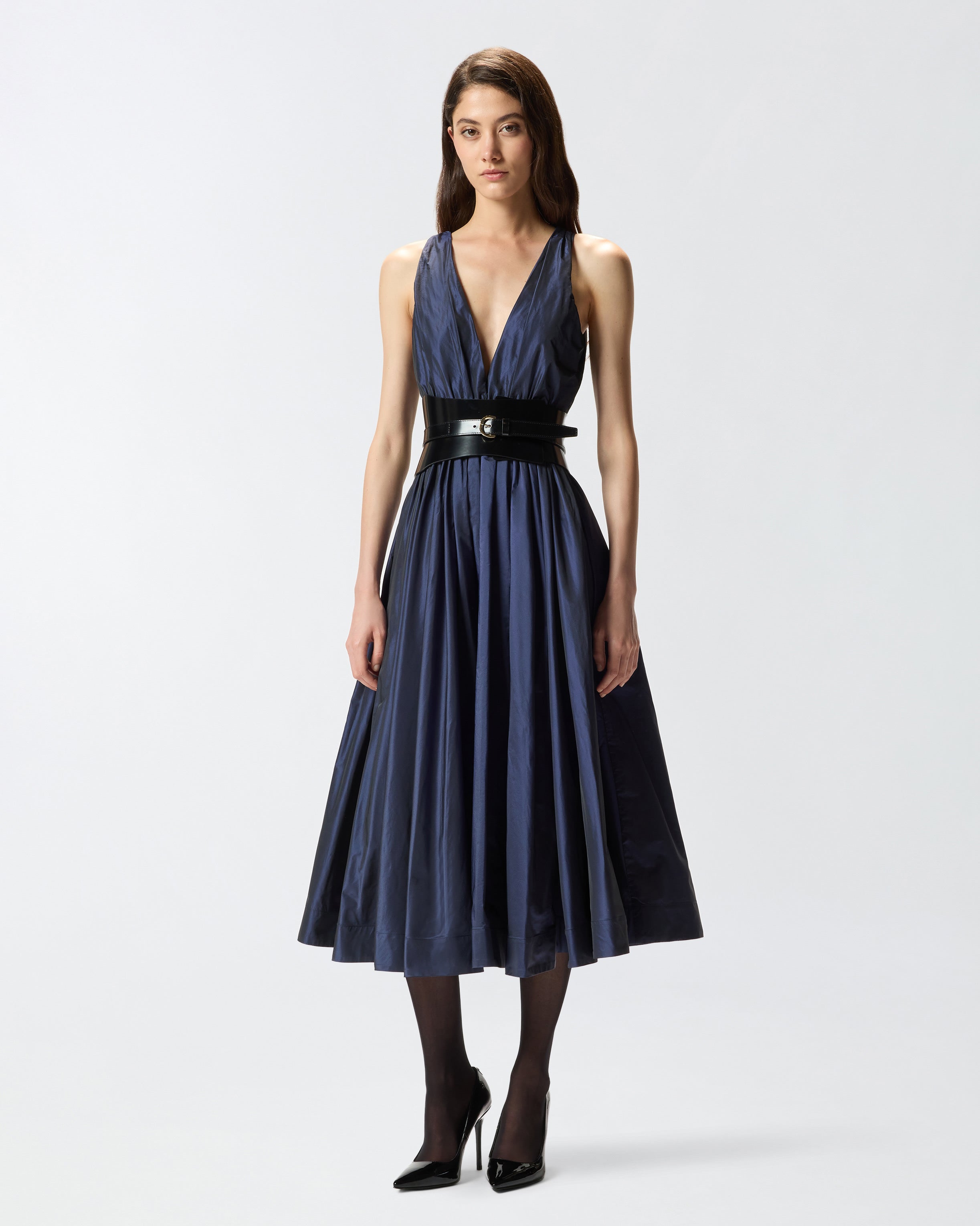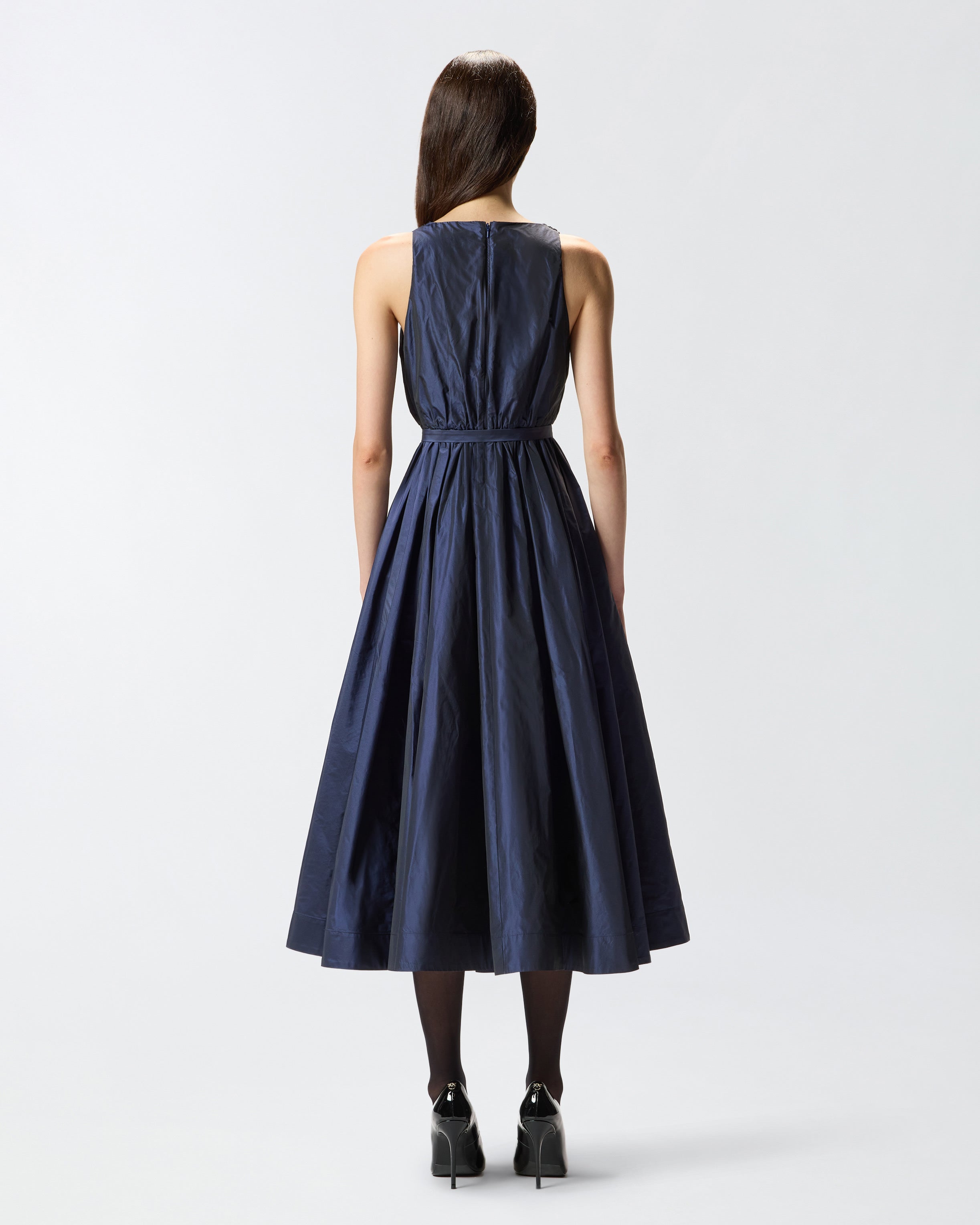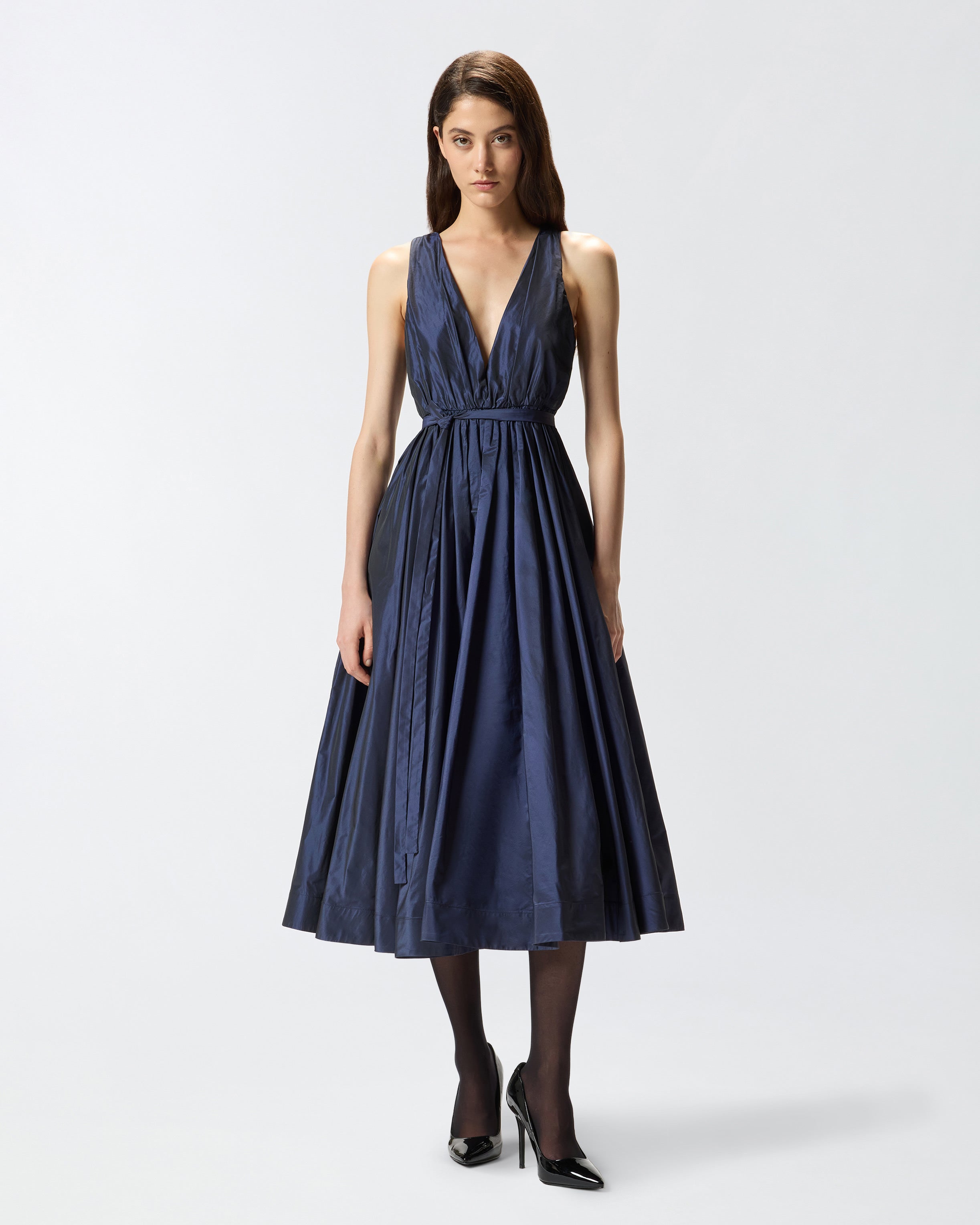 Abito lungo smanicato con scollo a V, segnato in vita da una cucitura e dalla cintura abbinata, completata da un fiocco femminile sul davanti. Il tessuto, leggero e lucente, crea dei riflessi cangianti e si sposa alla perfezione con il volume morbido e dinamico che contraddistingue il capo. Indossa questo modello da sogno e diventa protagonista di tutte le occasioni più speciali.