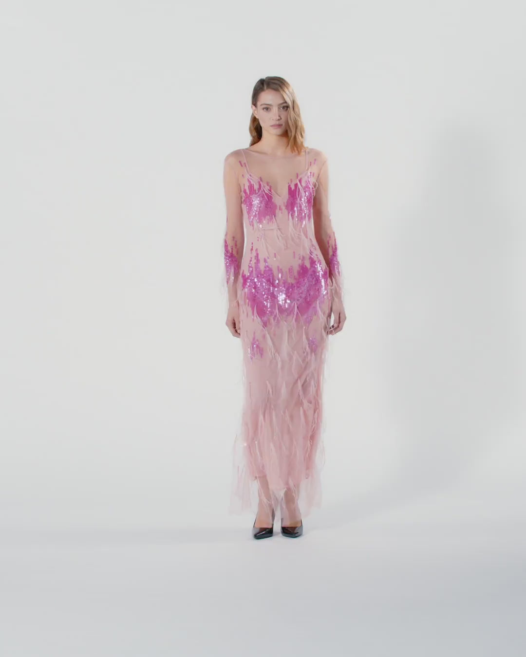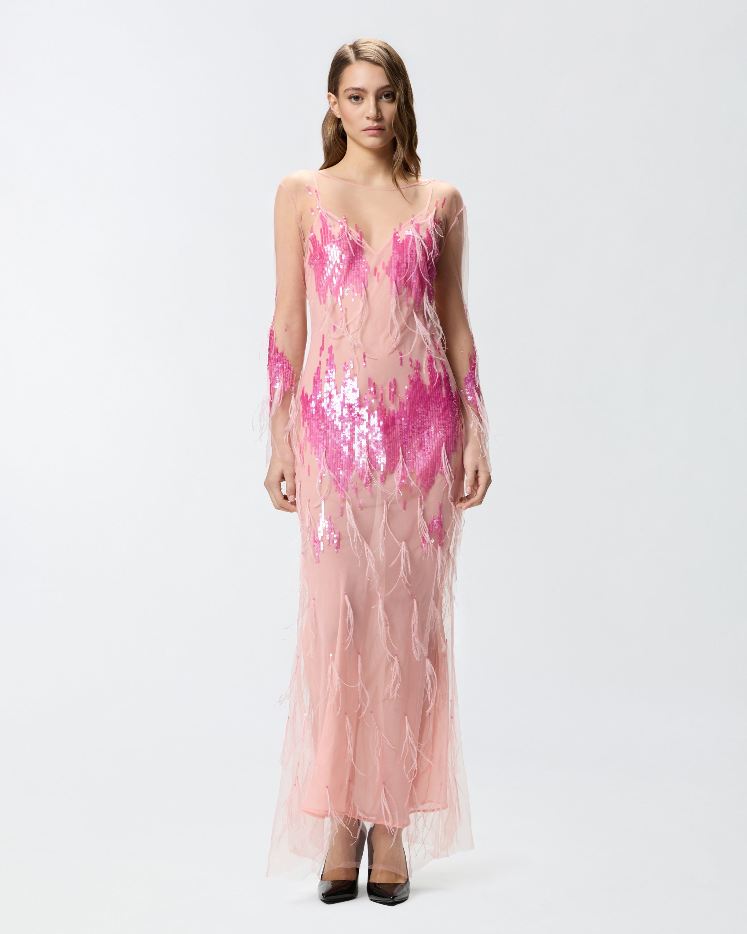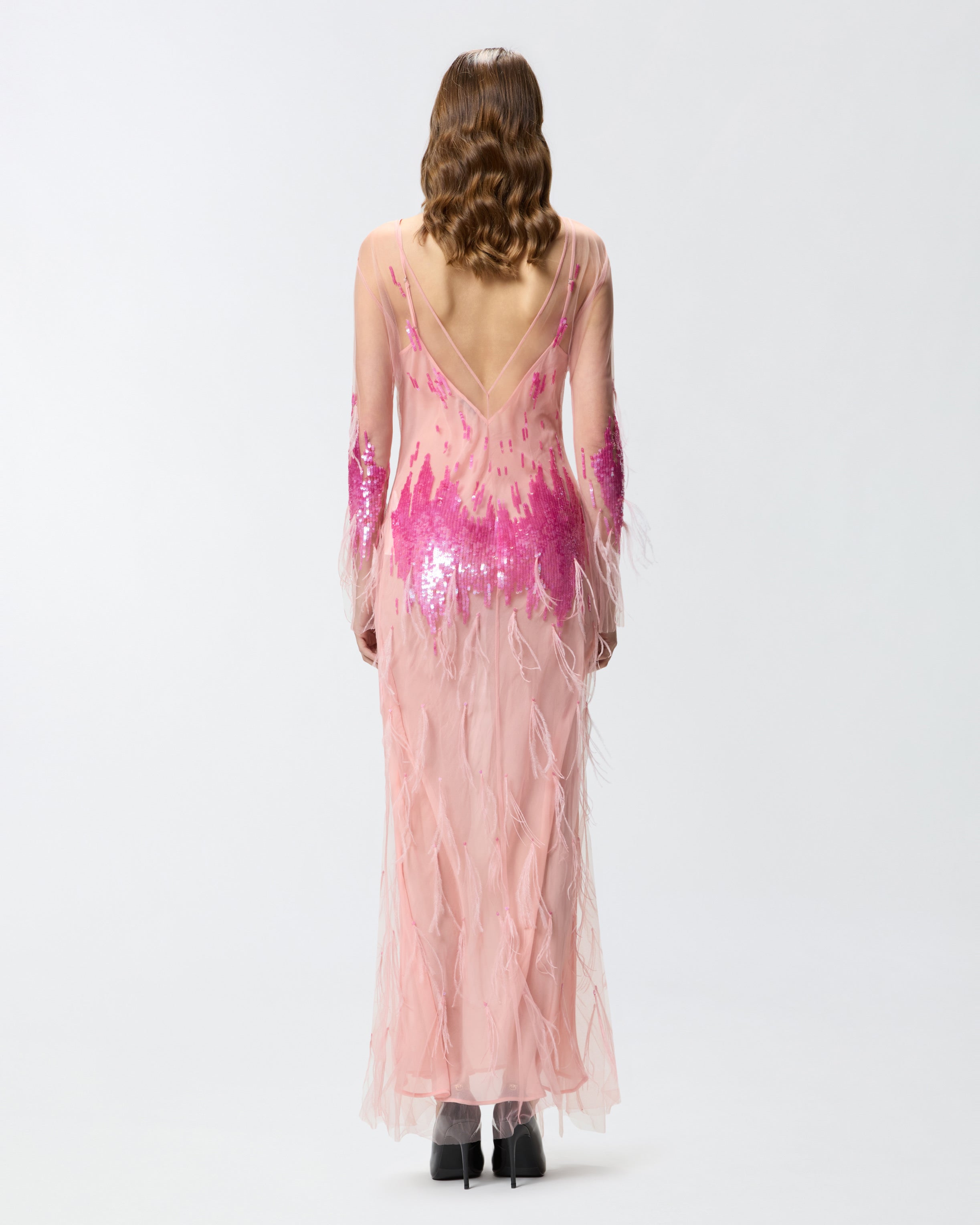 Vestito lungo e aderente dall'attitude couture, realizzato in tulle e caratterizzato da maniche lunghe e scollo a V. Il design è impreziosito da paillettes ricamate a mano e inserti in piume per un look da vera star. Il ricamo di paillettes, di diverse sfumature e disposte in un raffinato effetto dégradé, adorna la superficie creando un gioco di colori e riflessi cangianti. La lavorazione artigianale esalta la silhouette, avvolgendo il corpo con eleganza, e il gioco di texture tra paillettes e piume aggiunge un tocco di lusso e femminilità. Completo di fodera a sottoveste per attenuare l'effetto trasparente del tulle.